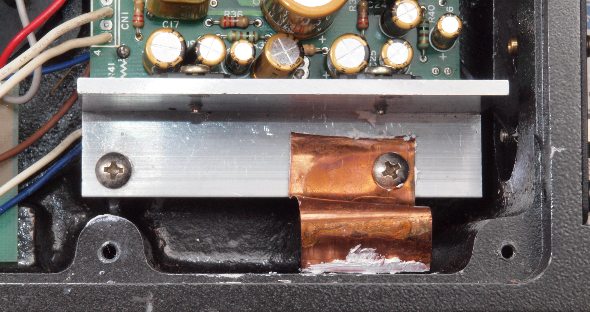 | C92. 修理中 RY−5500U 下蓋を取り、下から見る。放熱器をケースに熱接触させる。 | ||||||||||||||||||||||||||||||||||||||||||||||