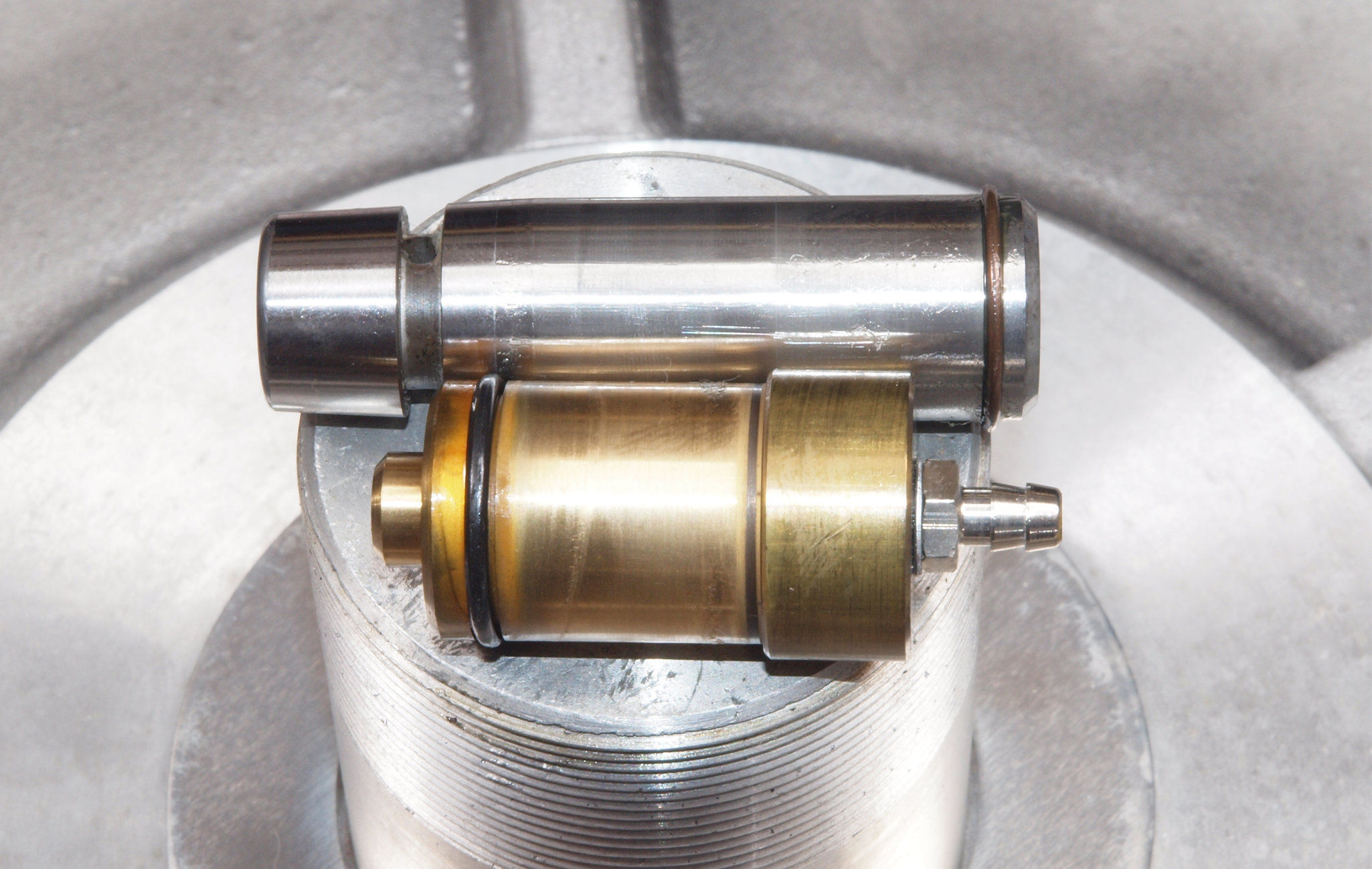 | M. RB−1500修理状況。 画像をクリックすると、大きく(横幅2050ドット)表示されます。 M1. 軸の取り出し。左側ホース配管継手の穴の中にバネの残骸が見える。 |