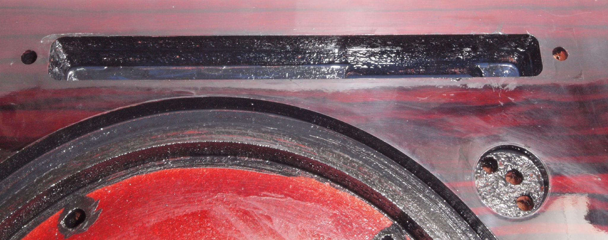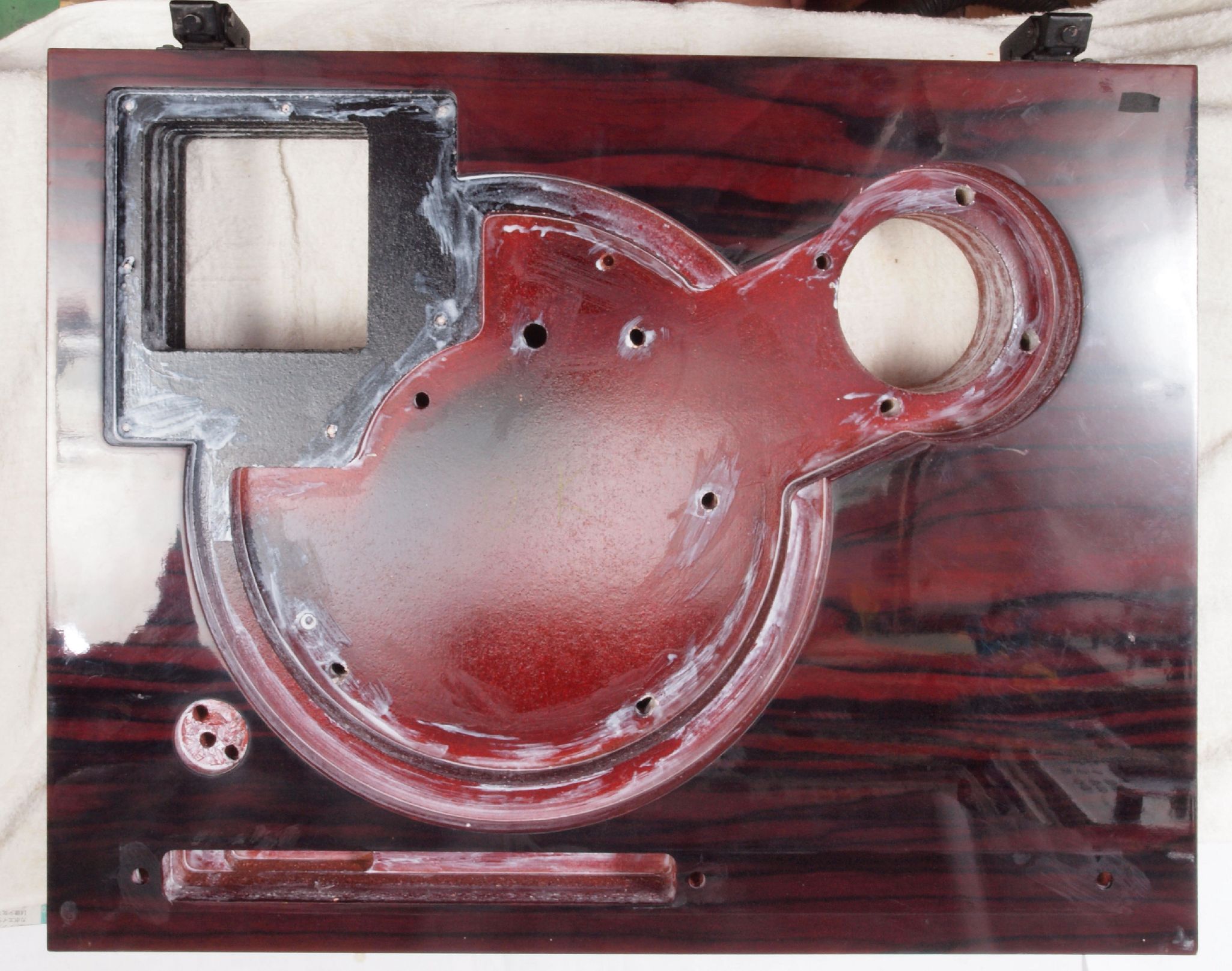 W77. 修理後 下蓋のトランスカバー取り付穴。 乾燥後さらにペンキを塗る。