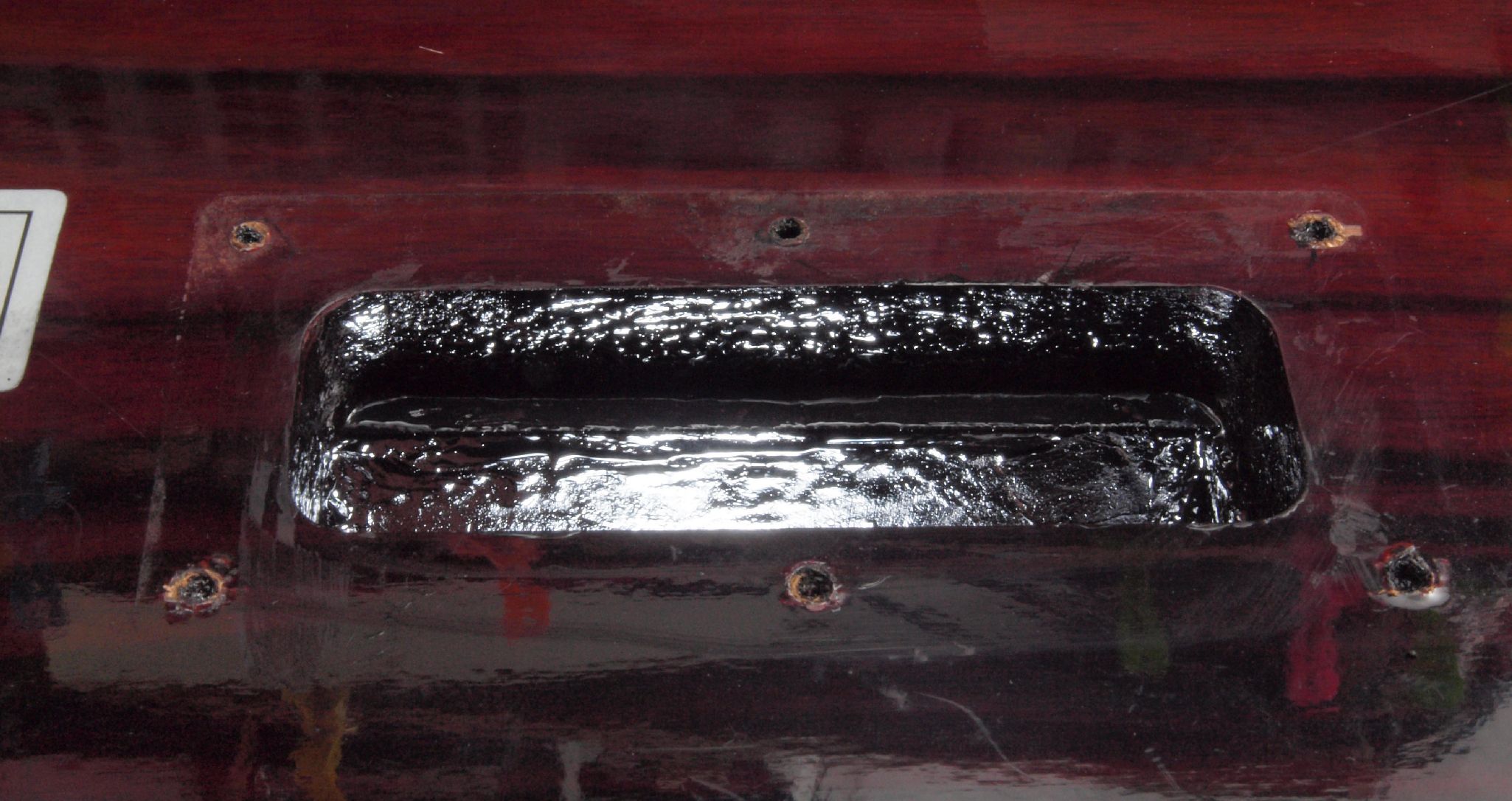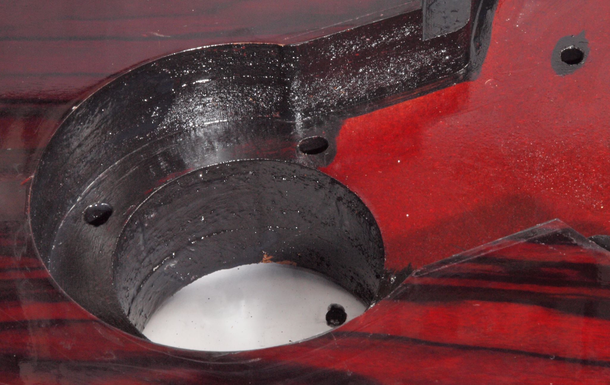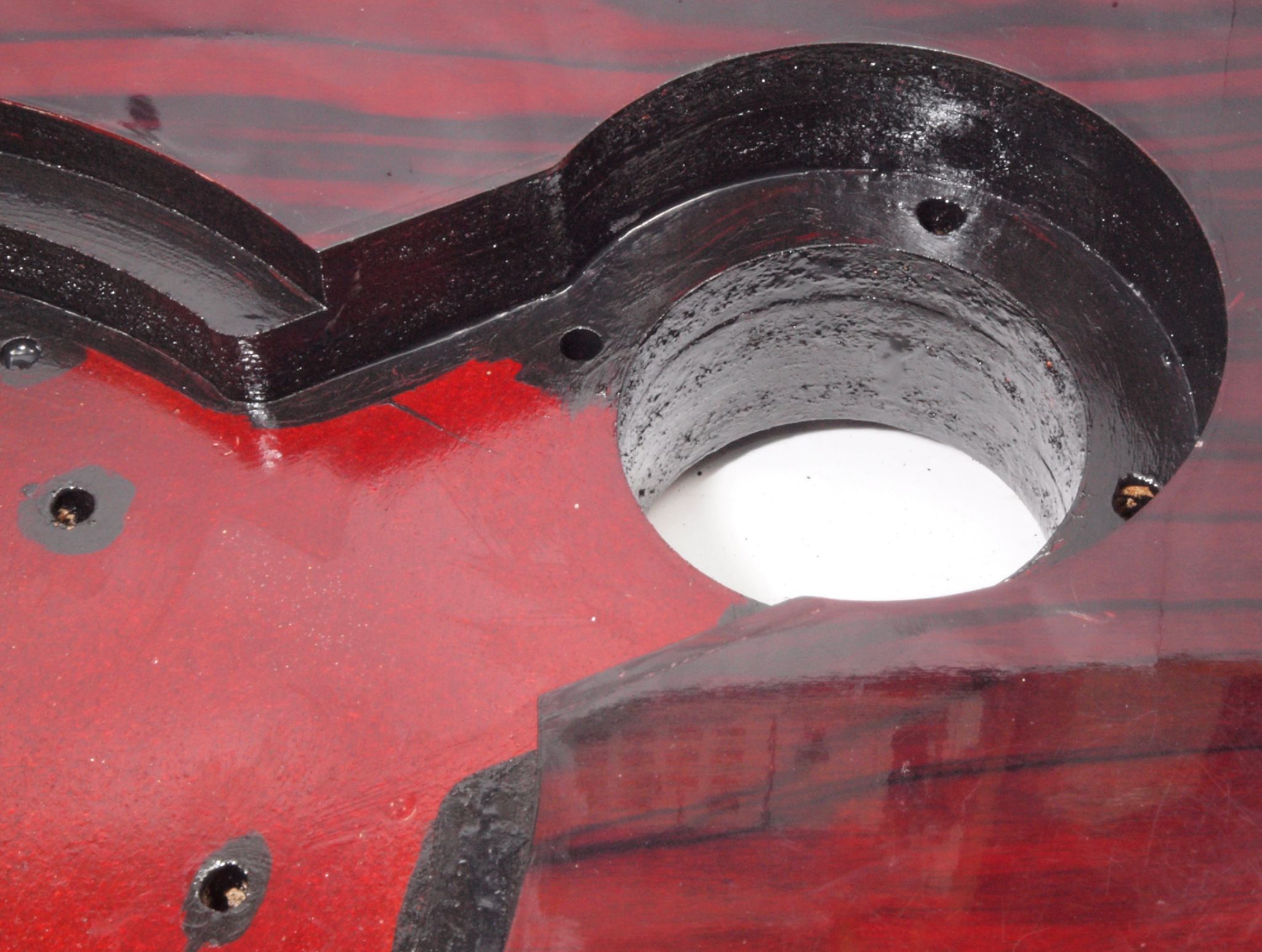 WA3. 修理後 下蓋のアーム取り付穴。 乾燥後さらにペンキを塗る。