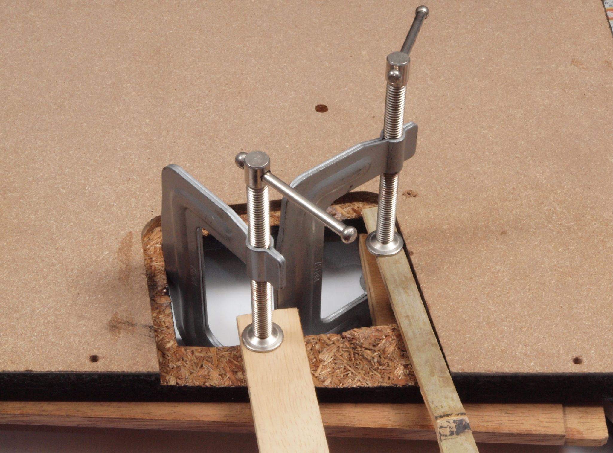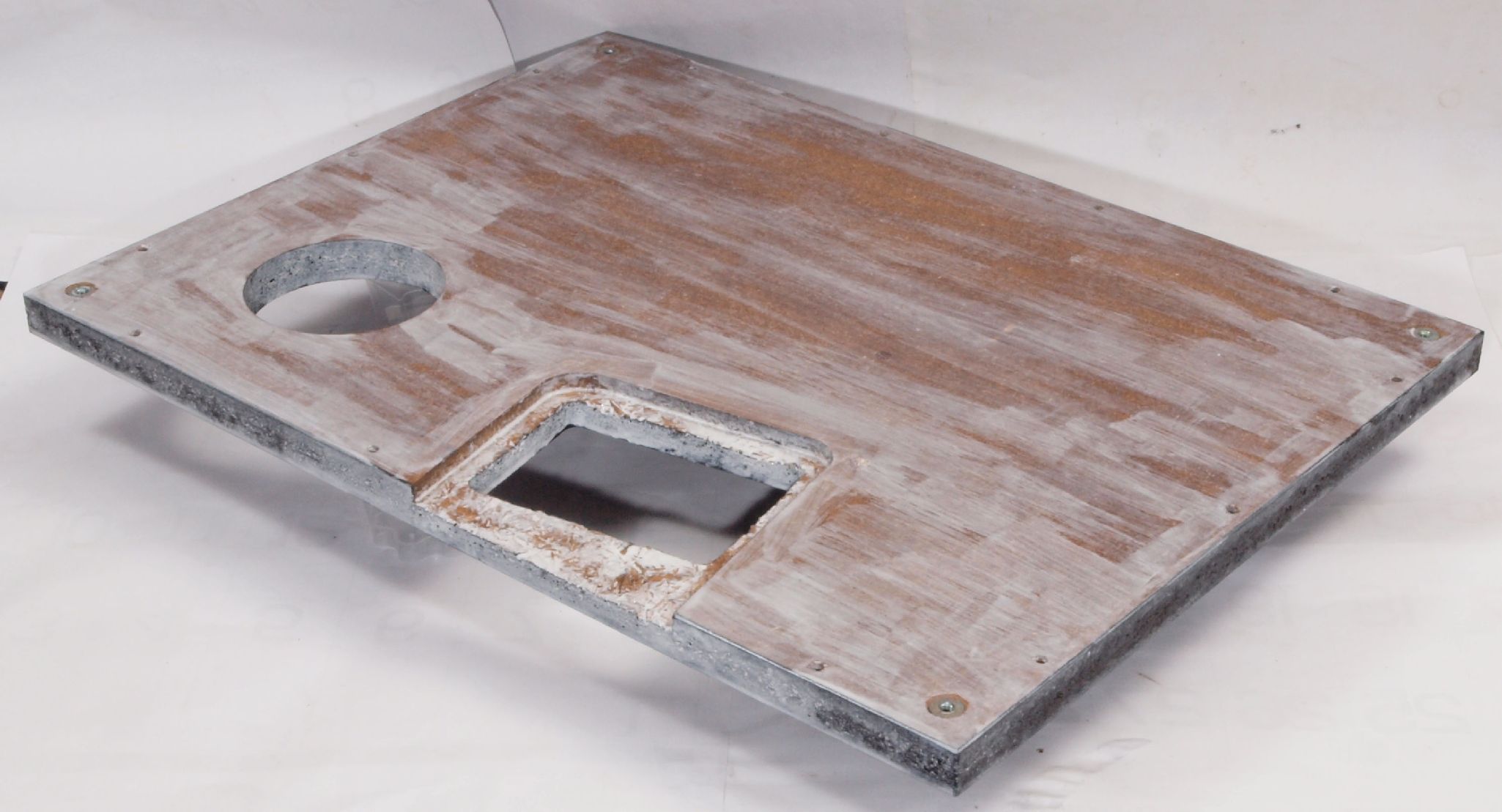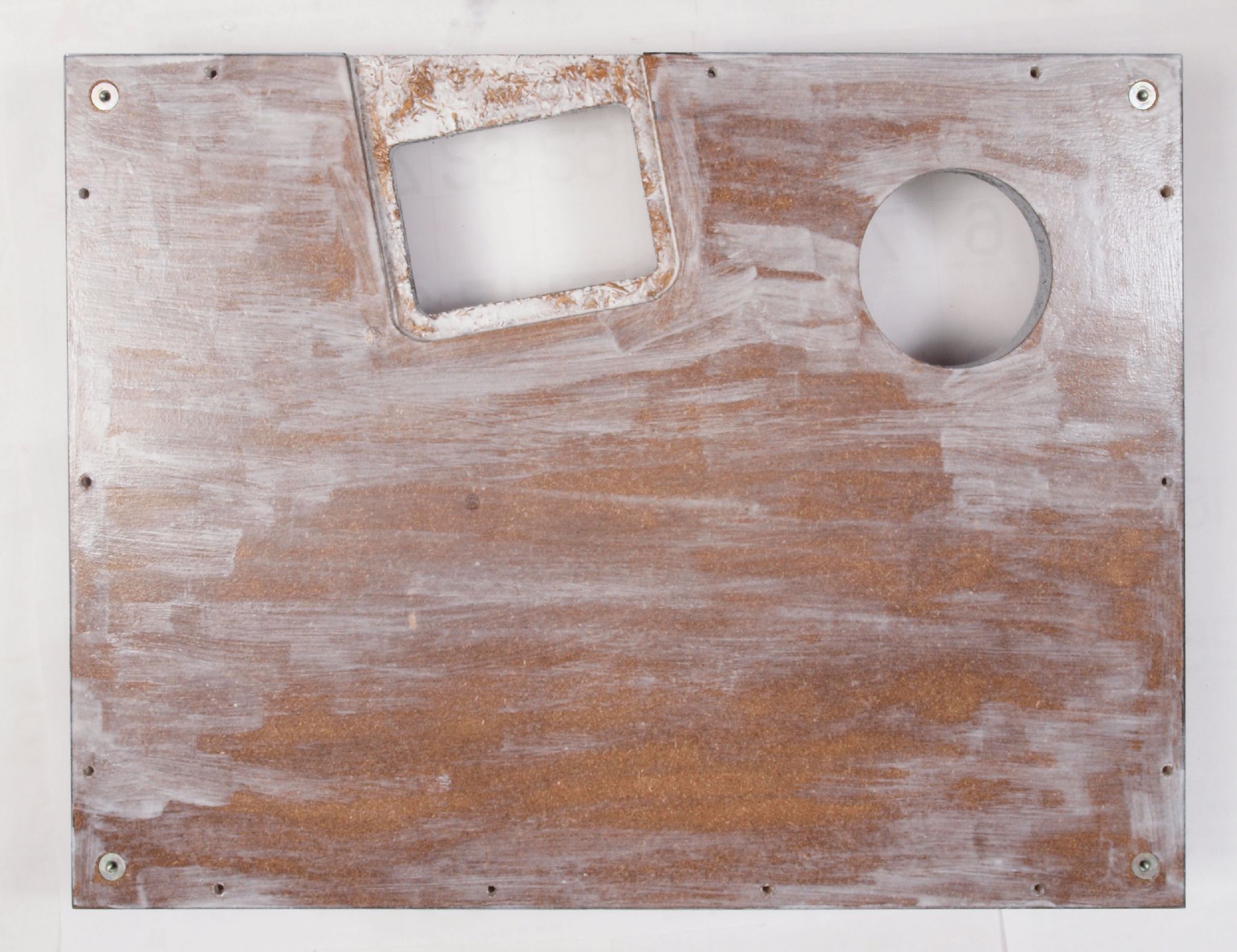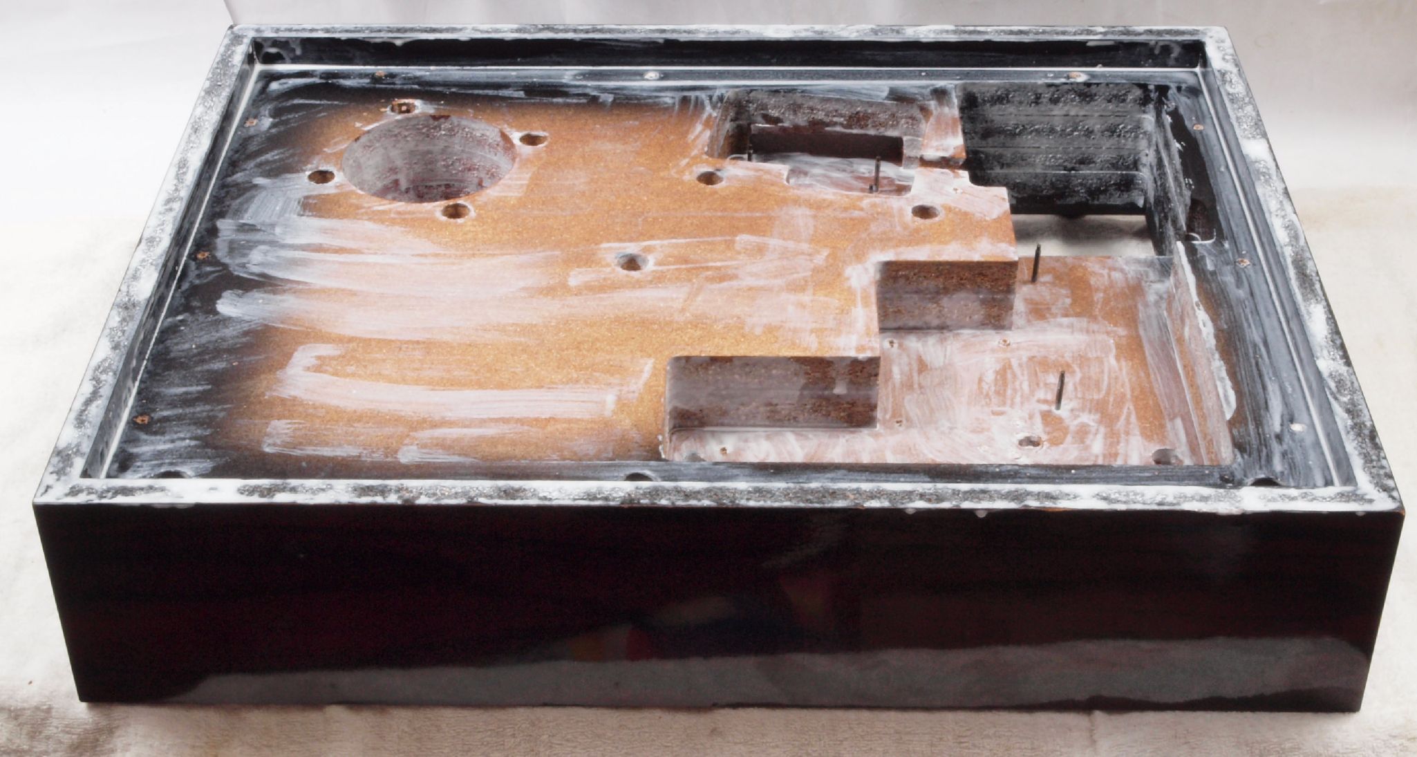 W42. 修理中 本体木枠下前。 圧縮材にボンドを染みこませる、ネジ穴も塗る。