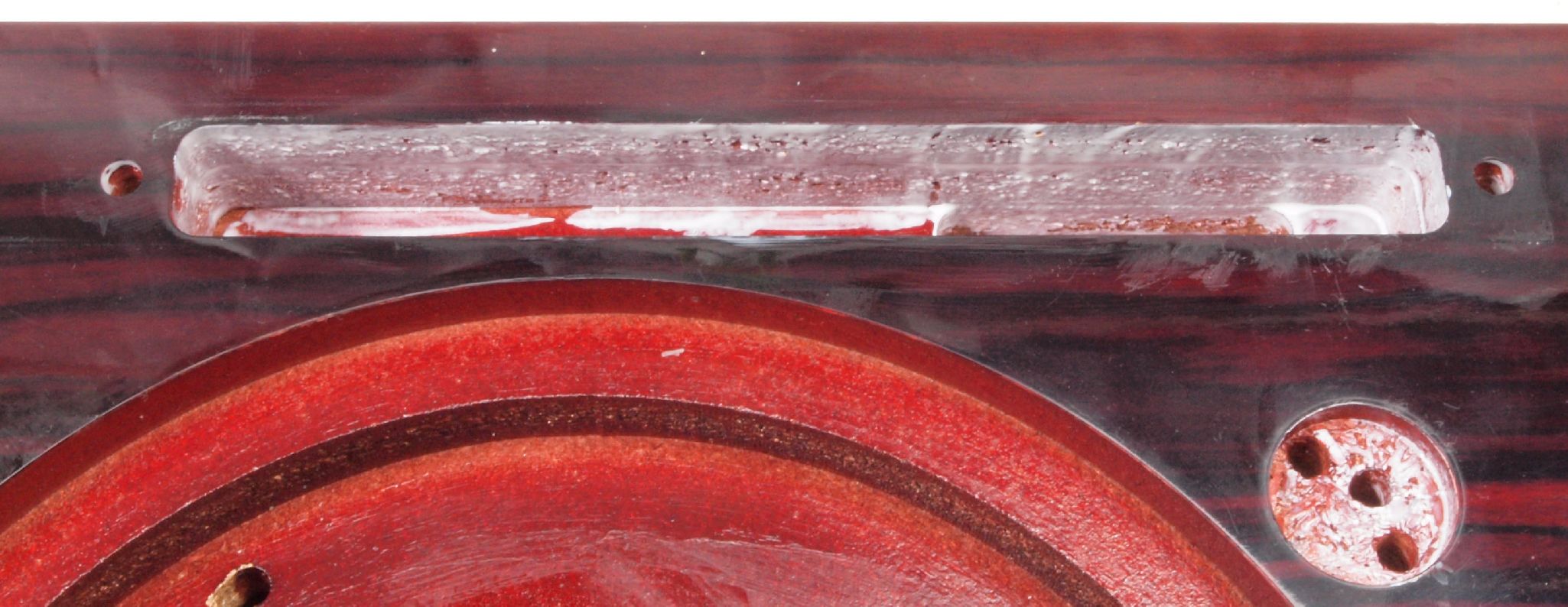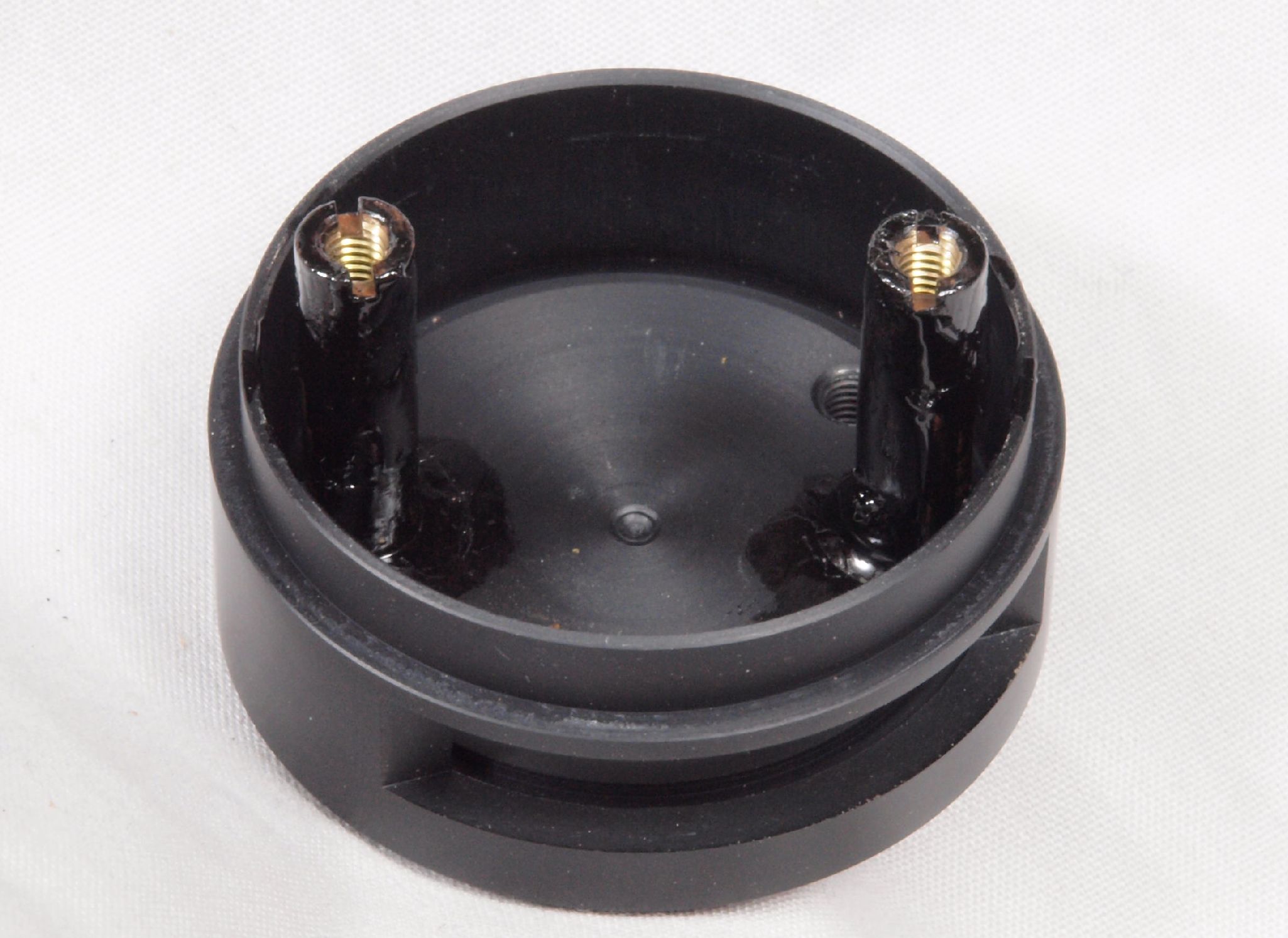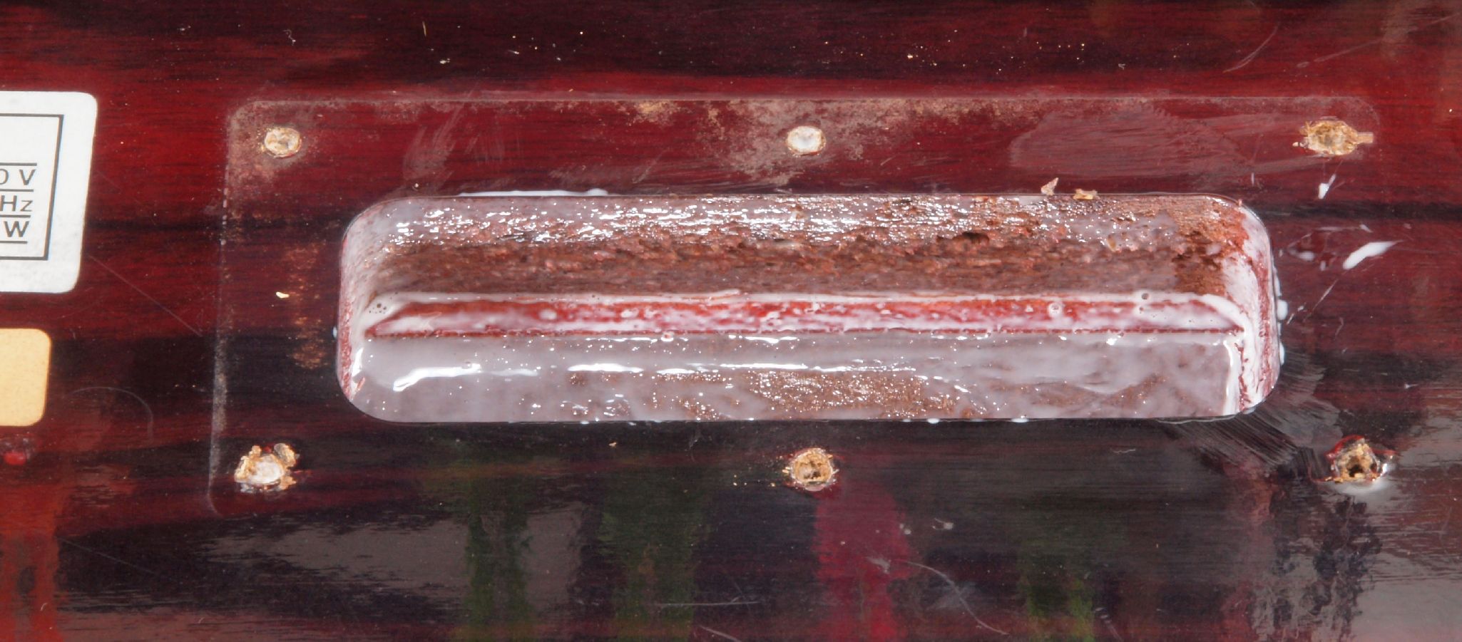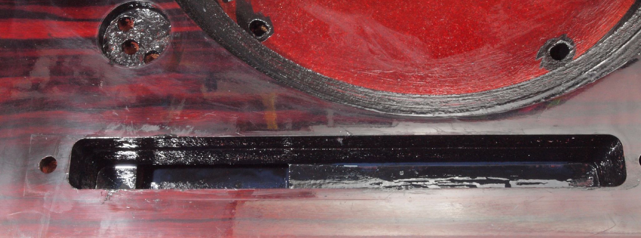 W76. 修理中 下蓋のトランスカバー取り付穴。ボンドを染みこませる、ネジ穴も塗る。