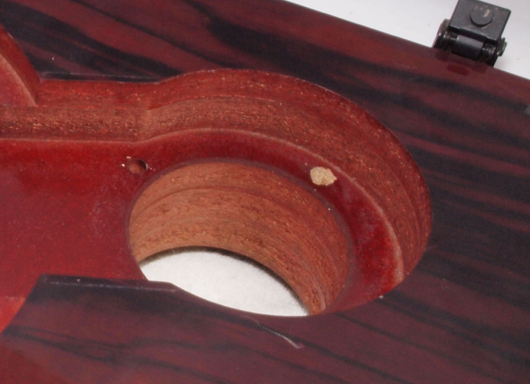 WA5. 修理中 下蓋のアーム取り付穴、反対側。ボンドを染みこませる、ネジ穴も塗る。