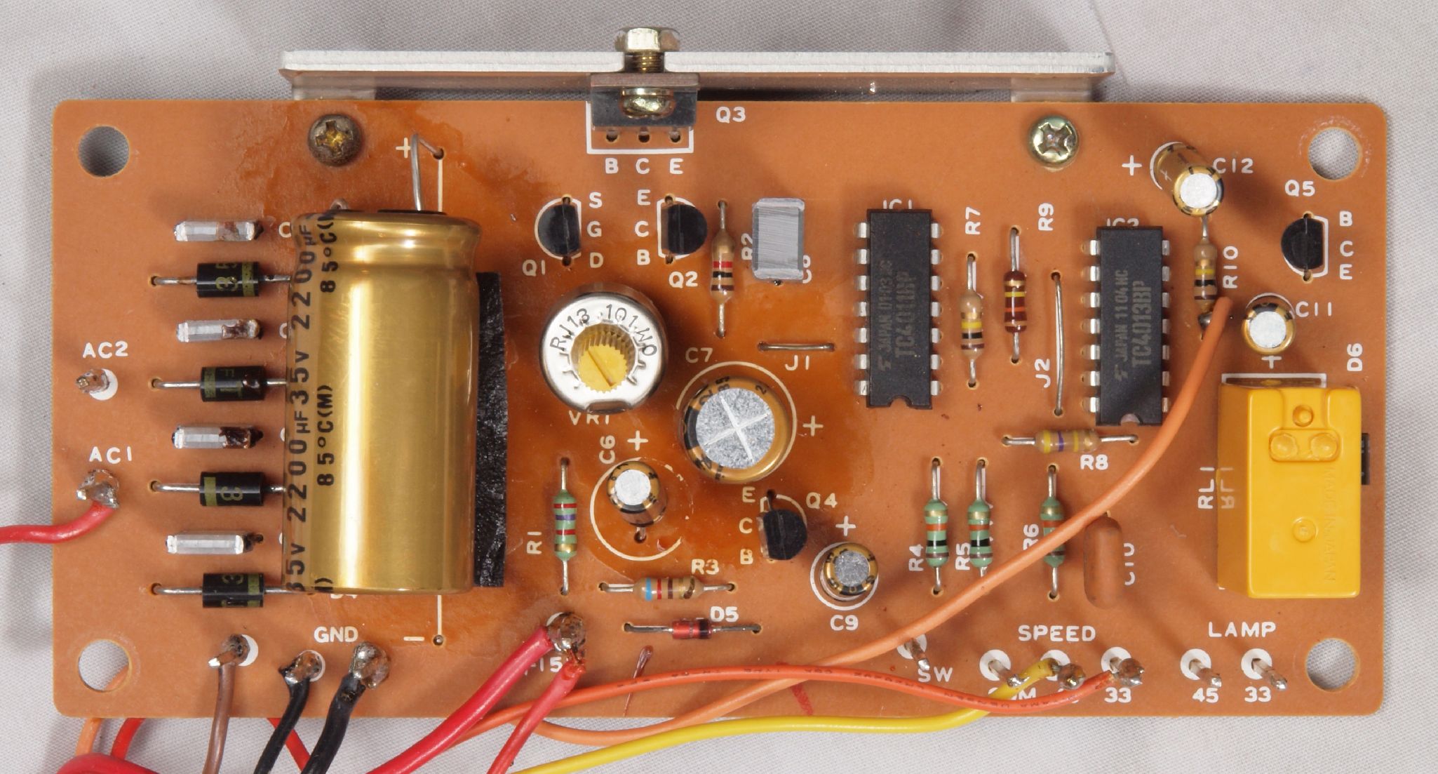 C22. 修理後 電源・33/45切替基板。 IC2個、半固定VR1個、電解コンデンサー6個、リレー1個交換