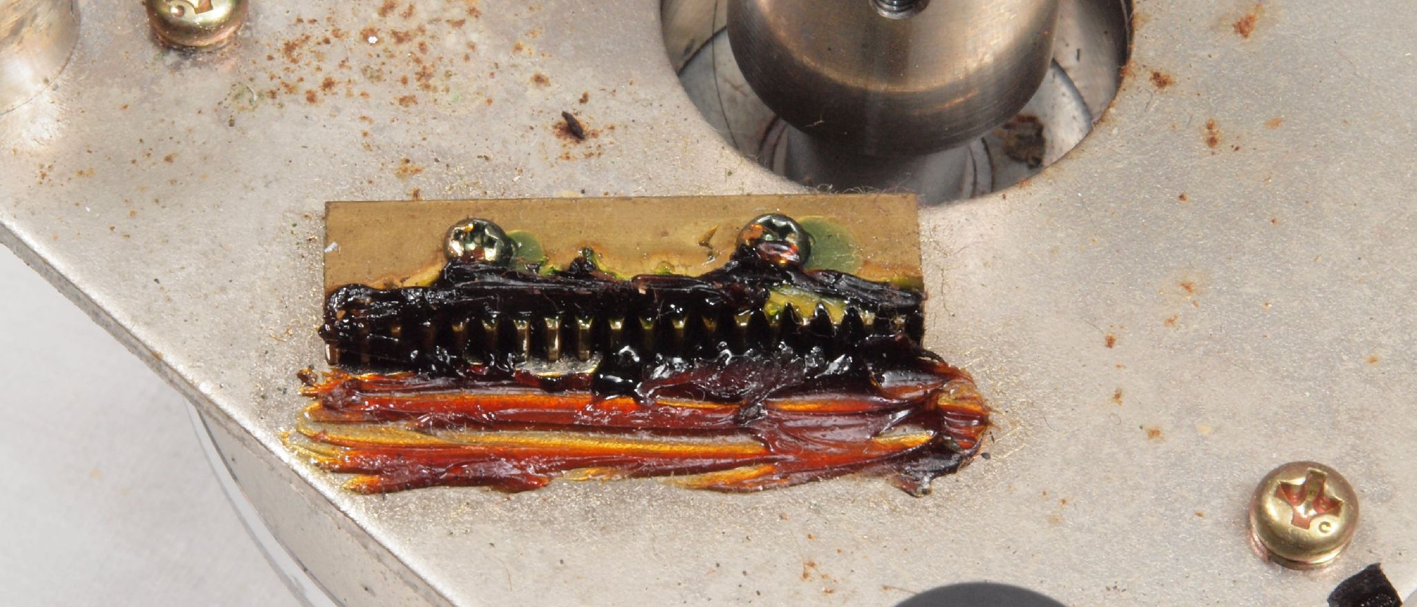 C37. 修理中 ストロボ表示器取出、分解。 固定ビスにサビが発生。