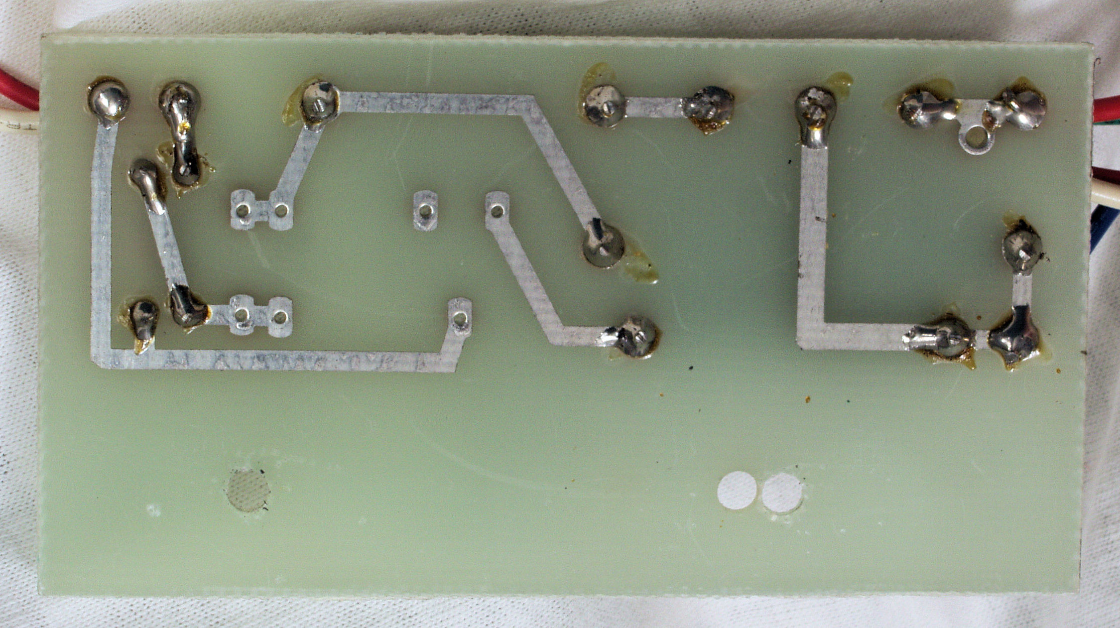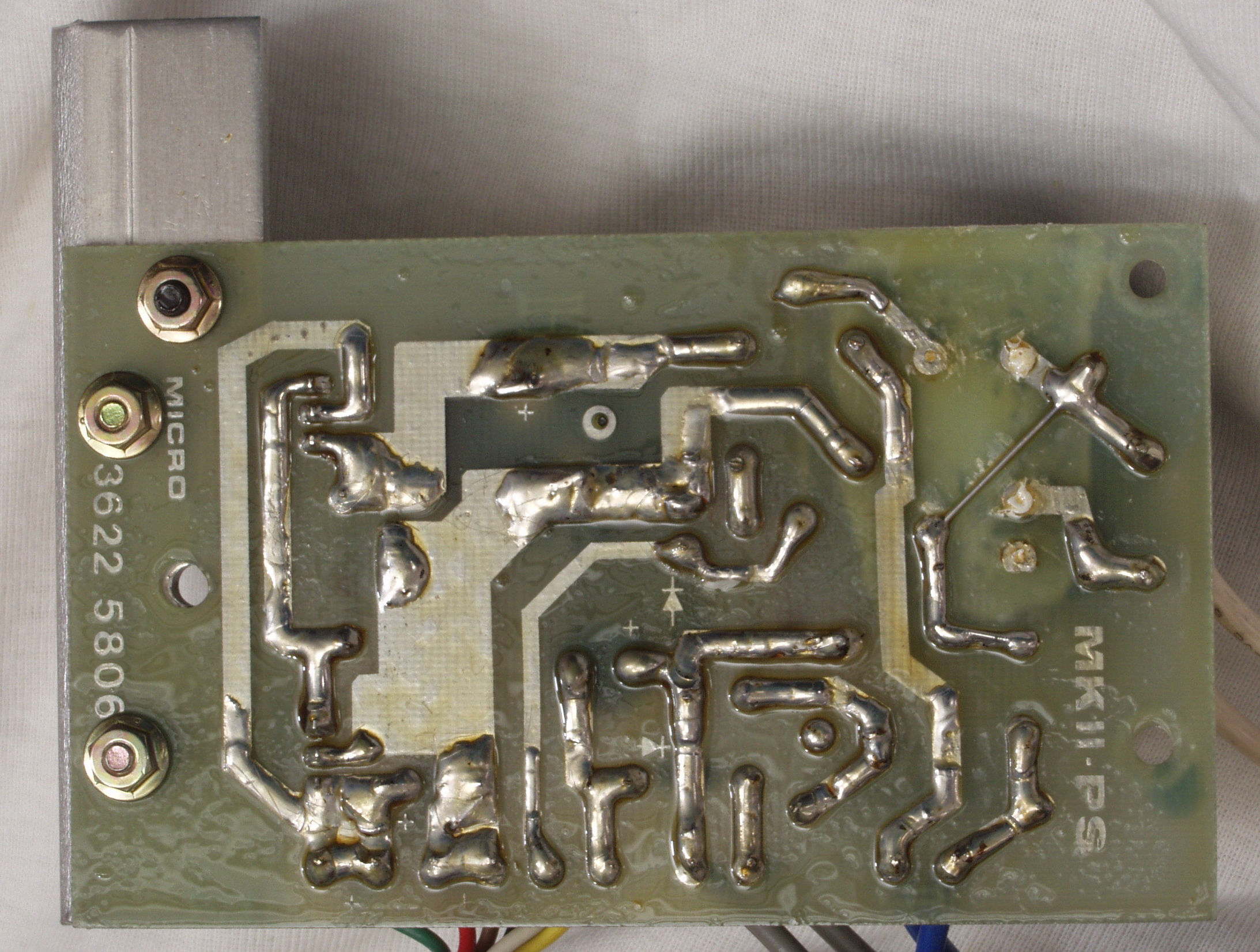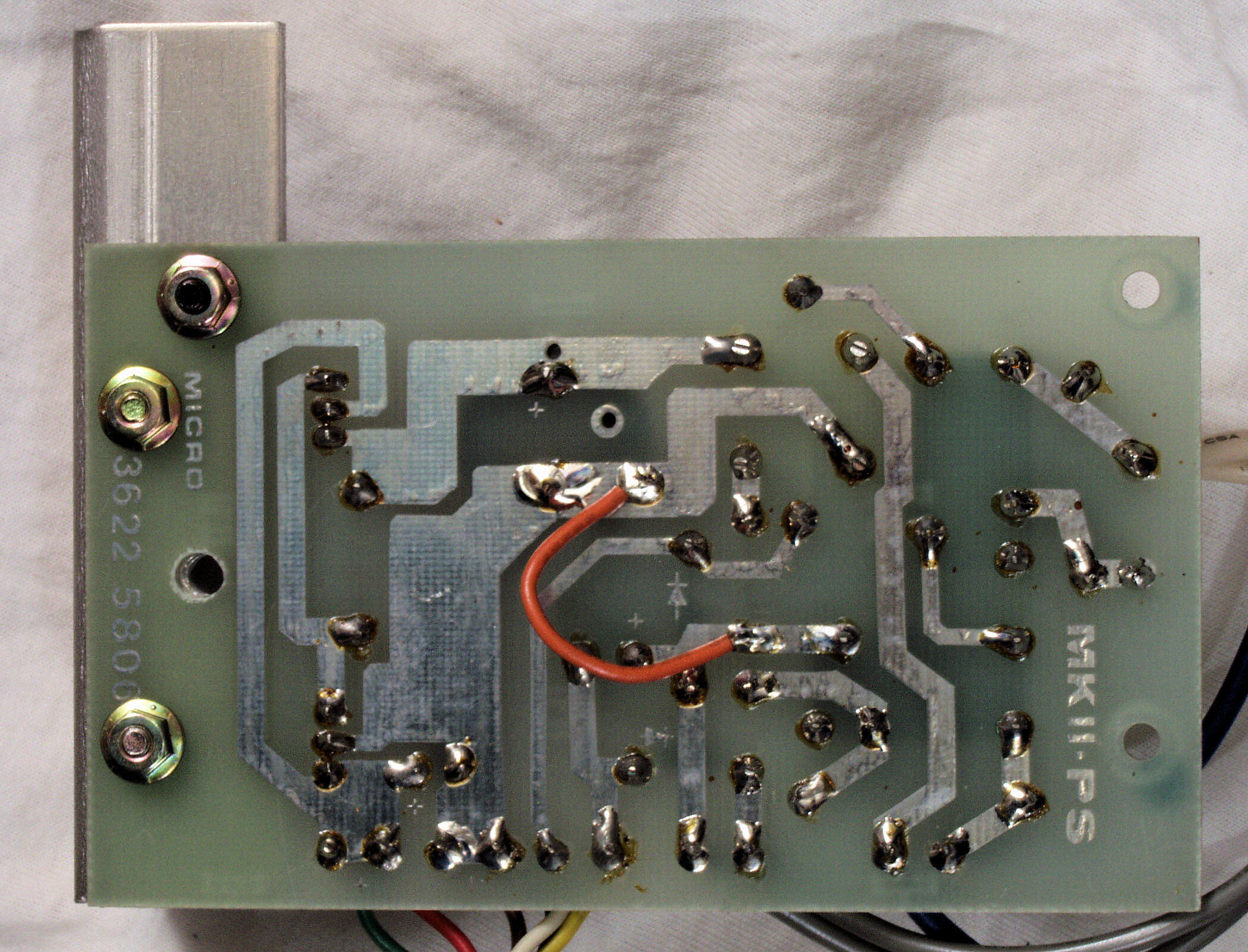 C15. 完成RY−5500U電源部整流基板裏。余分なフラックスを落として、コート液を塗る。