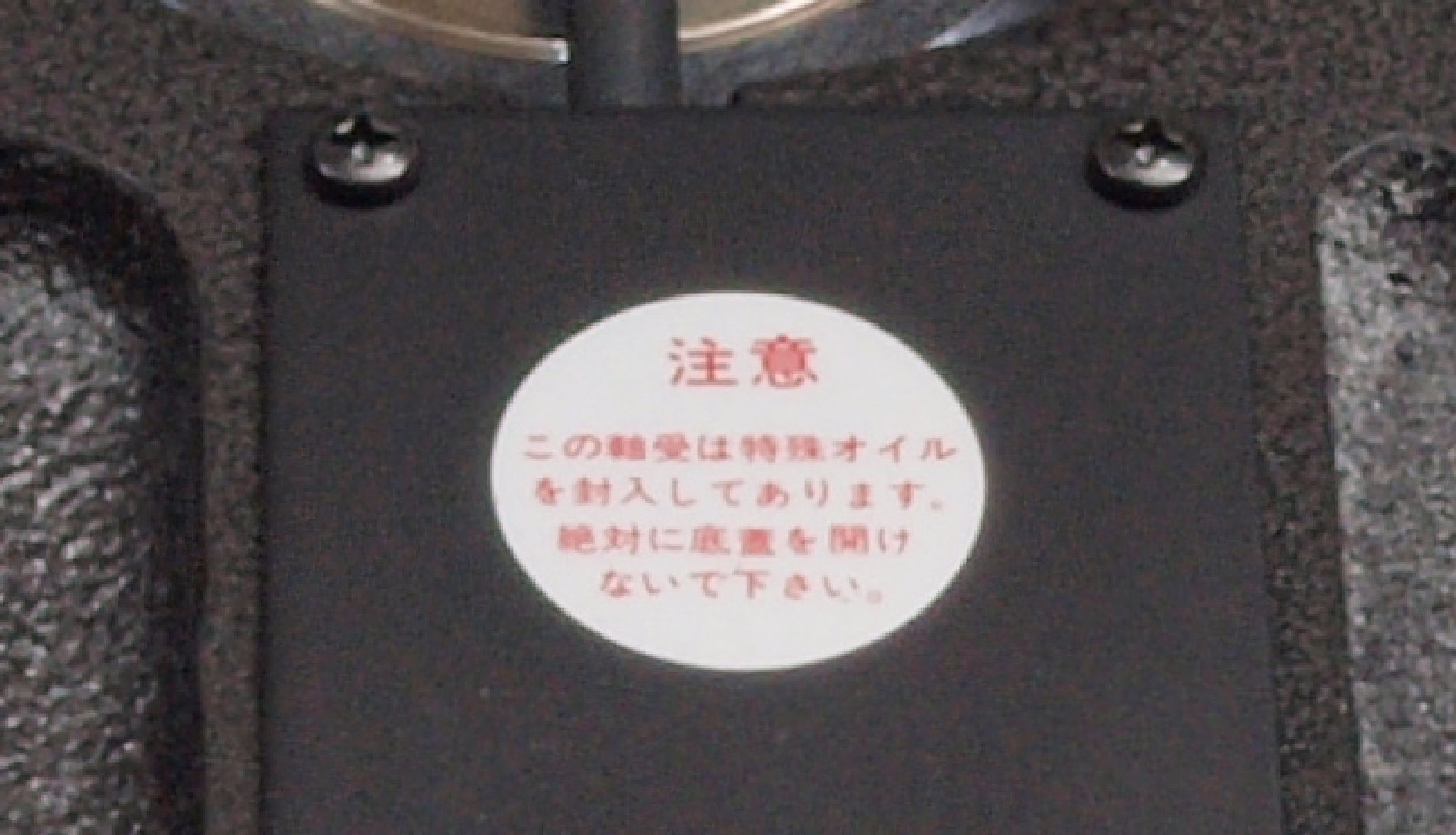 T12. 修理前 製造メーカーの「注意」の標識。 既にオイルが劣化しているので無視!