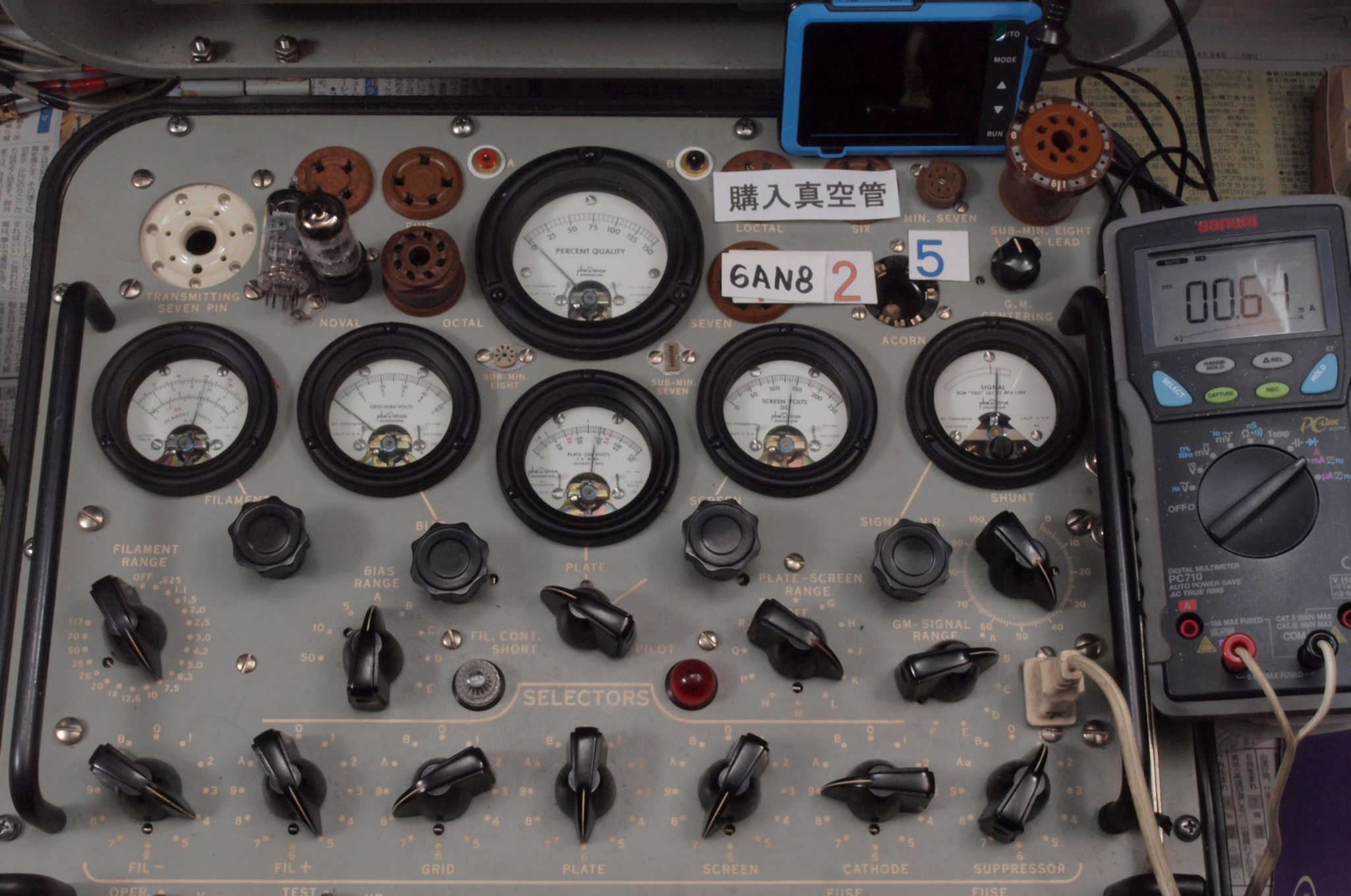 | A11. 付属真空管 6AN8 三極部。 Gm測定=5500μmho、Ip=20.4mA。 測定条件、「Ep=Esg=125V、Eg1=−2V、Ip=15mA」、Cレンジ=7500μmhoレンジでの測定。 |