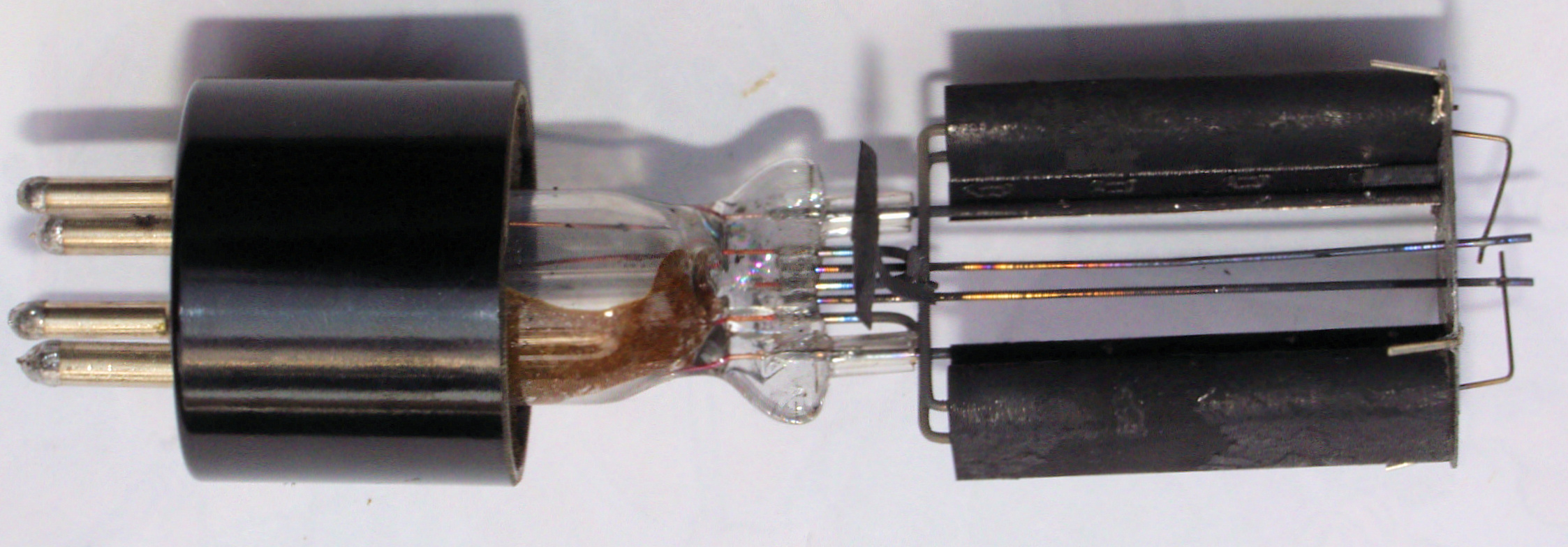 A66. 点検中。 水銀入り「整流管83」の内部。 ヒータの電極への溶接が取れていた!