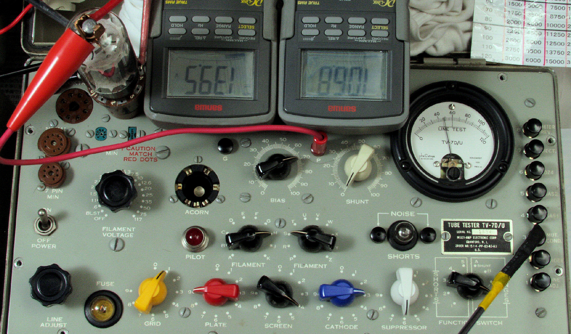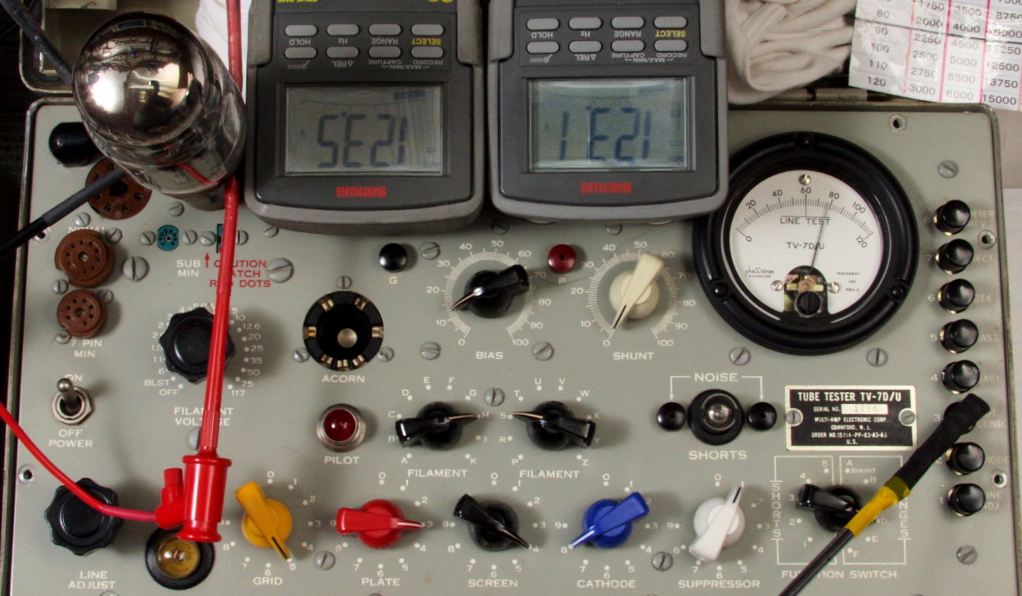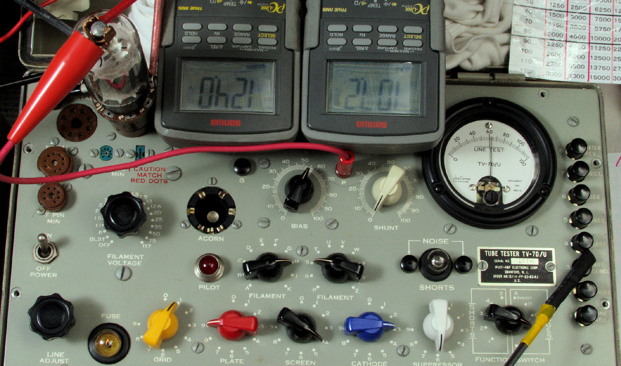 E21. Dレンジ(Max15000μmho)で「6L6−GT」のGm測定。Gm=46目盛×125倍=5750μmho。
