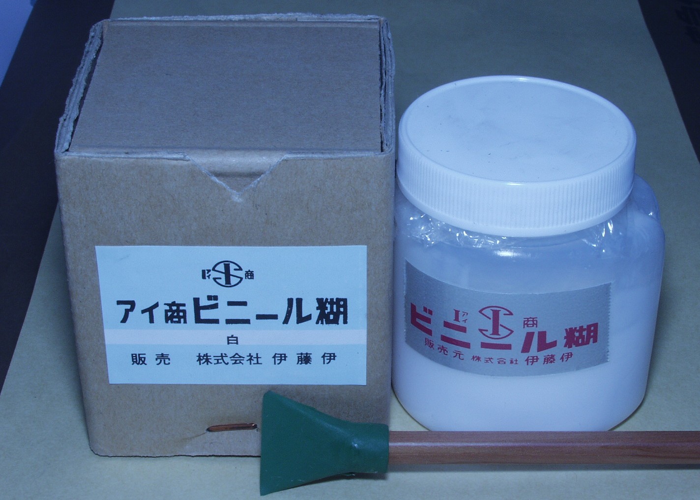 11. 酢酸ビニール系の接着剤 「ビニール糊」。 木工ボンドのたぐいと同じです。 付属のへらで塗り込みます。