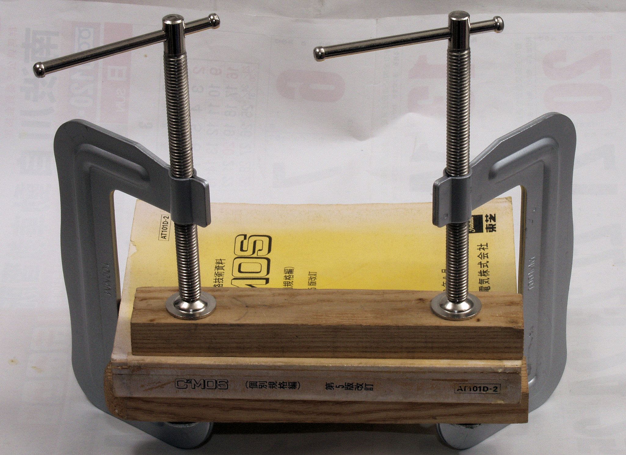 | 14. 酷いのは、下の様な「シャコ万力」で押さえると楽に出来ます。 無い場合重しでもOKです。 |
