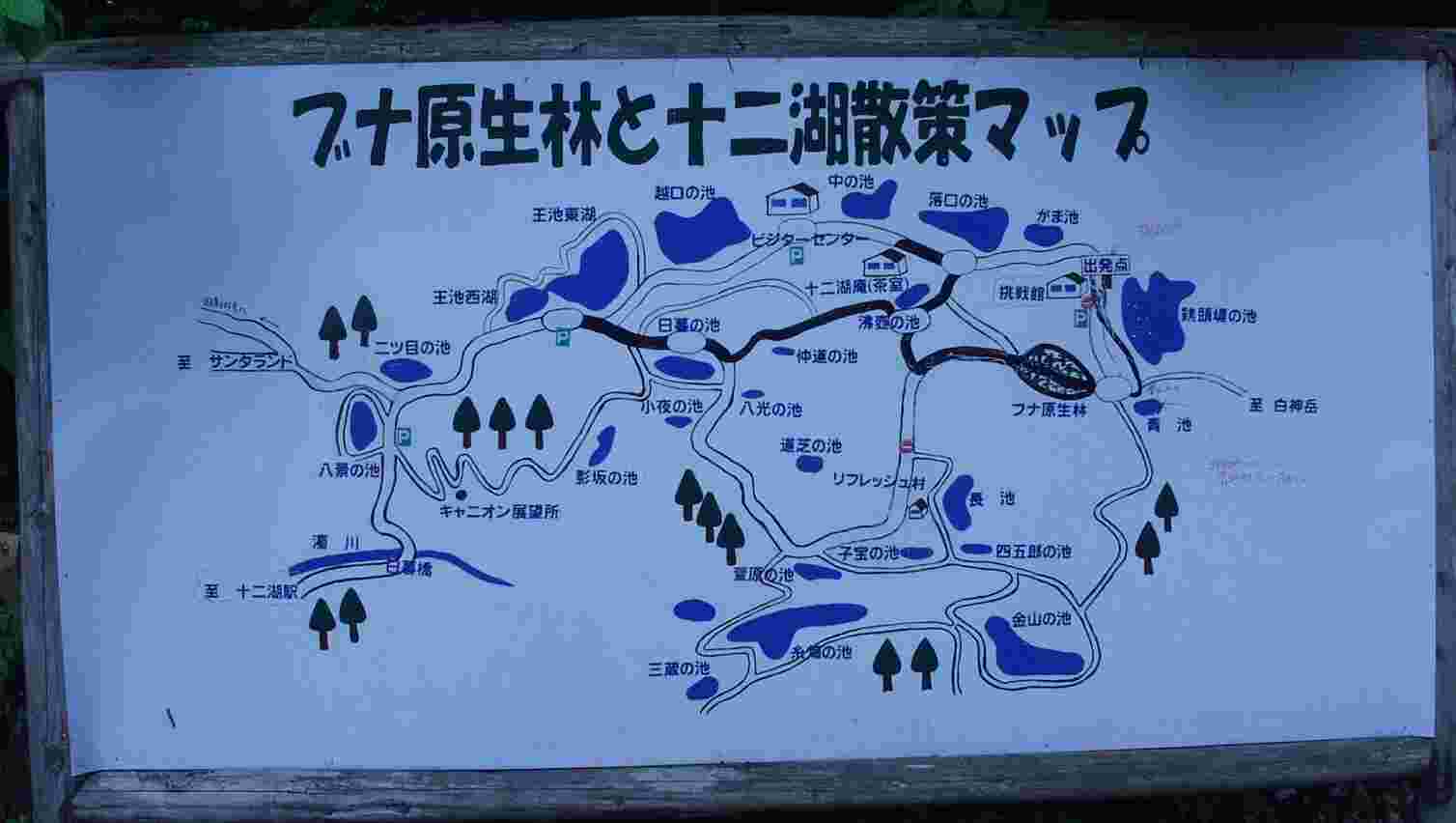 | 日本海沿岸に近い白神山地西方に大小33の湖沼の総称です。 十二湖の名前については、湖沼の中央東端にある大崩山から見ると12の湖が見える説と、面積が1平方キロメートル以上の湖沼が12ある説という、両説あります。 十二湖の誕生の原因については、宝永元年(1704)4月の大地震により大規模な山崩れが発生し、この堰止めにより湖が多数形成されたと言われています。 その他、氷河説、侵食盆地説、土砂崩れによる堰止湖説などがあります。 いずれにしろ、過去の大地震に関連した崩壊現象と断層という地質構造、崩れやすい構成岩石の組み合わせによってできた大規模な地すべり地形ではないかと考えられています。 十二湖最初の湖、八景の池です。つづいて王池、日暮の池、越口の池、中の池、落口の池、鶏頭場の池、青池などが姿をあらわします。いずれもうっそうと茂るブナ、ミズナラなどの広葉樹の深い原生林に囲まれて、波静かな湖です。 |