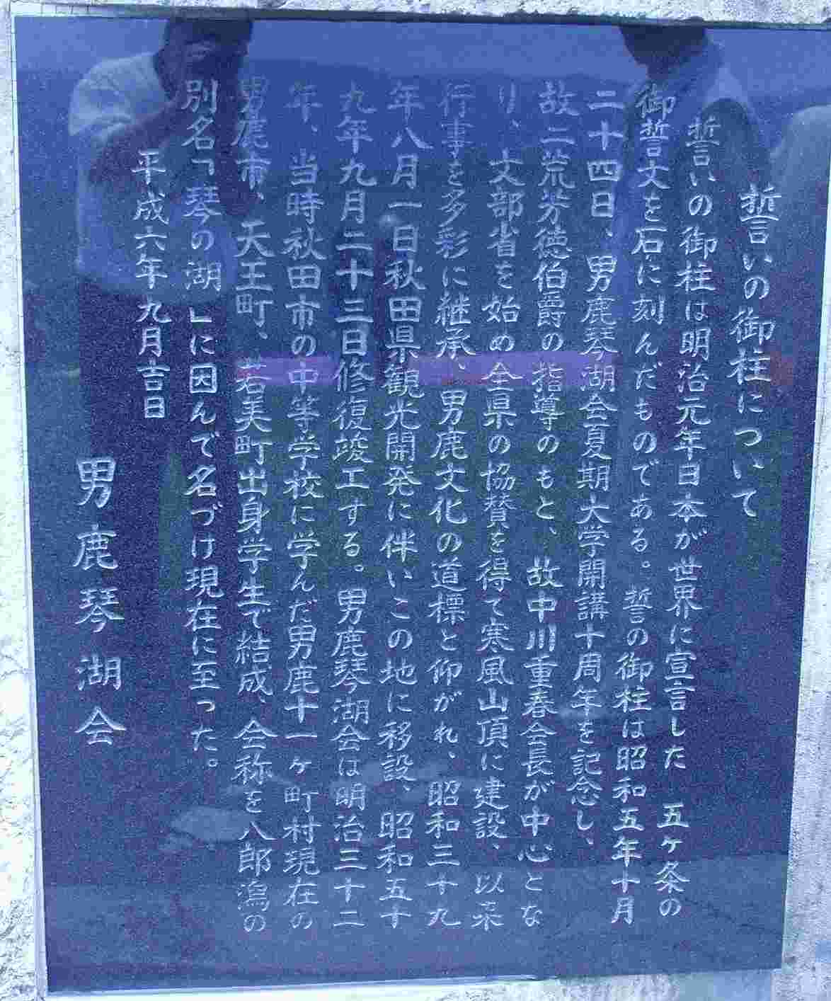 | 3.山頂の誓の御柱 昭和5年10月、男鹿琴湖会が 男鹿夏期大学開校10回を記念して 五角の石柱に五ヶ条の御誓文を刻んだ 高さ約7mの寒風石による石碑を 建立したものである。 それが「誓の御柱」である。 もともと、薬師長根山頂に建てられたが、 昭和39年の回転展望台建設にともない、 今の場所に移された。 |