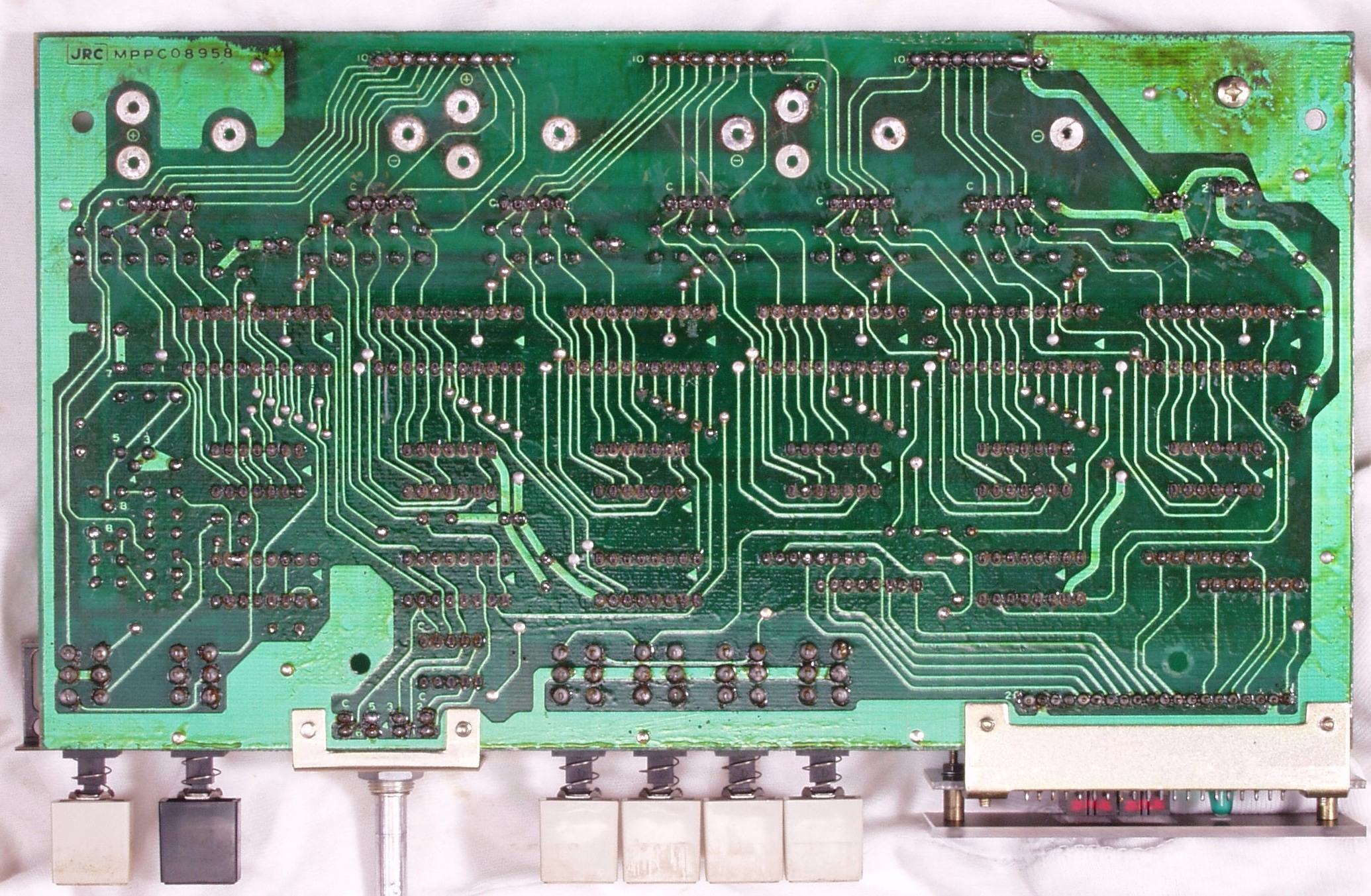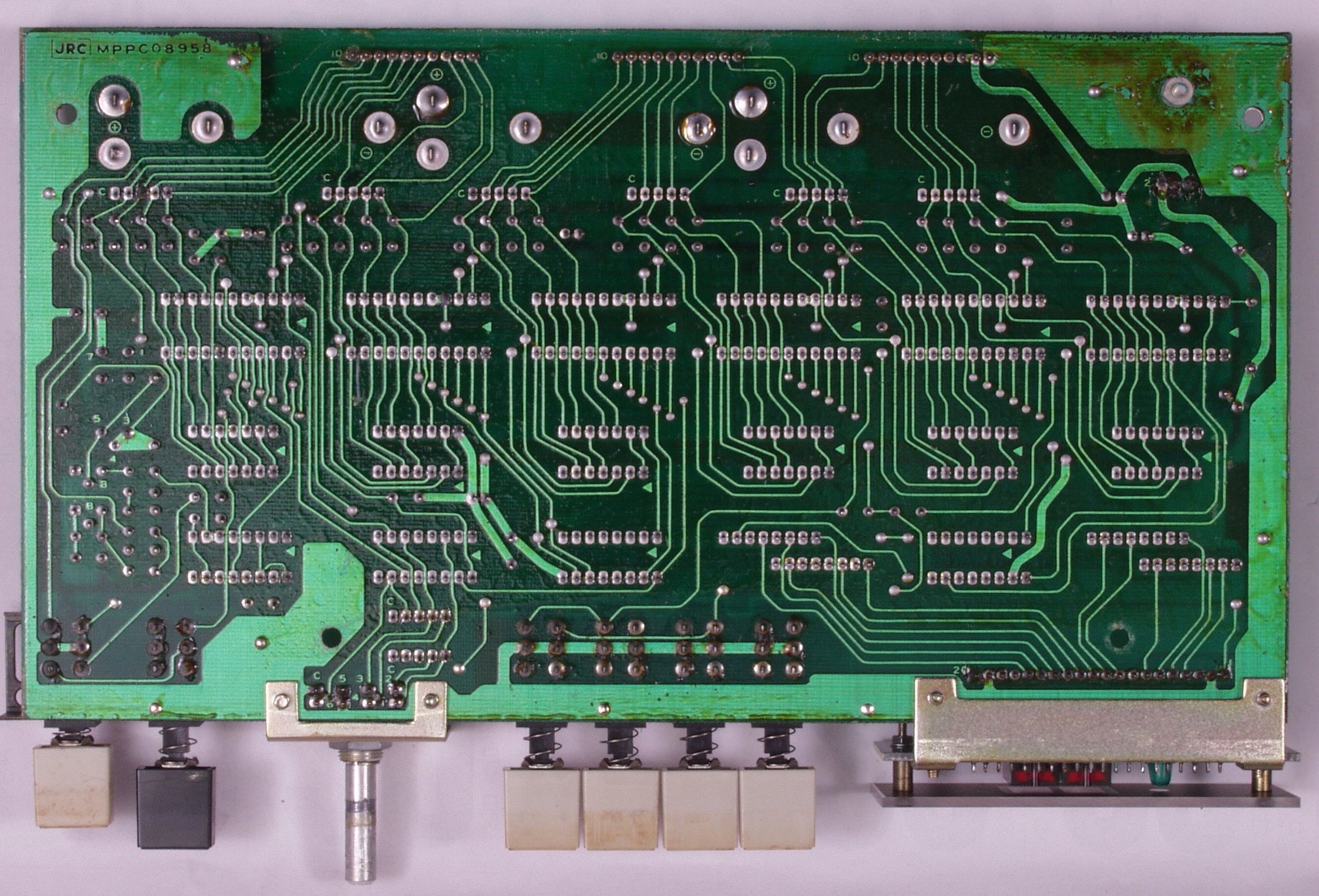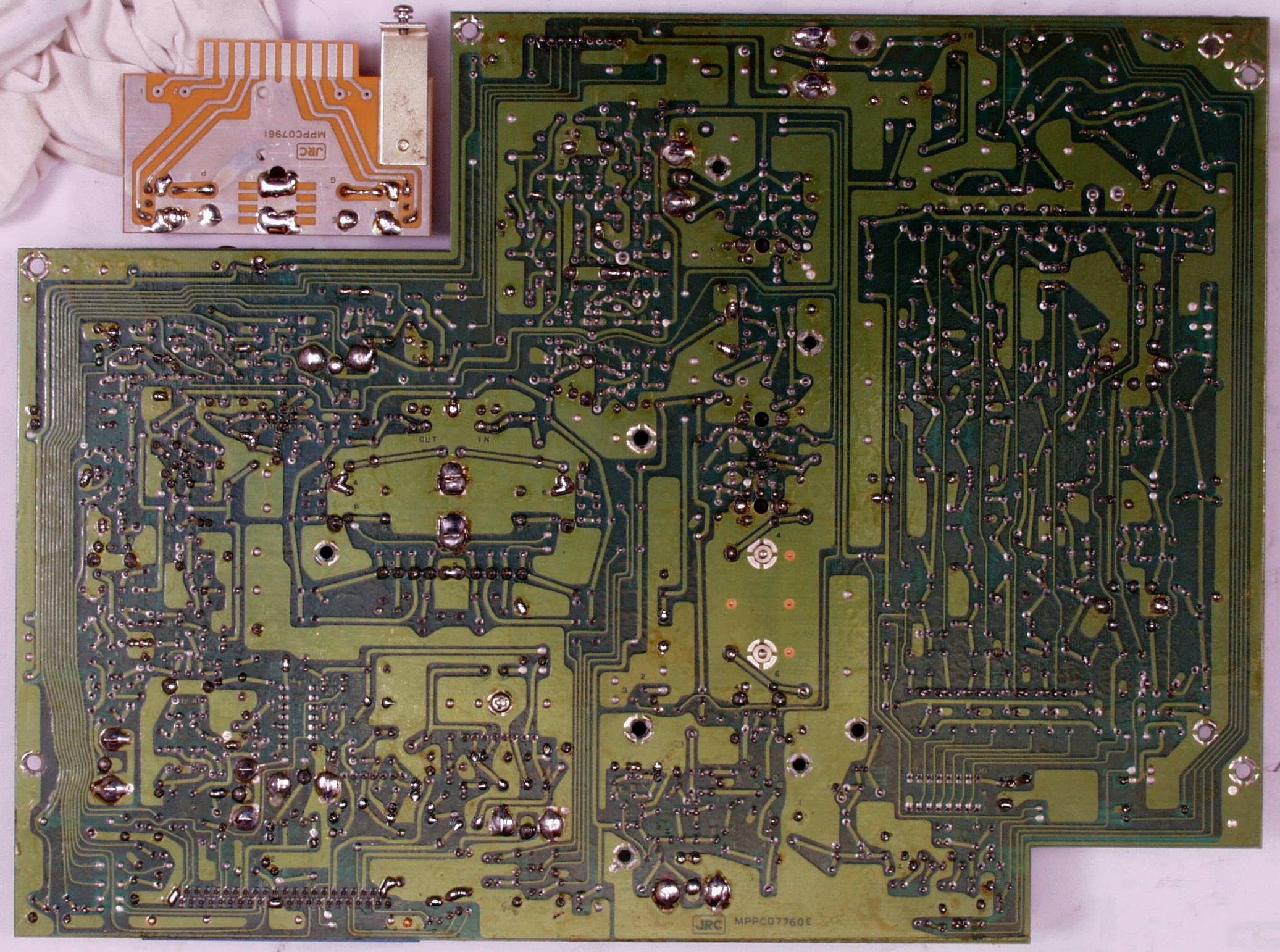 | C−6E. 修理中 シンセサイザー基板裏、シールドを外した所 |