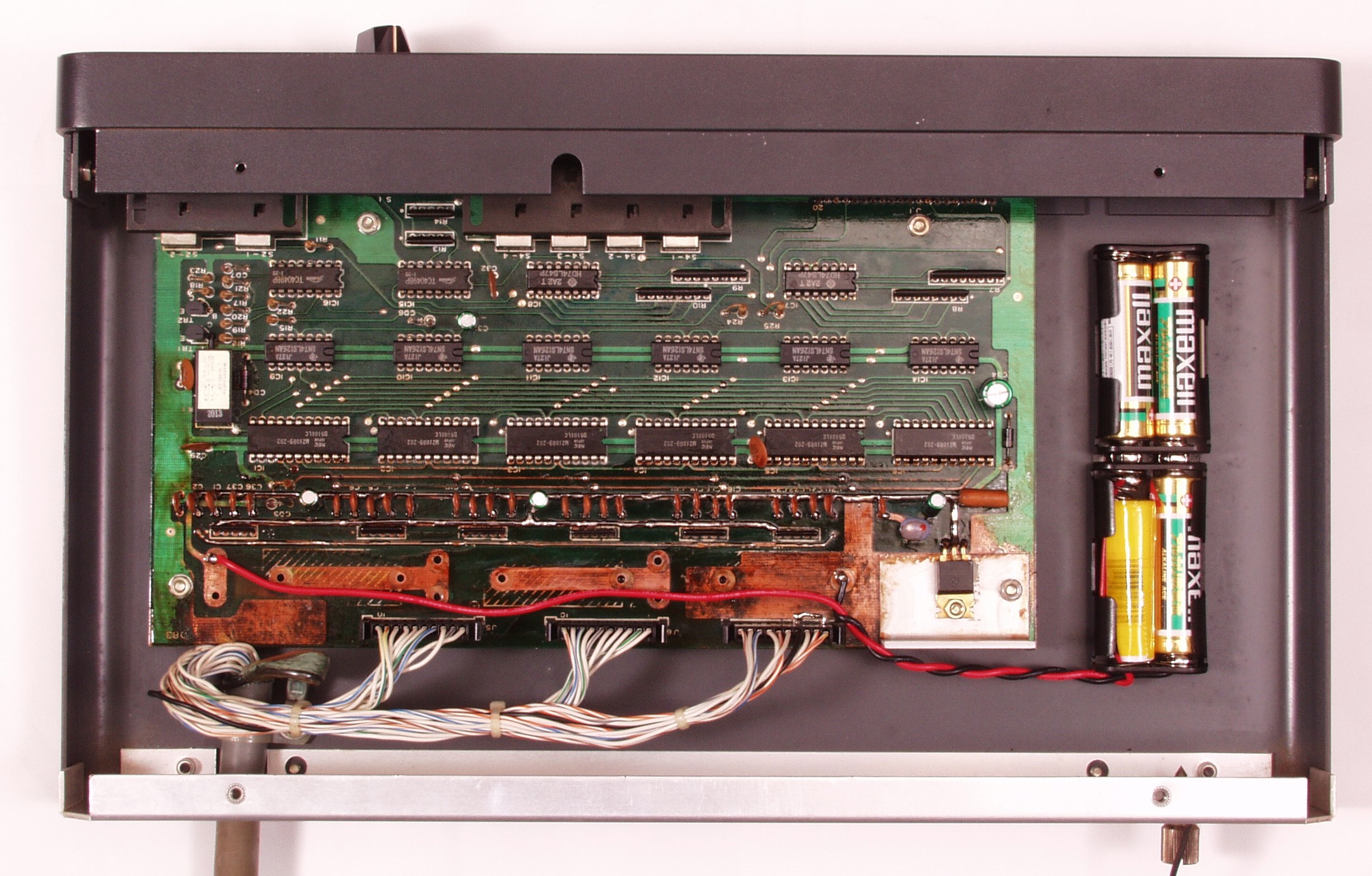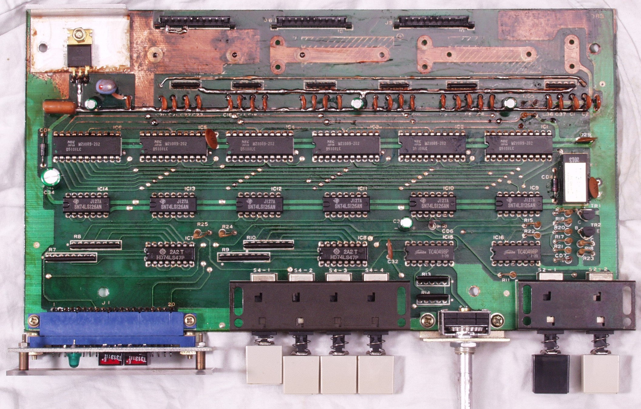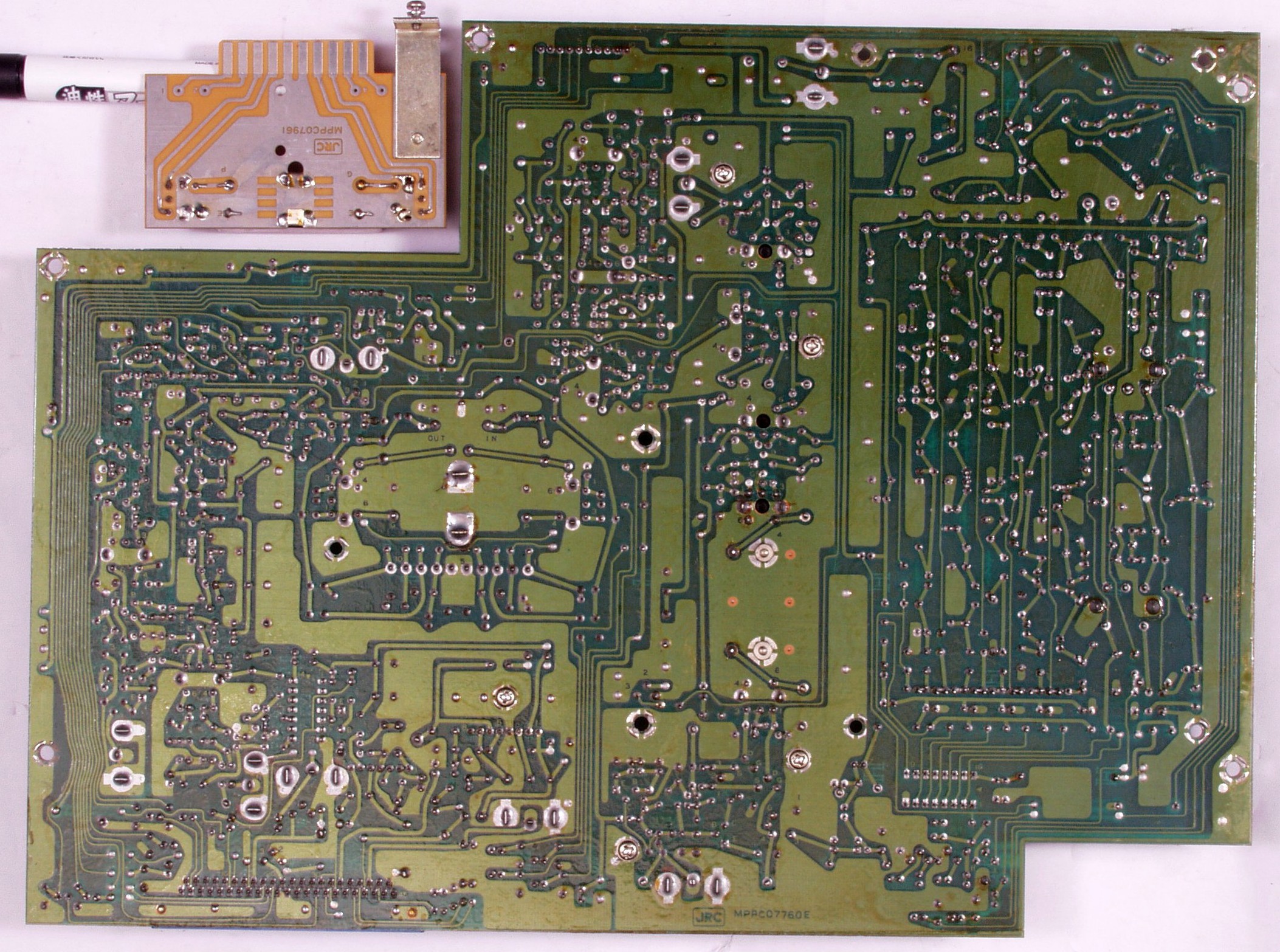 | C−6E. 修理中 シンセサイザー基板裏、シールドを外した所 |