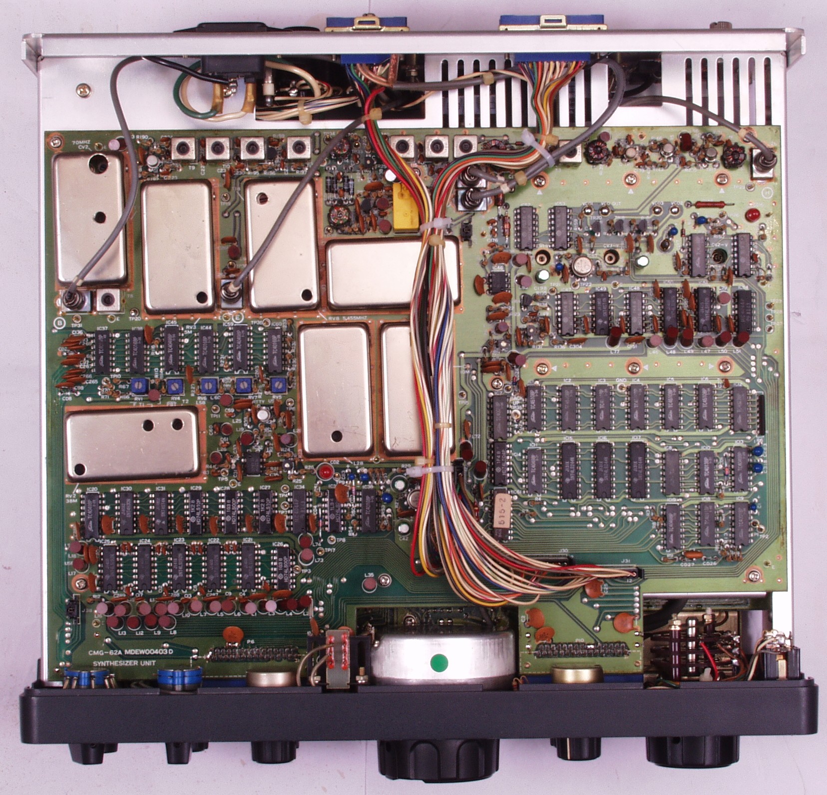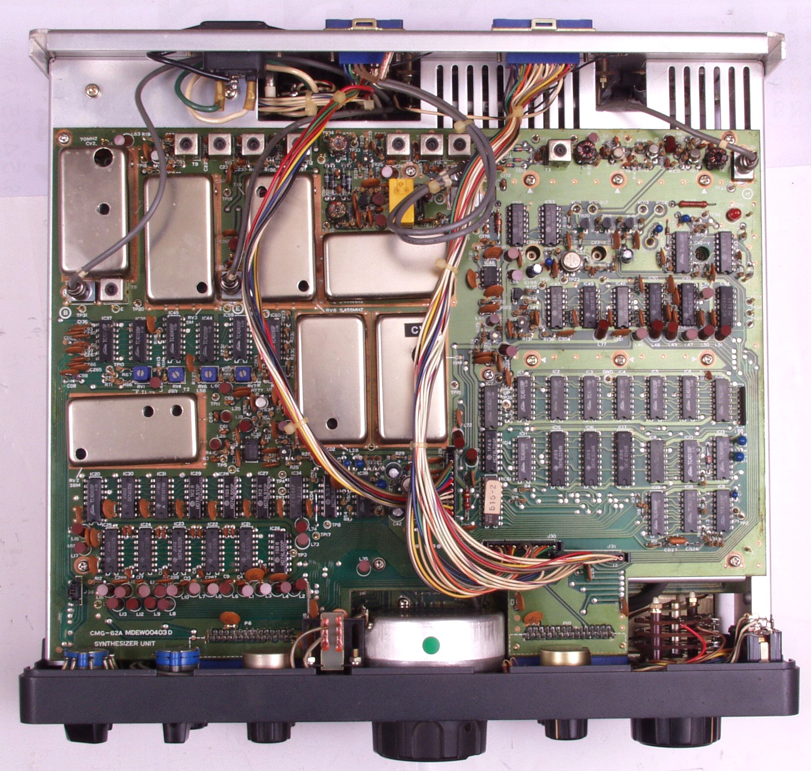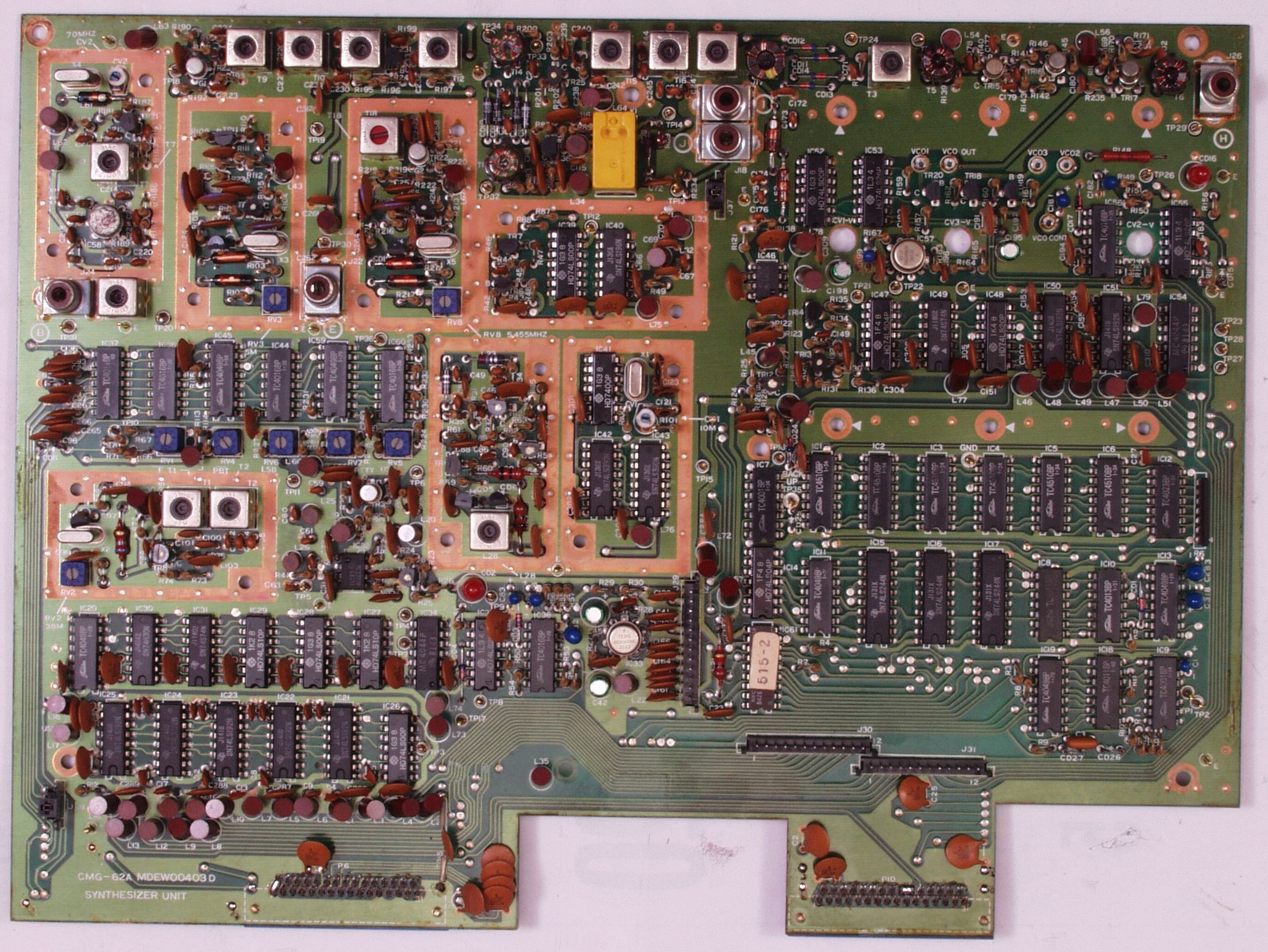 | C−6B. 修理中 シンセサイザー基板、シールドを外した所 |