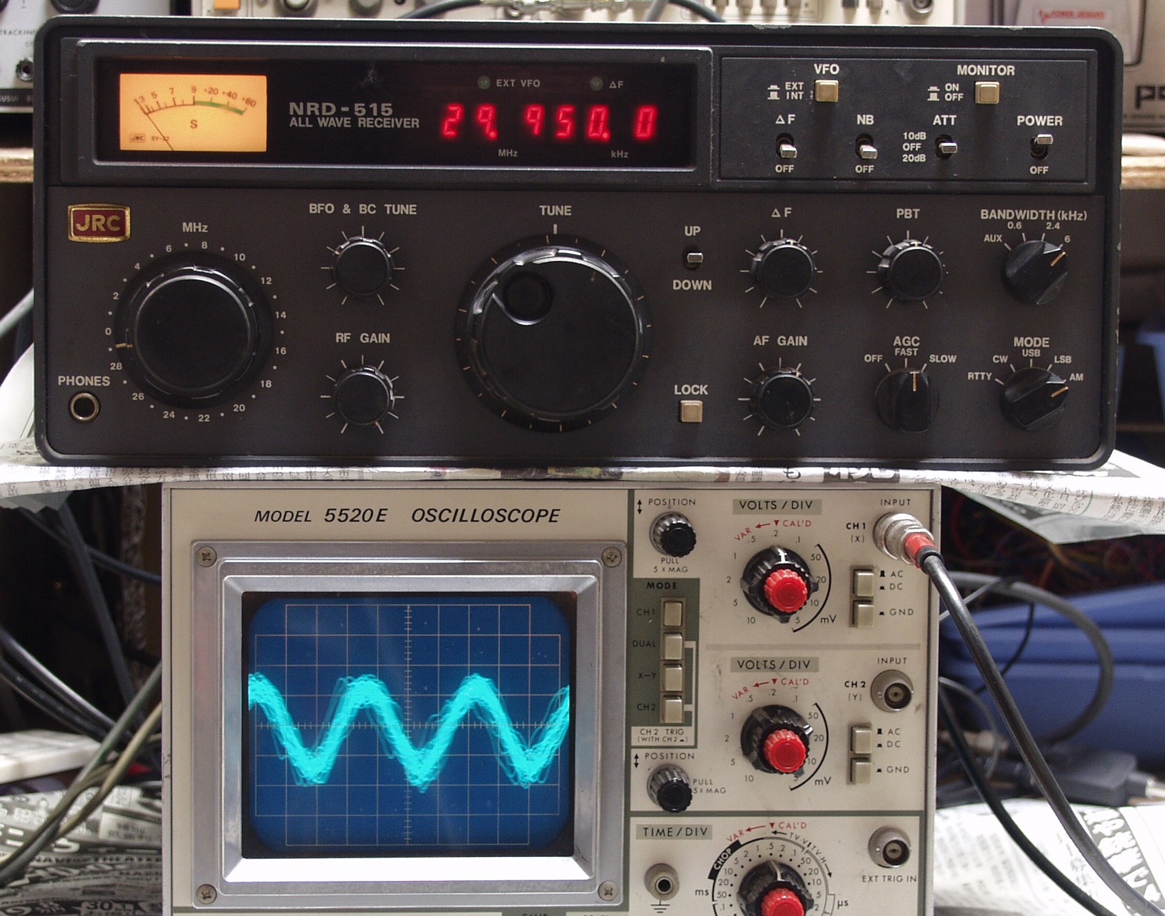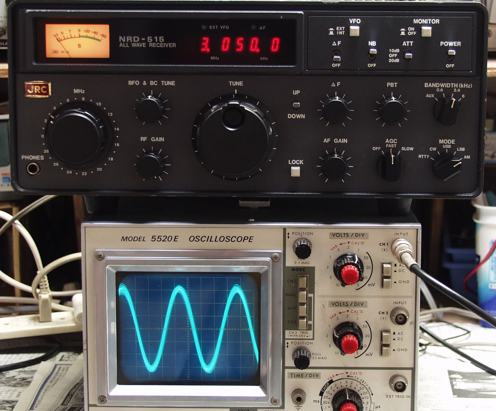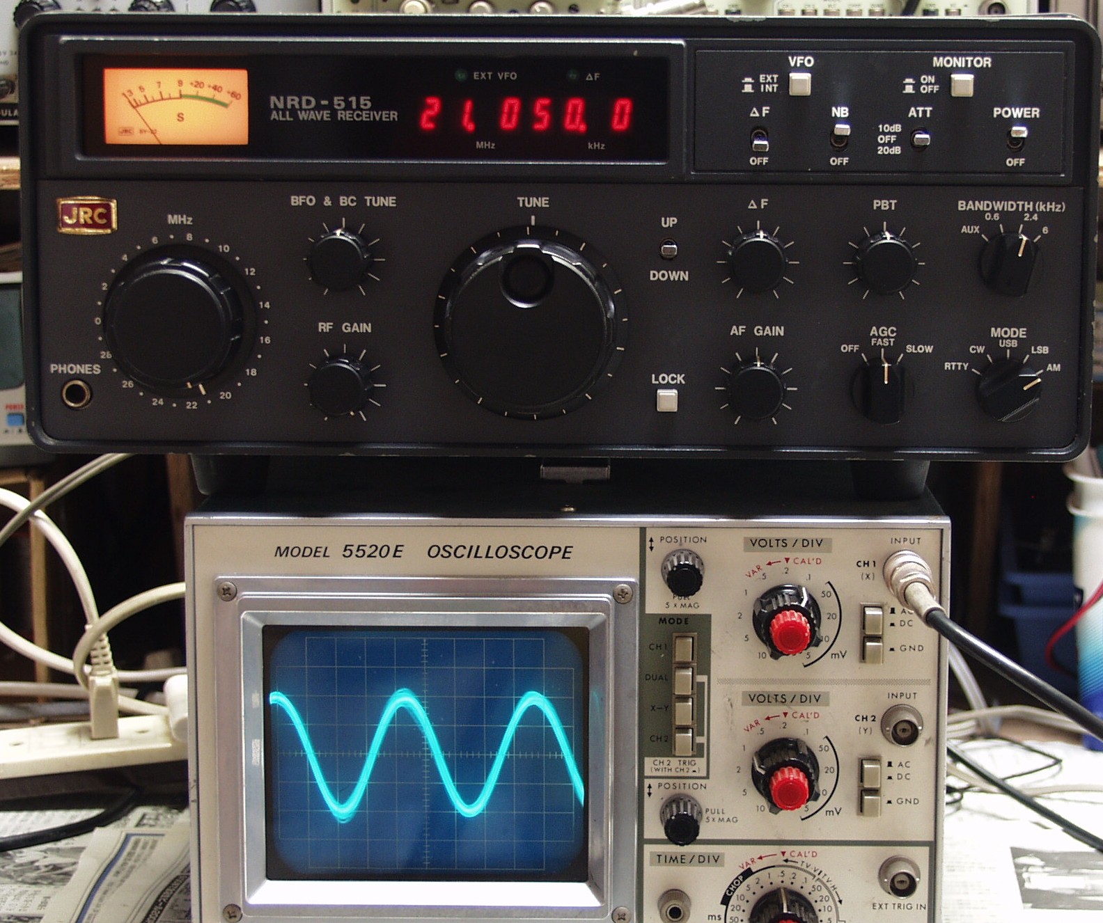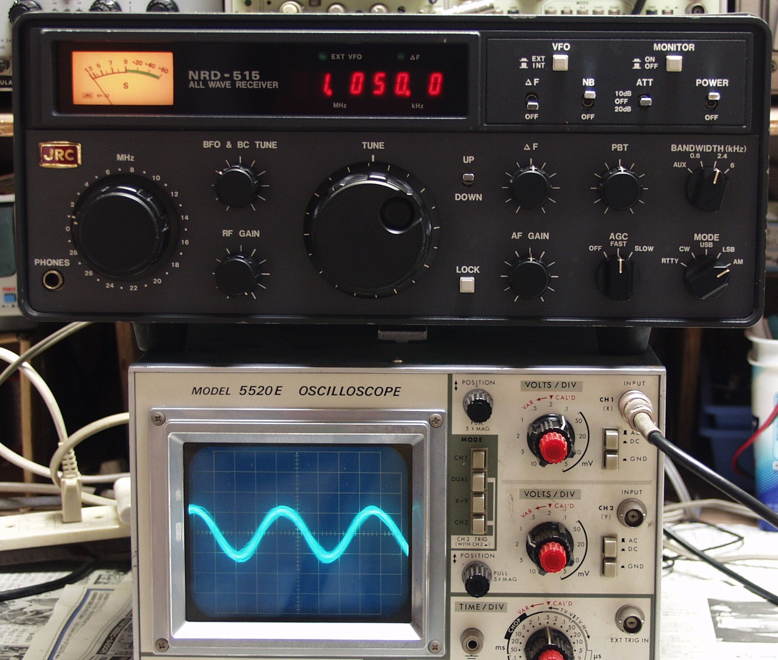 E−1. 測定・調整 上のSGより400HZAM50%変調の信号を受信し、ライン出力をオシロで観測、信号強度=2μV |