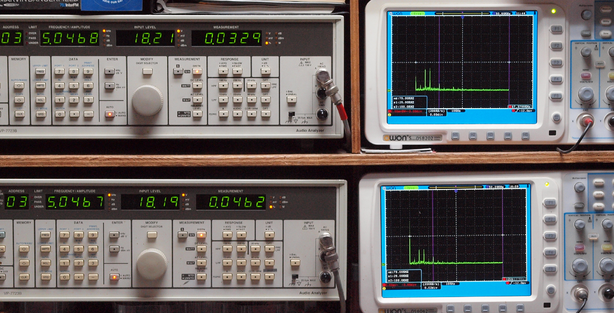 | E. 測定・調整 E1. 出力・歪み率測定・調整 「見方」。 上段中 右側SP出力を「Audio Analyzer Panasonic VP−7723B」により測定。 表示LED、 左端=メモリーNo、 中左=周波数測定、 中右=出力電圧測定、 右端=歪み率測定。 上段右端 VP−7723Bの基本波除去出力を「owon SDS8202(200MHZ)」で「FFT分析」表示。 下段中 左側SP出力を「Audio Analyzer Panasonic VP−7723B」により測定。 表示LED、 左端=メモリーNo、 中左=周波数測定、 中右=出力電圧測定、 右端=歪み率測定。 下段右端 VP−7723Bの基本波除去出力を「owon SDS6062(200MHZ)」で「FFT分析」表示。 下段左端 オーディオ発振器 VP−7201A より50Hz〜100kHzの信号を出し(歪み率=約0.003%)、ATT+分配器を通し、AMPに入力。 よって、ダイアル設定出力レベルより低くなります。測定機器の仕様や整備の様子はこちら、「VP−7723B」「VP−7201A」。 FFT画面の見方はこちら。 |