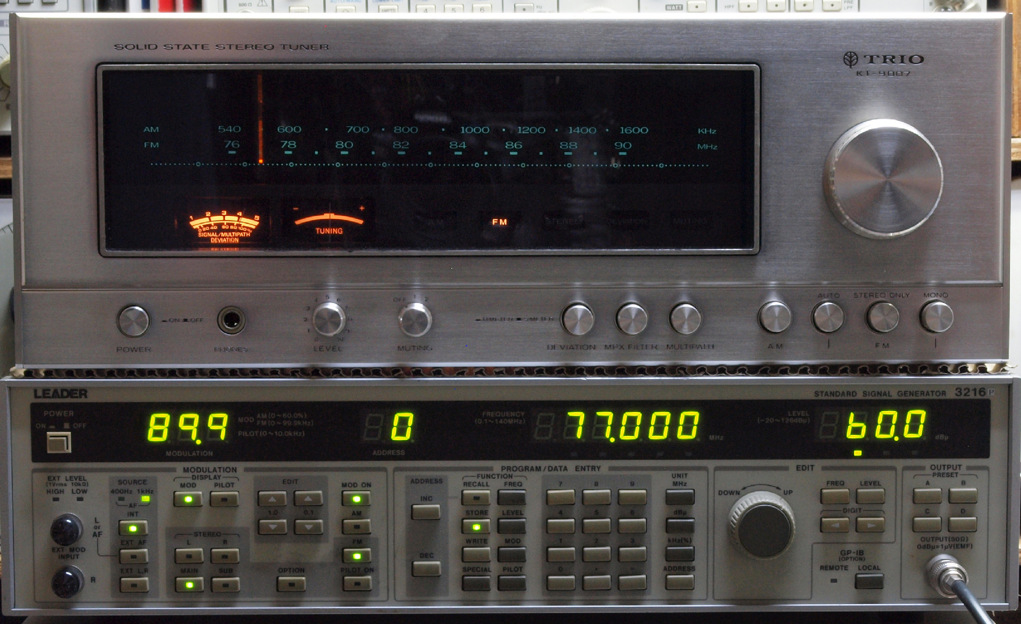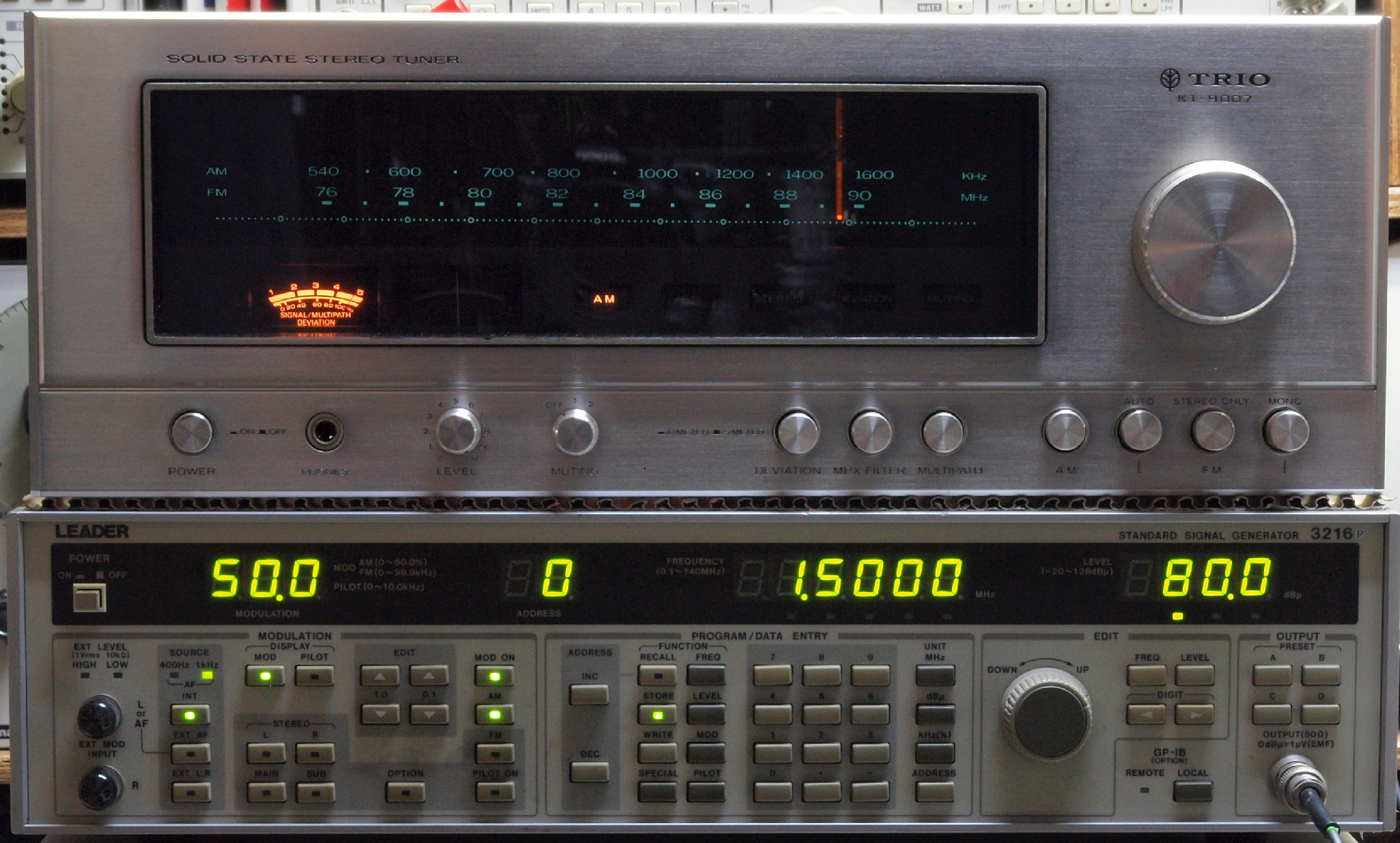 中上の「LEADER 3216P FM ステレオ信号発信器」より信号を出す。 これを受信し出力を測定する。