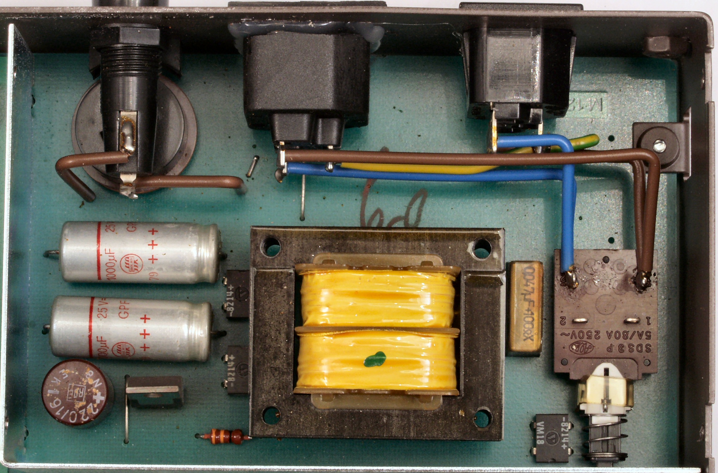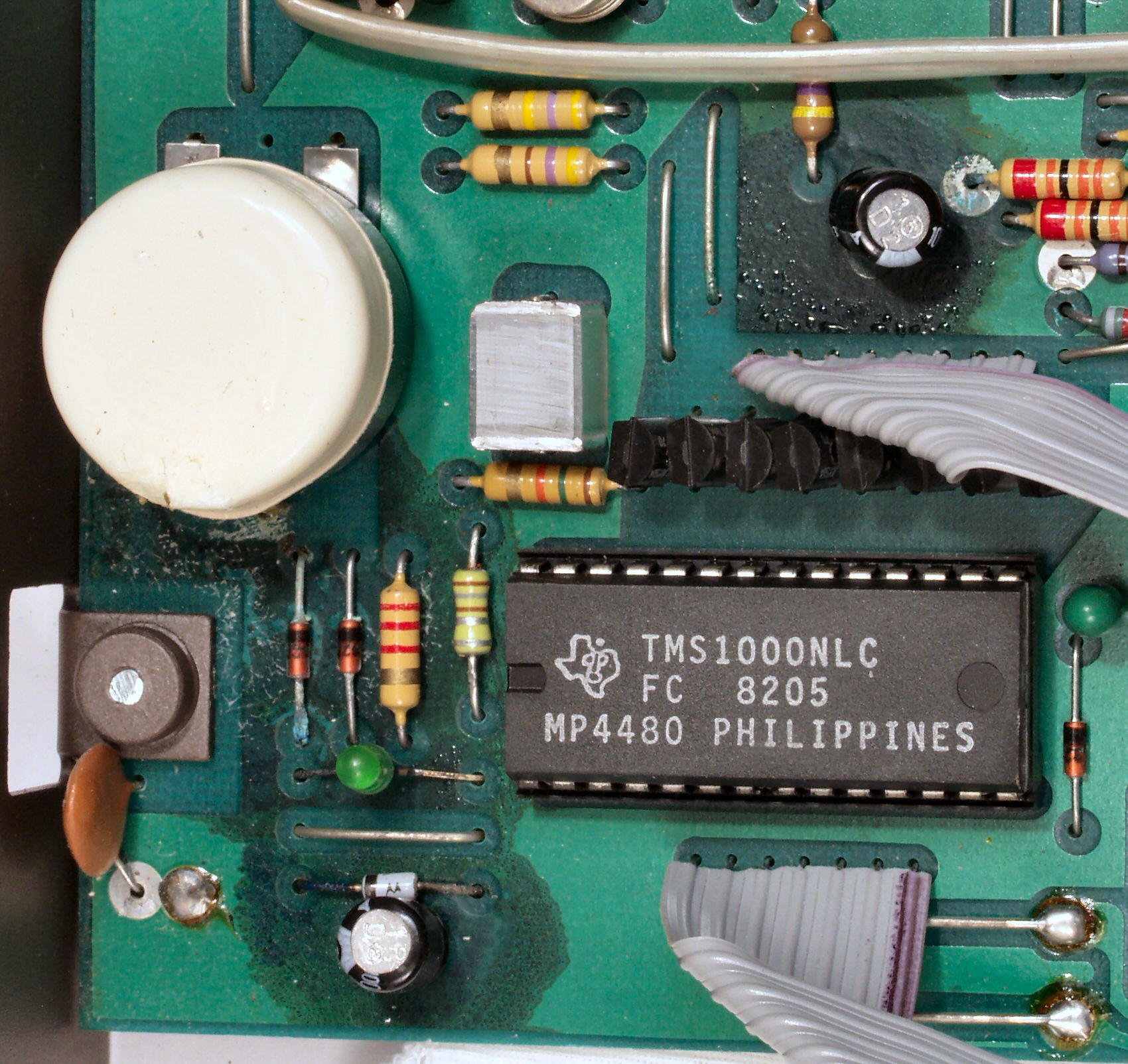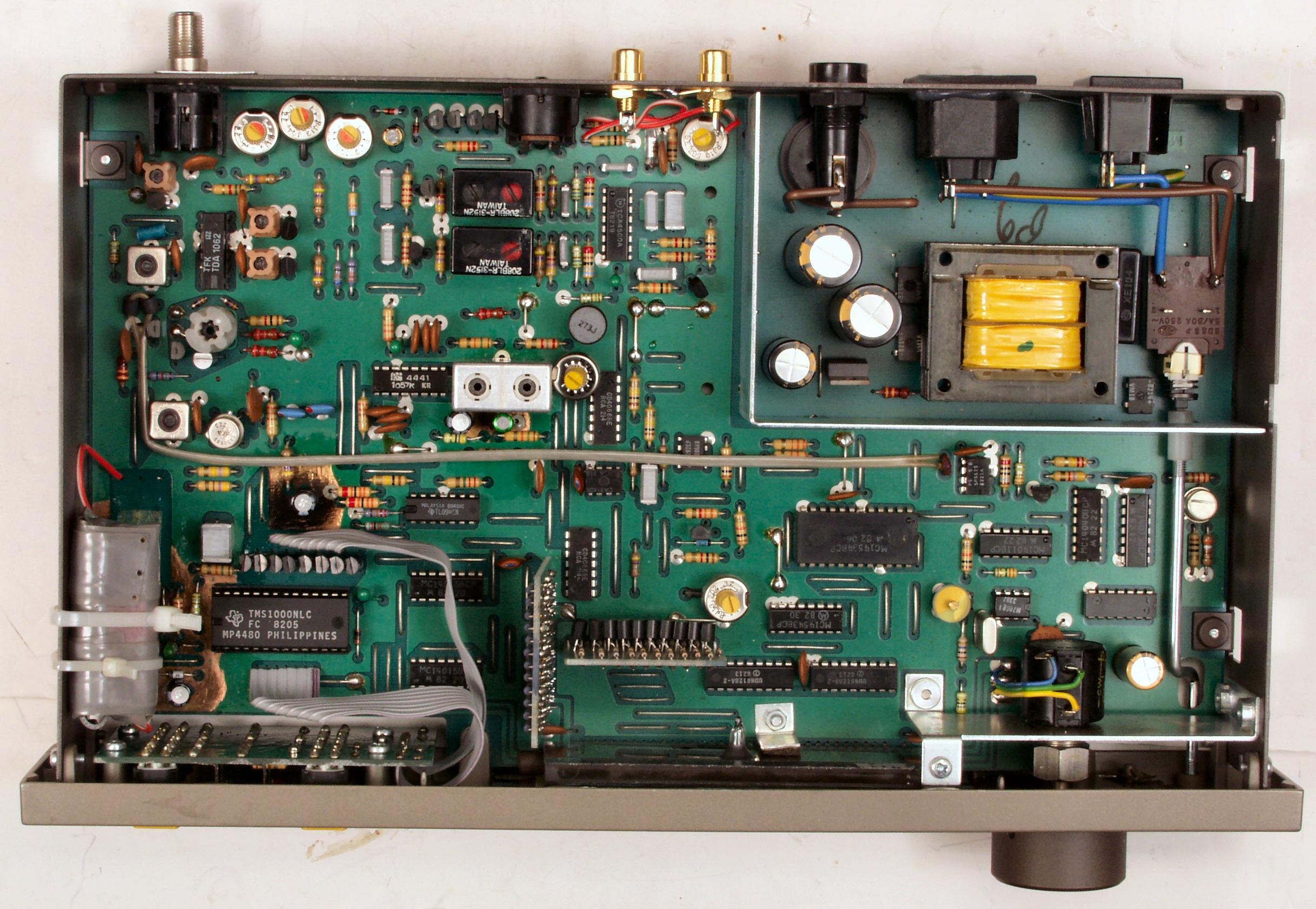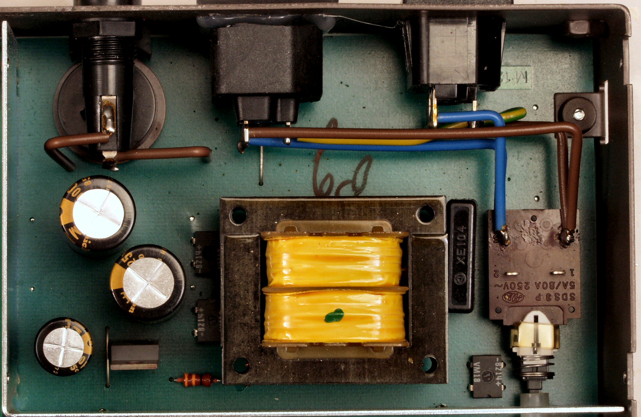 | A5. 点検中 電源部、左下の茶色い電解コンデンサーもヒビが入っている。 | ||||||||||||||||||||||||||||||||||||||||||||||||