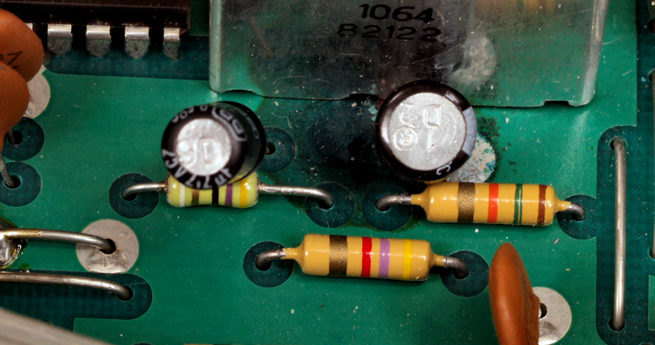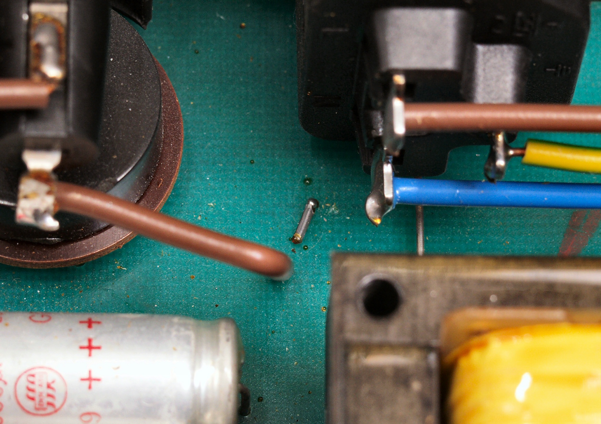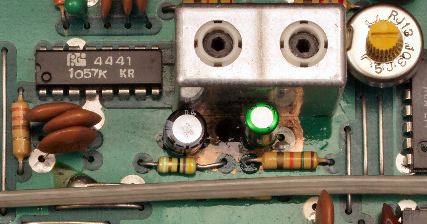 | C22. 修理中 基板腐食ケ所2、部品を外し、銅箔を出す。IFTコイルの下まで及んでいる。 | ||||||||||||||||||||||||||||||||||||||||||||||||