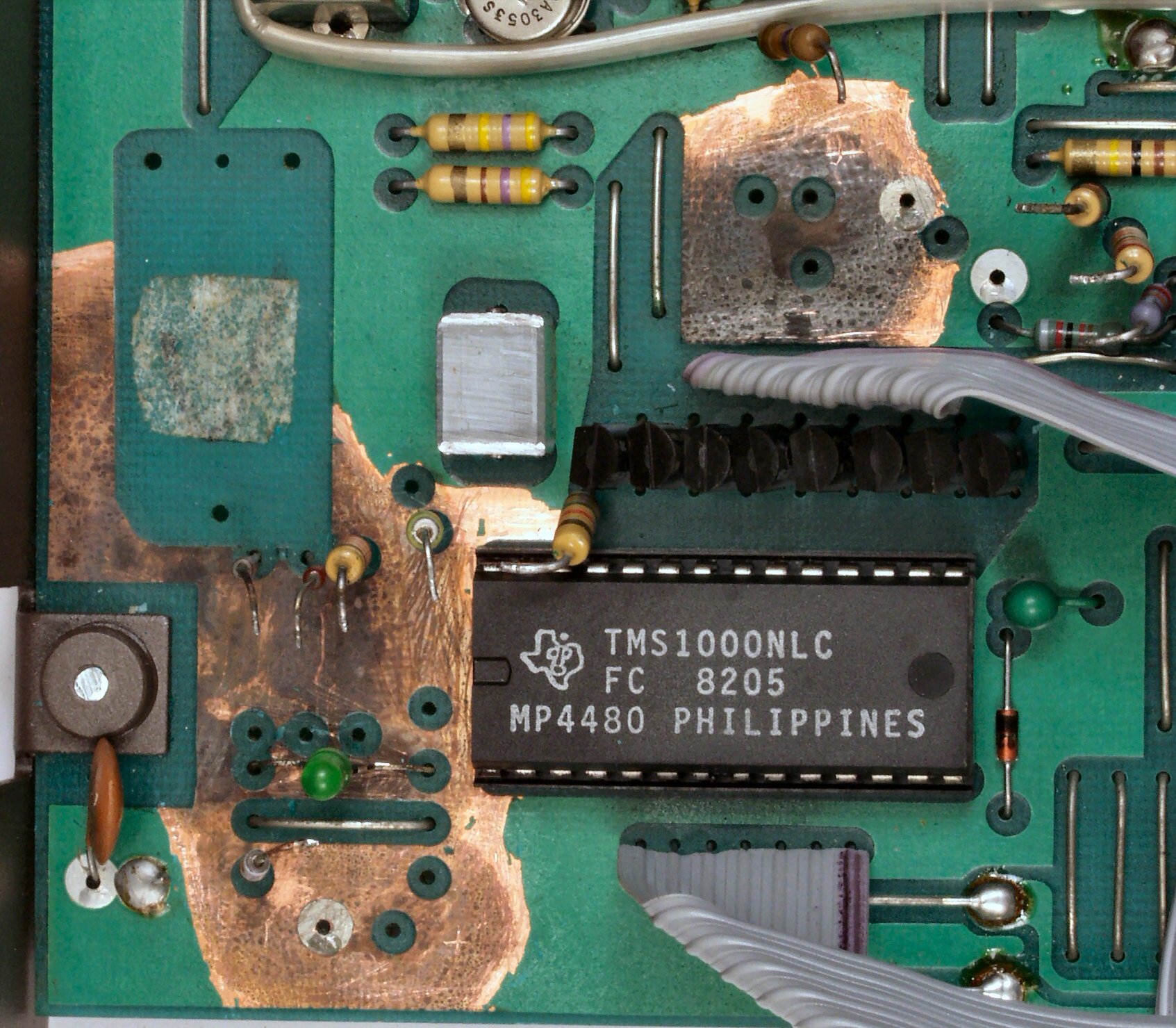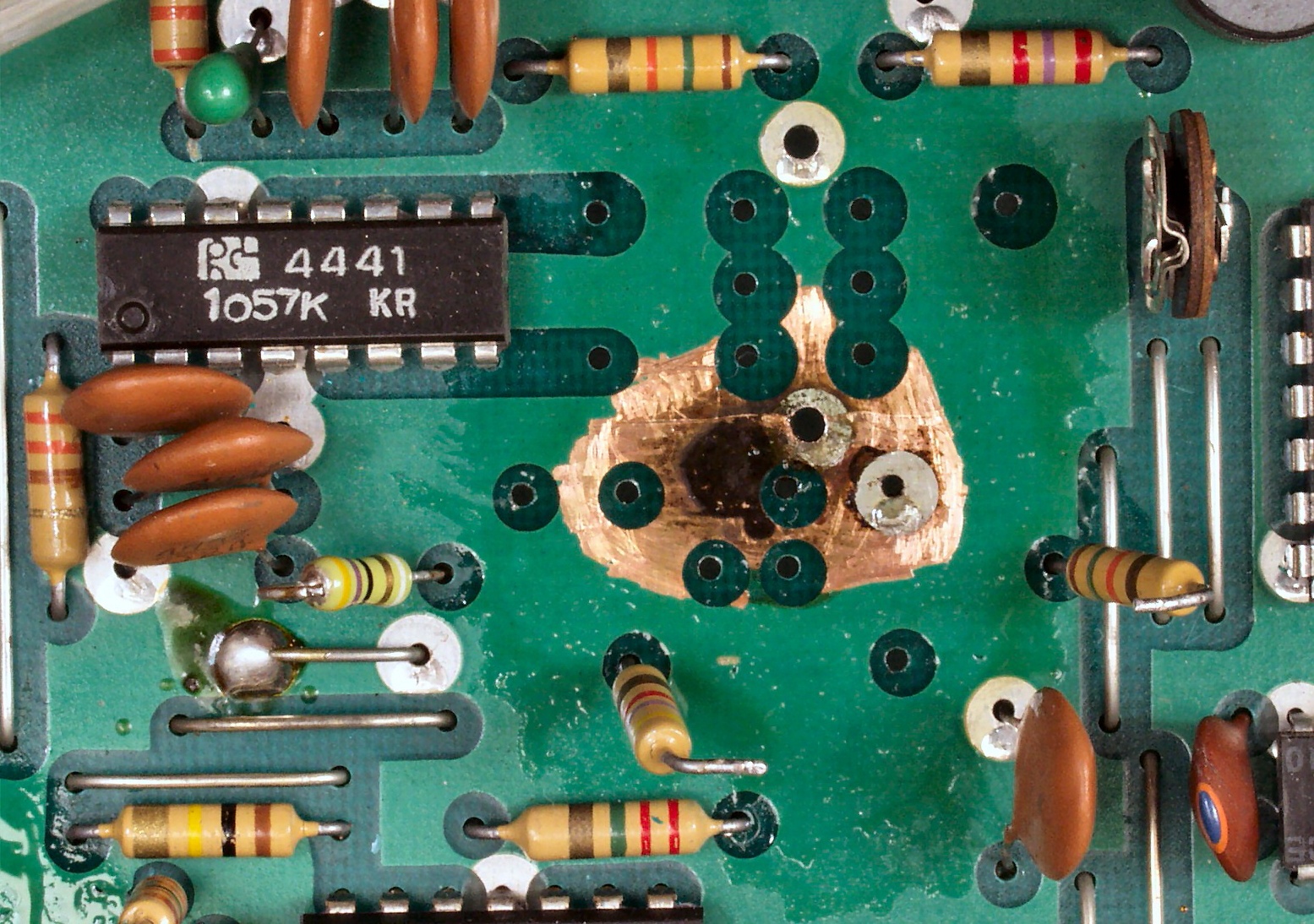 | C. 修理状況。 画像をクリックすると、大きく(横幅2050ドット)表示されます。 C11. 修理前 基板腐食ケ所1、バックアップ電池及び電解コンデンサーからの液漏れ。 |