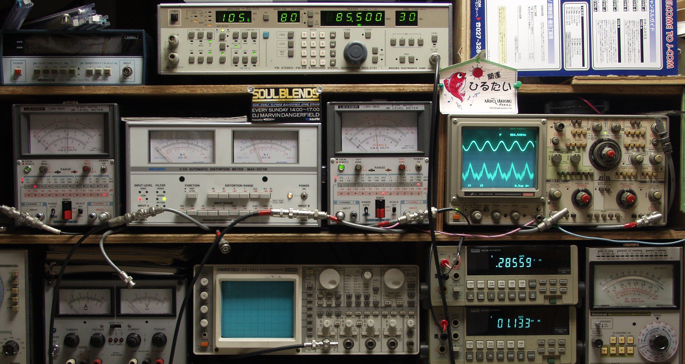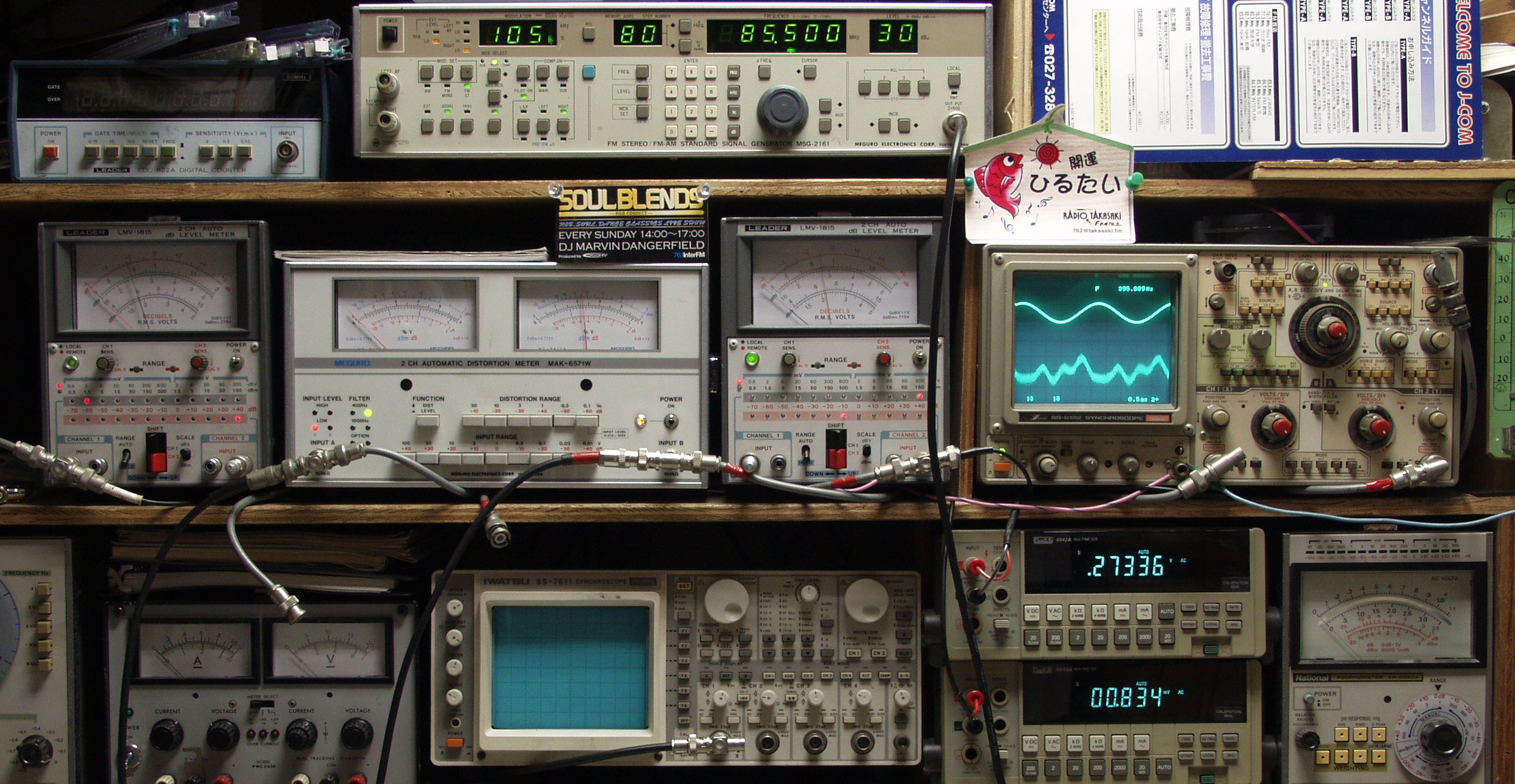 | E. 調整・測定 FM受信感度、RL分離測定調整。 画像をクリックすると、大きく(横幅2050ドット)表示されます。 <見方> 上段中のFMステレオ信号発信器より 85.5MHZで 400HZの 変調信号を 30dBで出す これを受信し出力を測定する 中段左端 電圧計=L側出力電圧測定、黒針のみ使用 中段中左 歪み率計=出力の歪み率測定 左メータ=L出力、右メータ=R出力 中段中右 電圧計=R側出力電圧測定、赤針のみ使用 中段右端 オシロ=出力波形 上=R出力、下=L出力(実際にはRL電圧計の出力「Max1V」を観測) 下段中右上 デジタル電圧計=R出力電圧測定 下段中右下 デジタル電圧計=L出力電圧測定 |