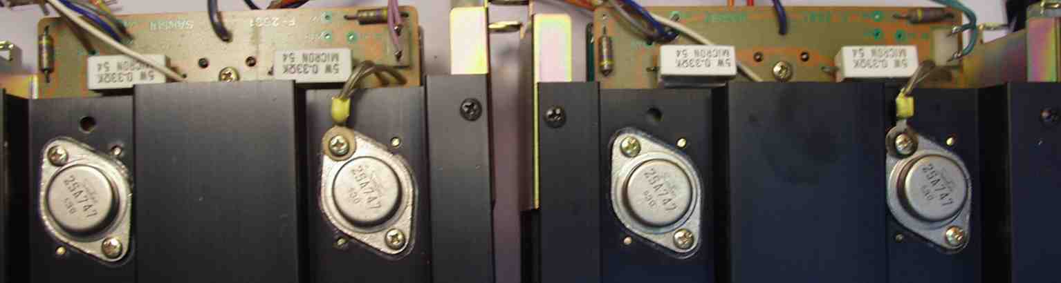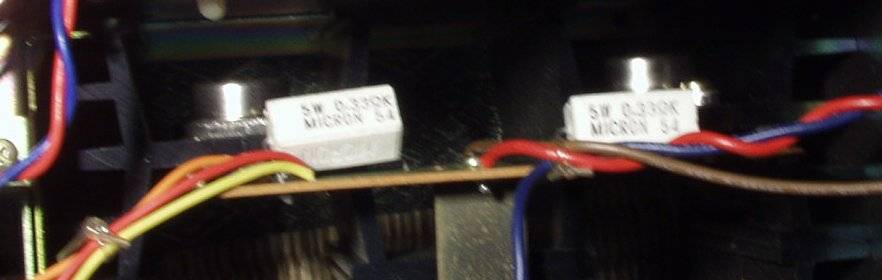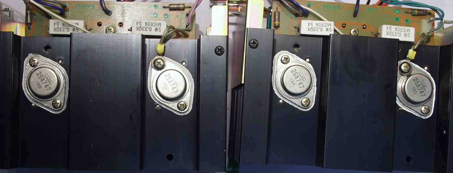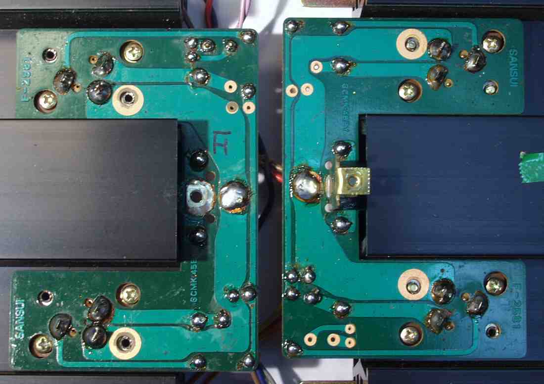 | A5. 修理前 交換してある終段抵抗、終段TR が綺麗なので交換してある。 これらの修理が施されたのは大事故の証拠 熱のため、流れだし、全くないシリコン・グリス 終段終段TR(トランジスター)が元気だと良いですが? |
