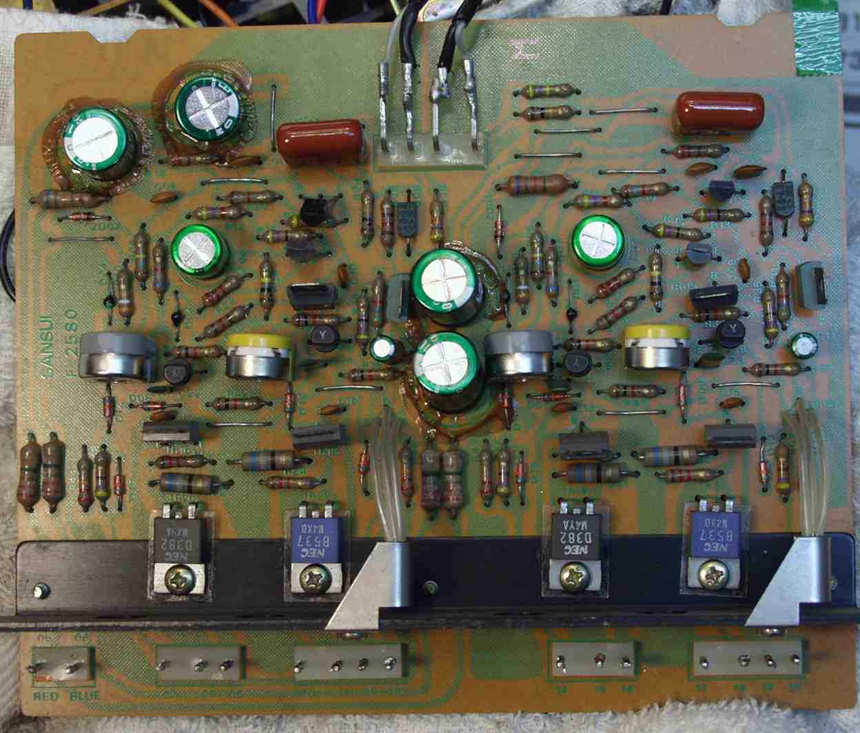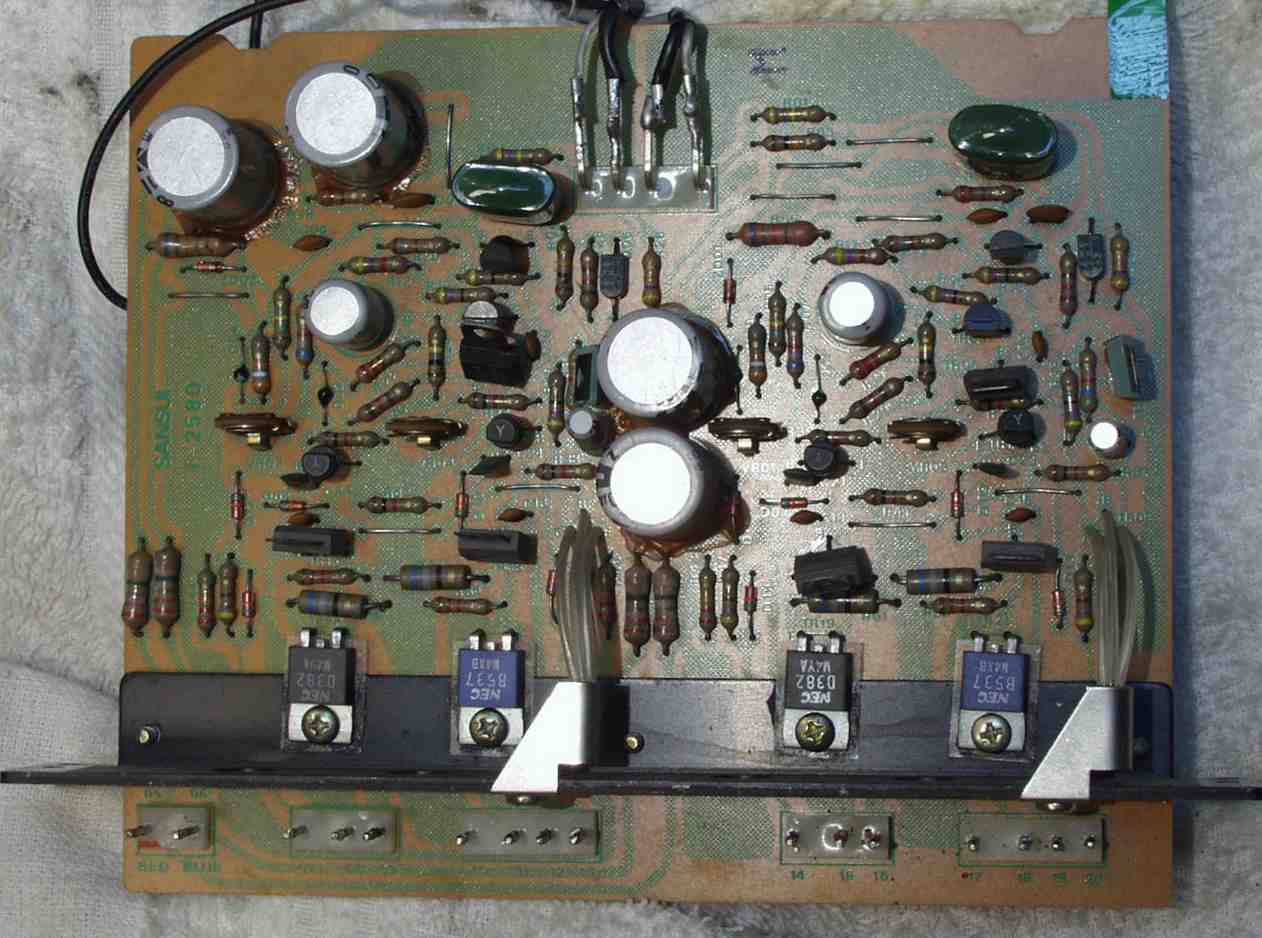 | C2B. 修理後 ドライバー基盤 初段TR(トランジスター)4個 半固定VR4個 電解コンデンサー8個交換 結合コンデンサーをメタライズドフイルムコンデンサーに交換=上の茶色の2個+裏に2個 |