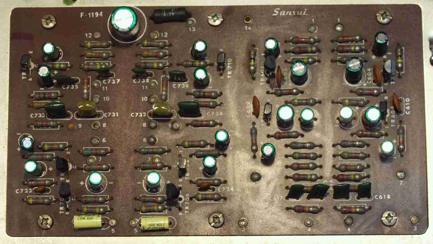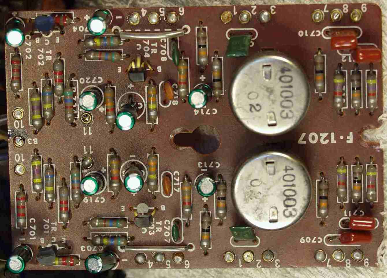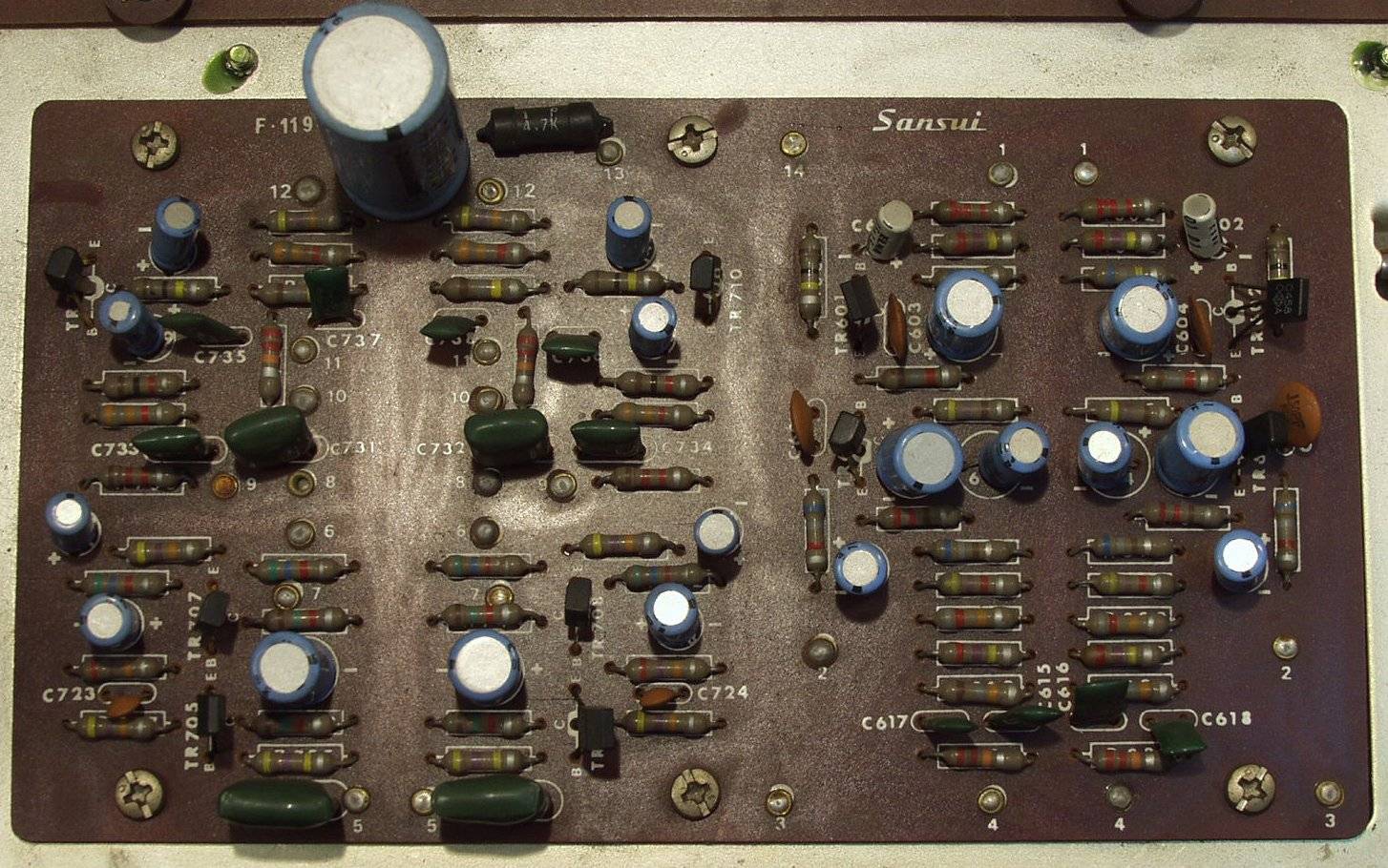 | C−5B. 修理後 EQ−AMP 電解コンデンサー21個 フイルムコンデンサー2個 TR(トランジスター)4個交換 | ||||||||||||||||||||||||||||||||||||||||||||||||||||||||||