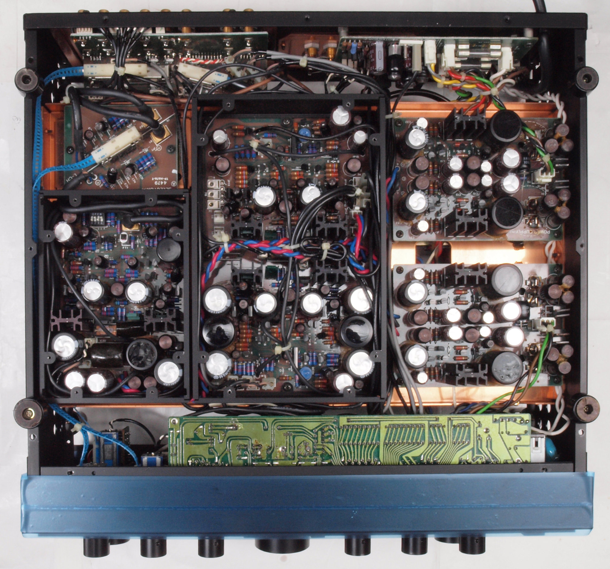 | CD1. 修理前 表示LED基板、 左=PowerAmp、 中=Adaptor・Muting・SourceDirect・SUBsonic、 右=テープREC。 | ||||||||||||||||||