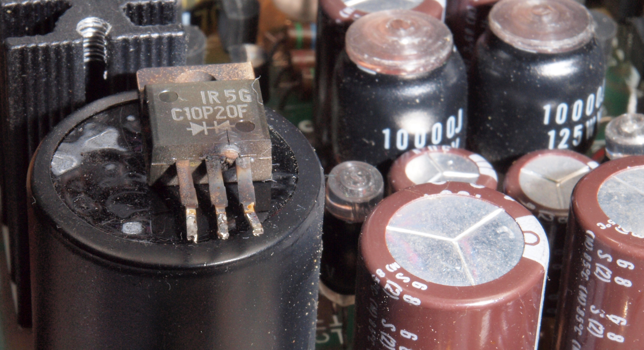 | C417. 修理中 L側AMP基板、 電解コンデンサー固定用の接着材、ダイオードの足を腐食する。 | ||||||||||||||||||