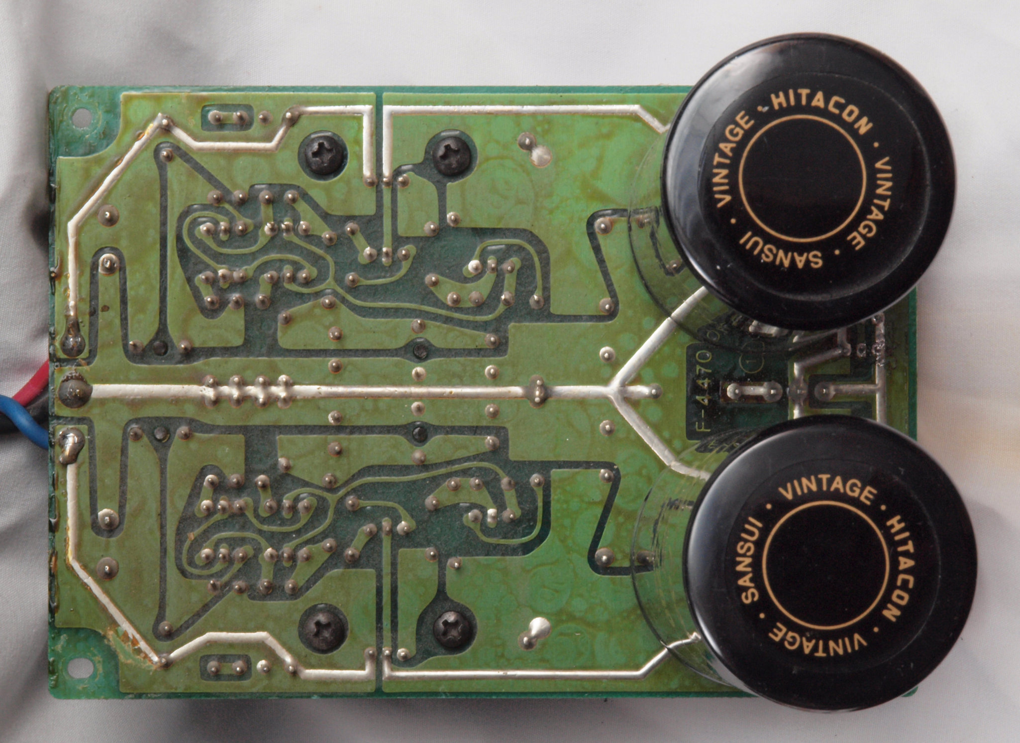 | C412. 修理中 R側AMP基板、 電解コンデンサー固定用の接着材、当時は溶媒にトルエンが使用されており、銅を腐食する。 | ||||||||||||||||||