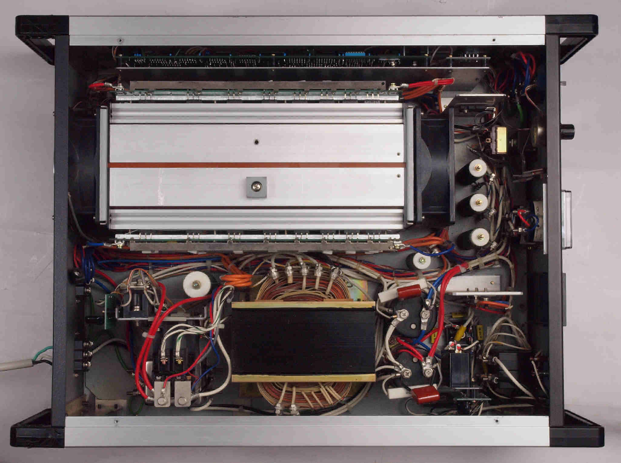 | B5. 上蓋を取り、上から見る。フイルムコンデンサー2個、冷却フアンコントロールサーモ2個追加。 フアンが2個有るので、内側フアン冷却温度、45度=ON、40度=OFF。外側フアン冷却温度、55度=ON、45度=OFF。 |