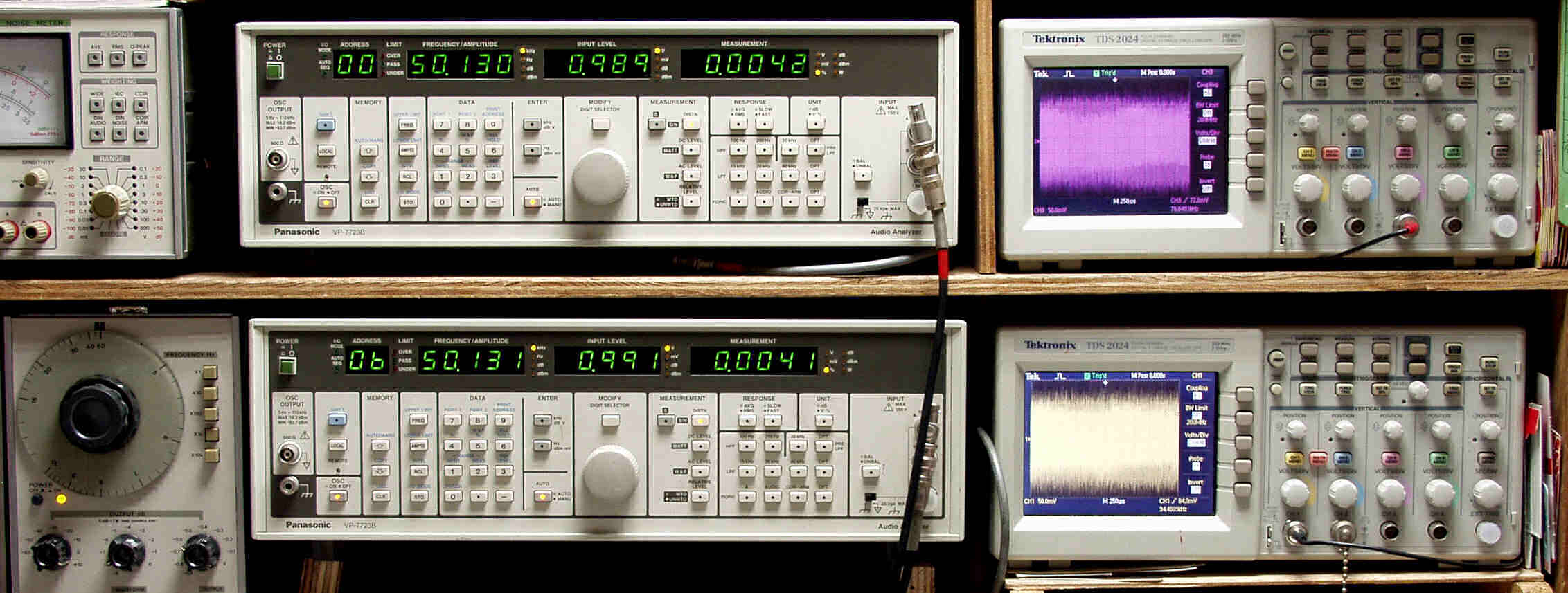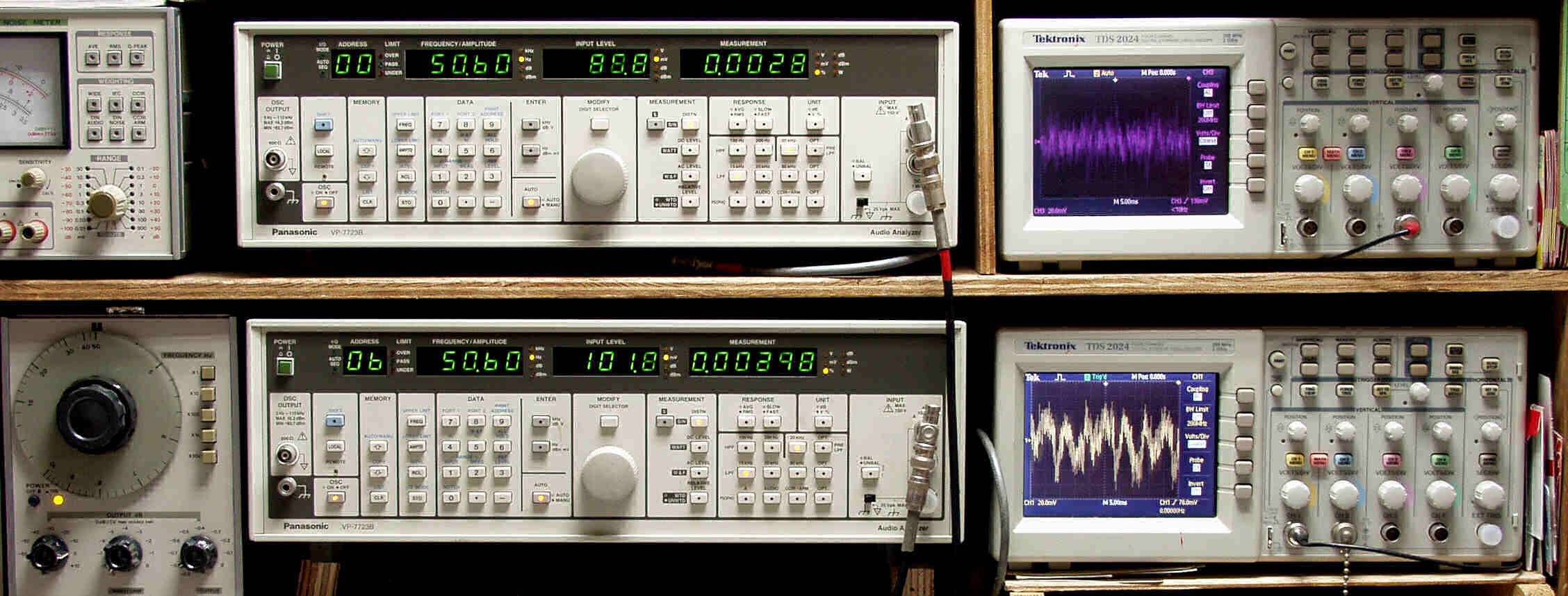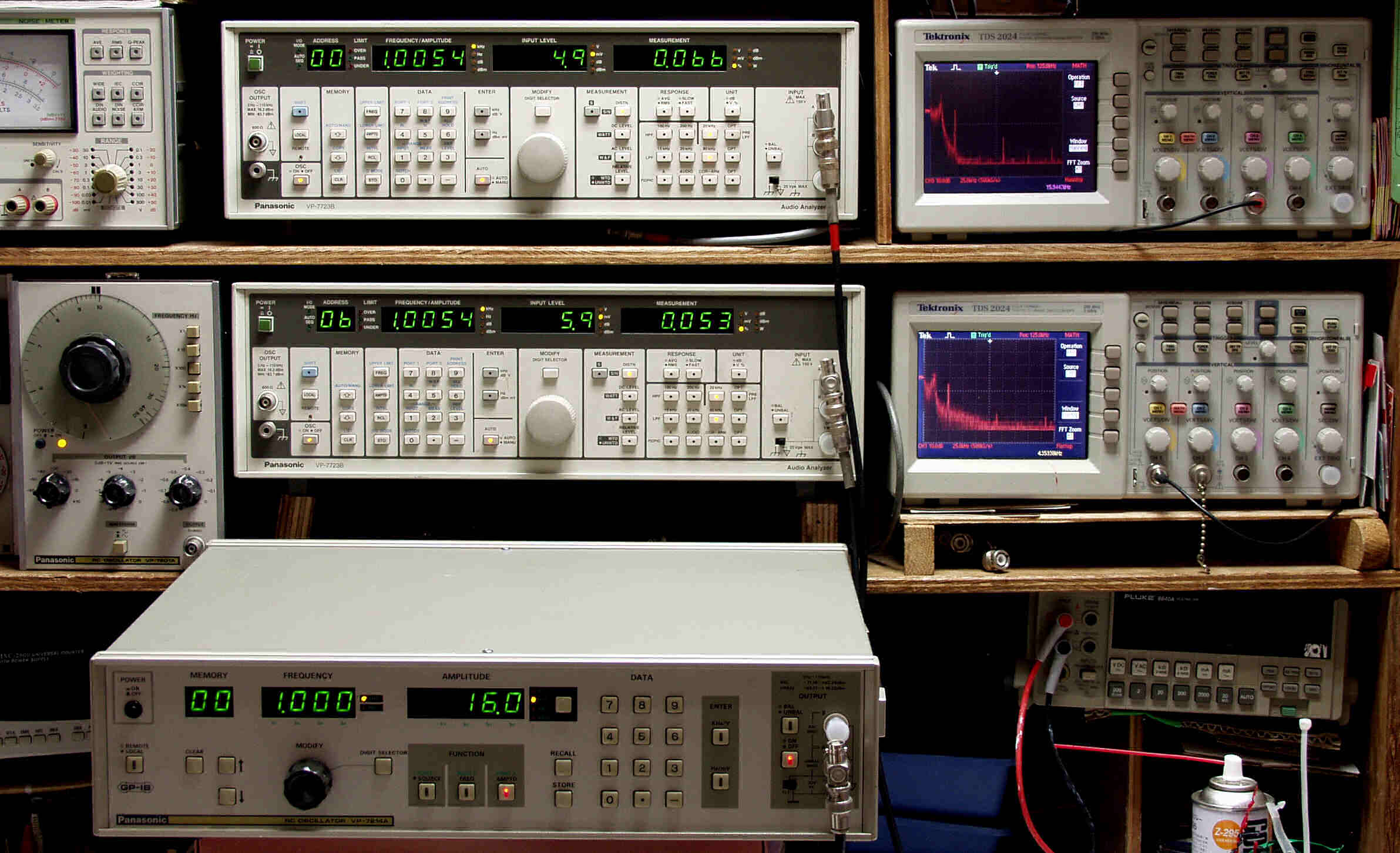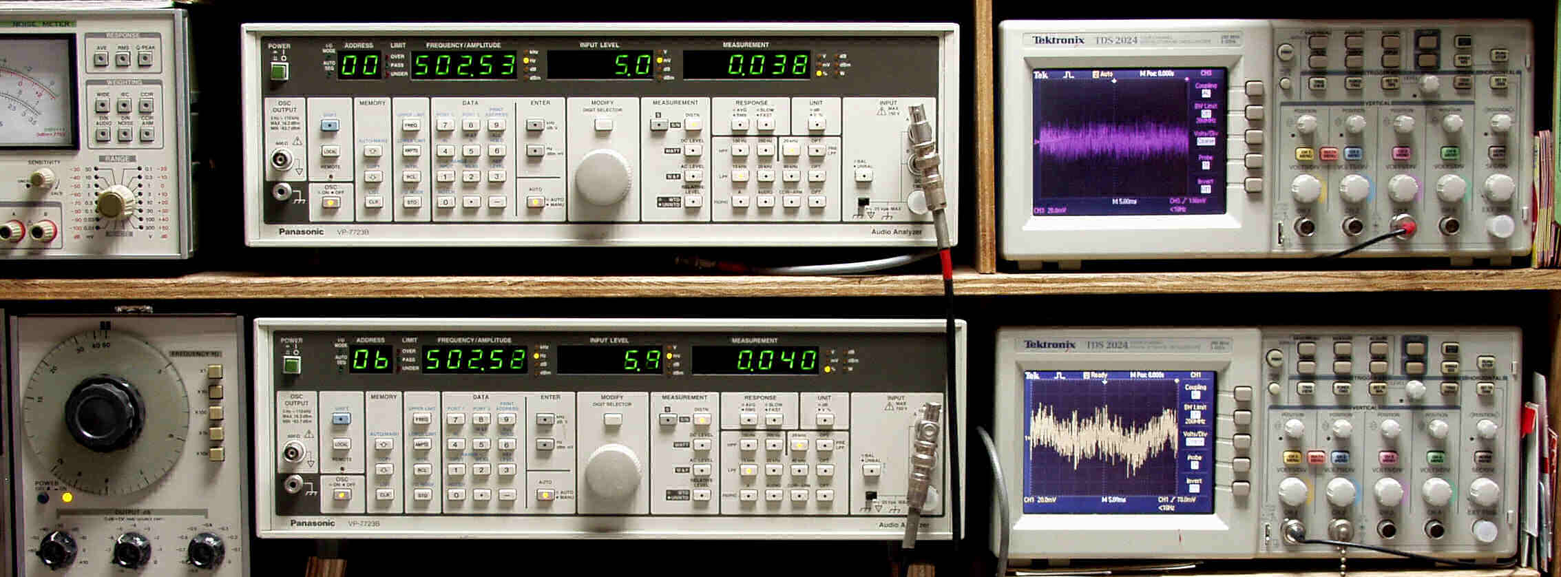 | G. 測定機器の出力・歪み率測定。最新の測定方法はこちら。 「見方」。 上段中央オーディオアナライザ VP−7723B=R側測定。LED表示は右から、「歪み率」、「SP出力電圧」、「周波数」。 下段中央オーディオアナライザ VP−7723B=L側測定。LED表示は右から、「歪み率」、「SP出力電圧」、「周波数」。 上段右端オシロ TDS−2024=R側歪み出力波形表示。 下段右端オシロ TDS−2024=L側歪み出力波形表示。 下段左端 オーディオ発振器 VP−7201A より50Hz〜50kHzの信号を出し(歪み率=約0.003%)、 ATT+分配器を通し測定する。 よって、発振器ダイアル設定出力レベルより低くなります。 AUXレベル100mV=CD、Tuner、Radio、Tape入力等のレベル。 MMレベル5mV =PonoMMカートリッジのレベル。 VV−AMP1V=真空管メインAMPや大型AMPのレベル。 |