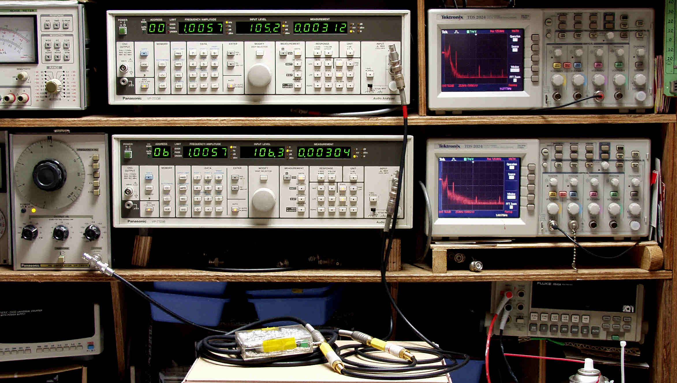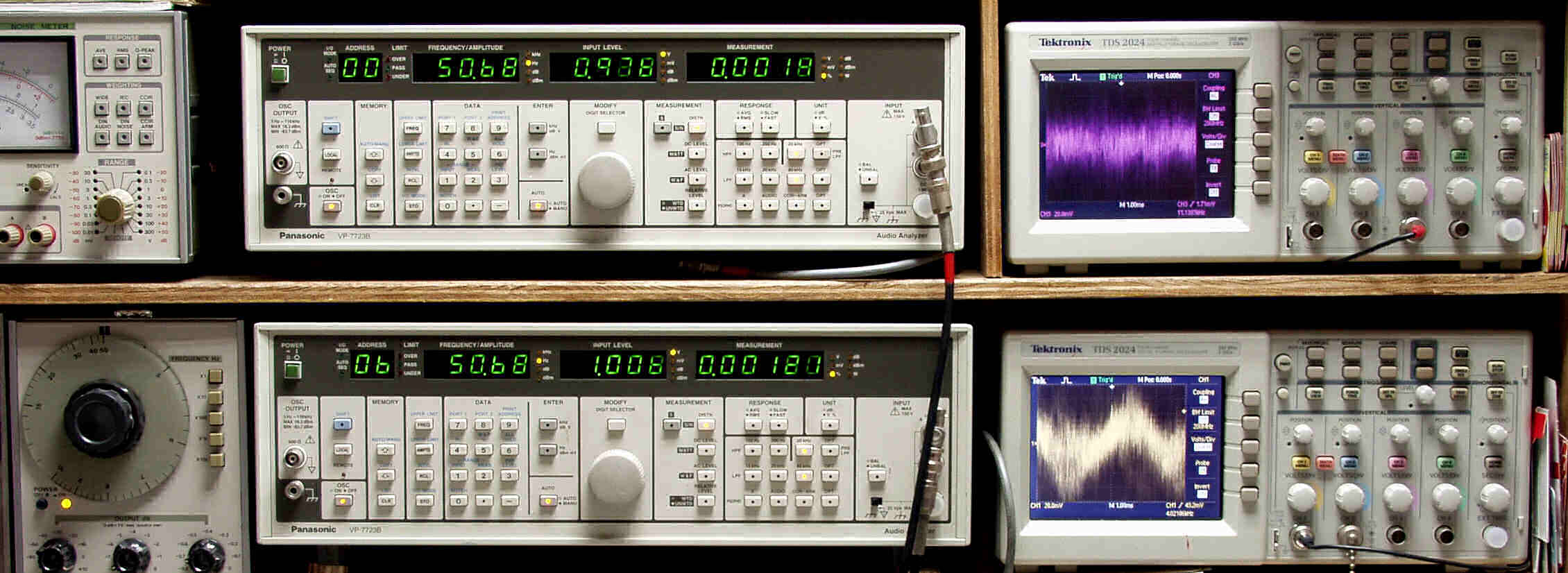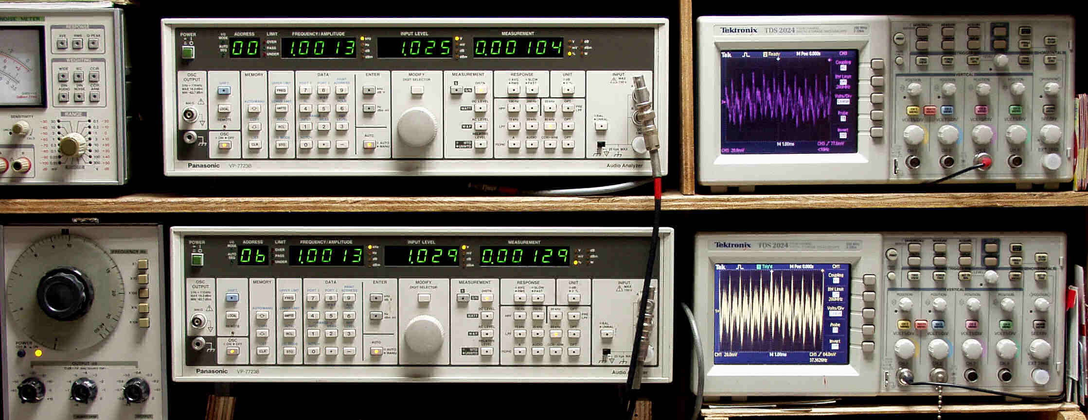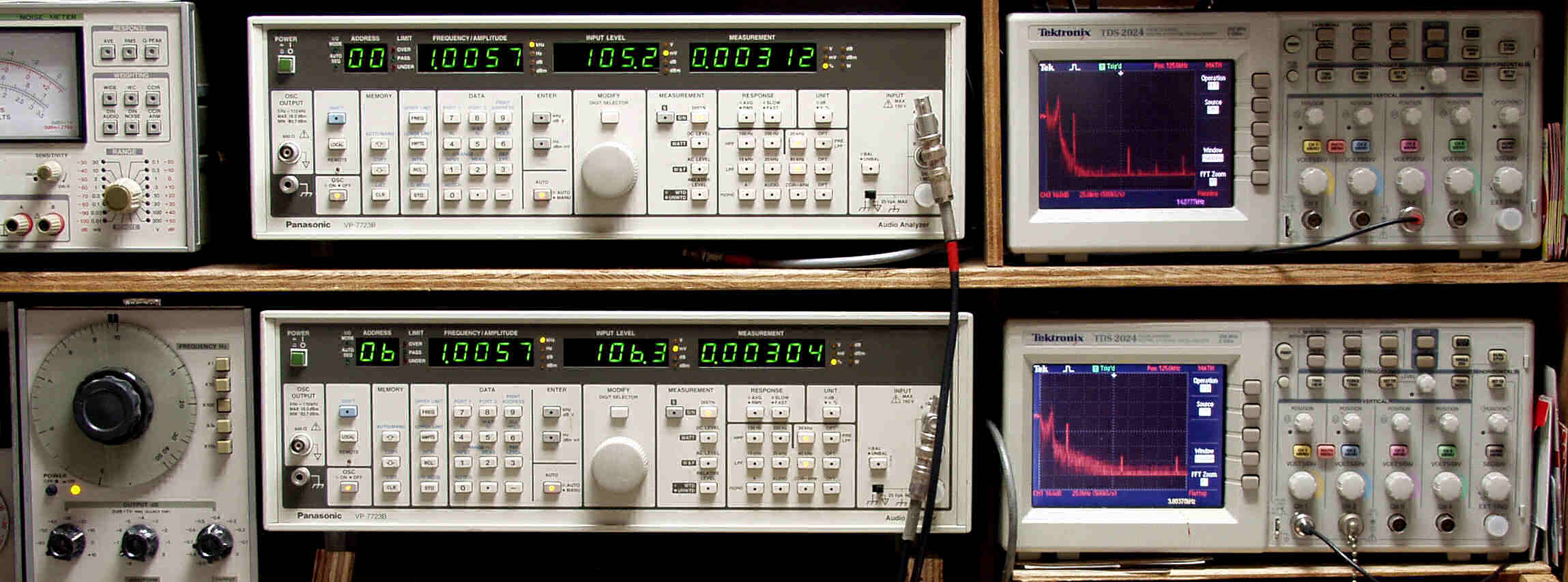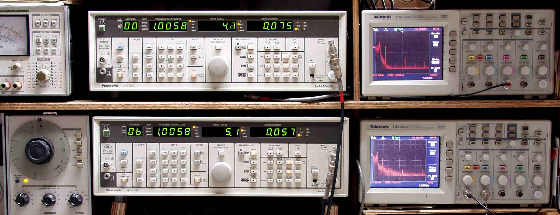 | G. 測定機器の出力・歪み率測定。最新の測定方法はこちら。 「見方」。 上段中央オーディオアナライザ VP−7723B=R側測定。LED表示は右から、「歪み率」、「SP出力電圧」、「周波数」。 下段中央オーディオアナライザ VP−7723B=L側測定。LED表示は右から、「歪み率」、「SP出力電圧」、「周波数」。 上段右端オシロ TDS−2024=R側歪み出力波形表示。 下段右端オシロ TDS−2024=L側歪み出力波形表示。 下段左端 オーディオ発振器 VP−7201A より50Hz〜50kHzの信号を出し(歪み率=約0.003%)、 ATT+分配器を通し測定する。 よって、発振器ダイアル設定出力レベルより低くなります。 AUXレベル100mV=CD、Tuner、Radio、Tape入力等のレベル。 MMレベル5mV =PonoMMカートリッジのレベル。 VV−AMP1V=真空管メインAMPや大型AMPのレベル。 |