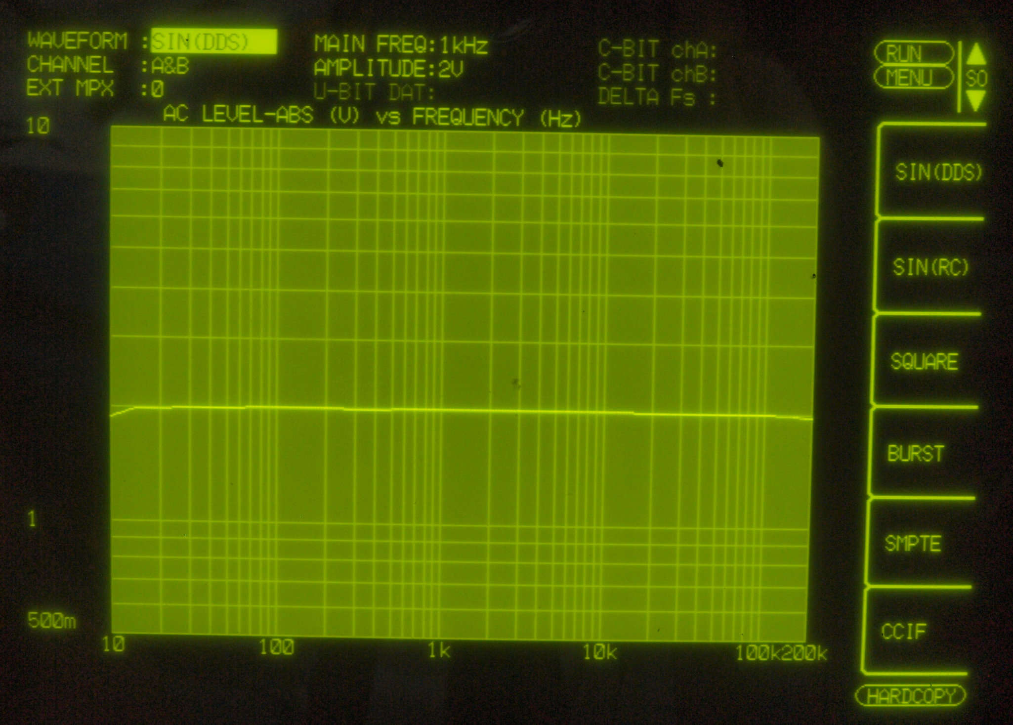 | E. 内蔵発振器の測定(アナライズ)。 画像をクリックすると、大きく(横幅2050ドット)表示されます。 E11. 内蔵OSC出力=5Hz〜200kHz、2V出力を「レベル測定」する。2Vはプリアンプの出力レベル。 Aチャネル=薄い色、Bチャネル=濃い色。 |