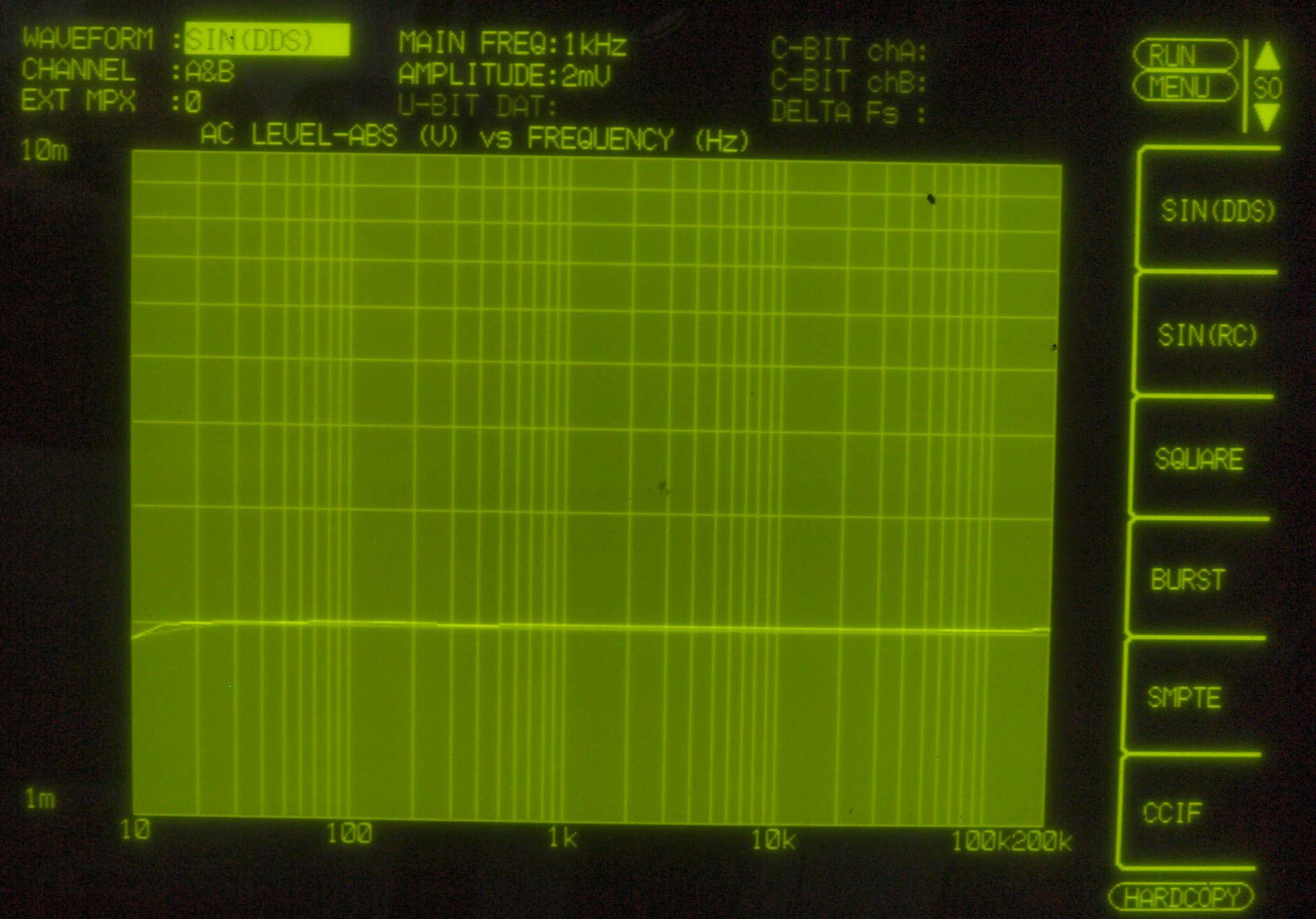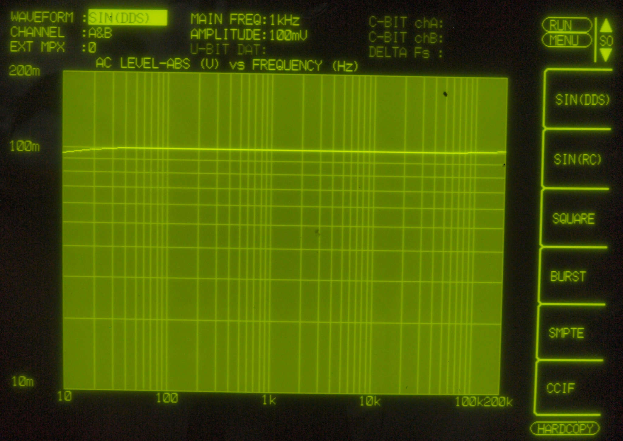 | E13. 内蔵OSC出力=5Hz〜200kHz、2mV出力を「レベル測定」する。2mVはMMの入力レベル。 Aチャネル=薄い色、Bチャネル=濃い色。 |