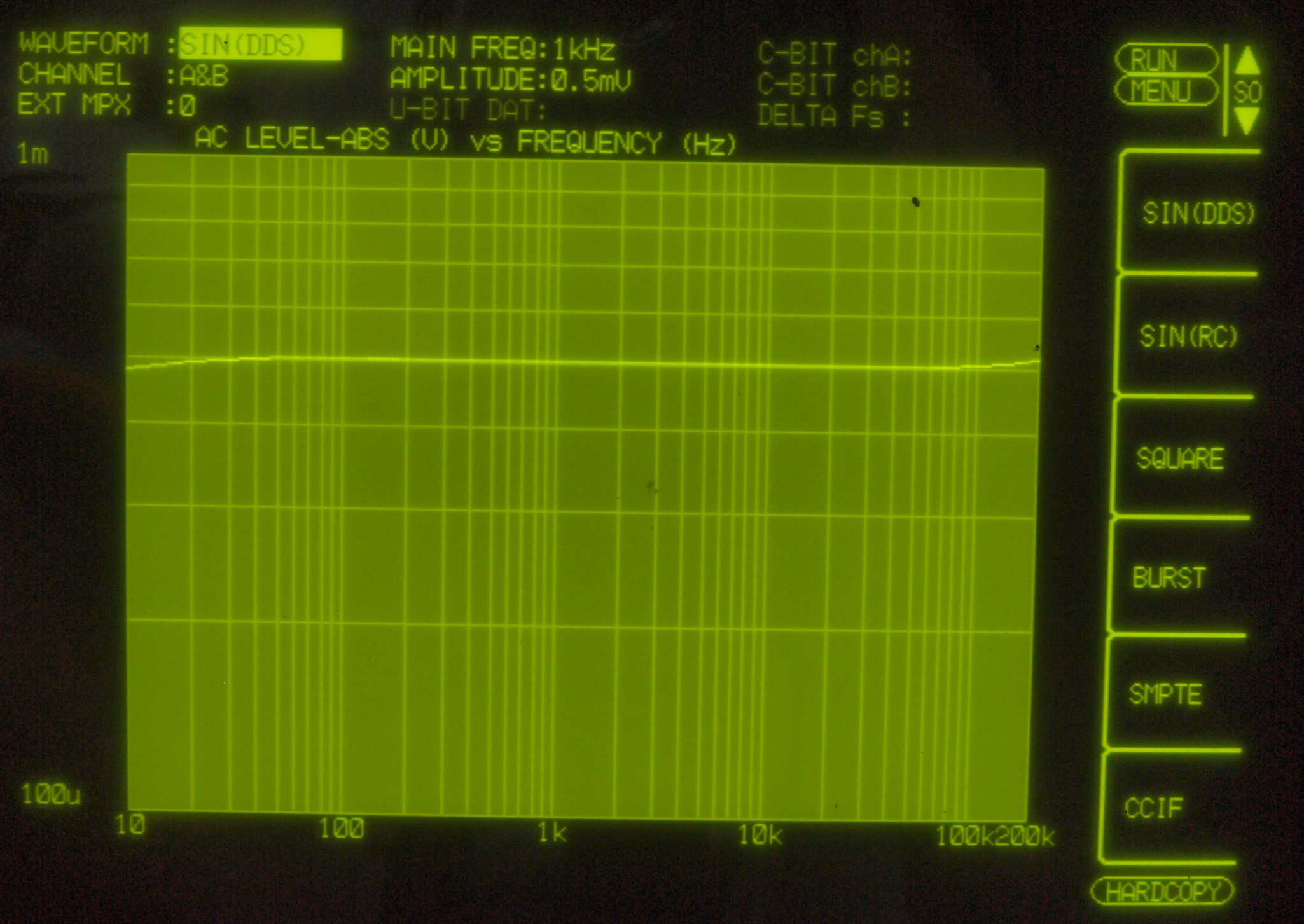 | E14. 内蔵OSC出力=5Hz〜200kHz、0.5mV出力を「レベル測定」する。0.5mVはMC入力レベル。 Aチャネル=薄い色、Bチャネル=濃い色。 |