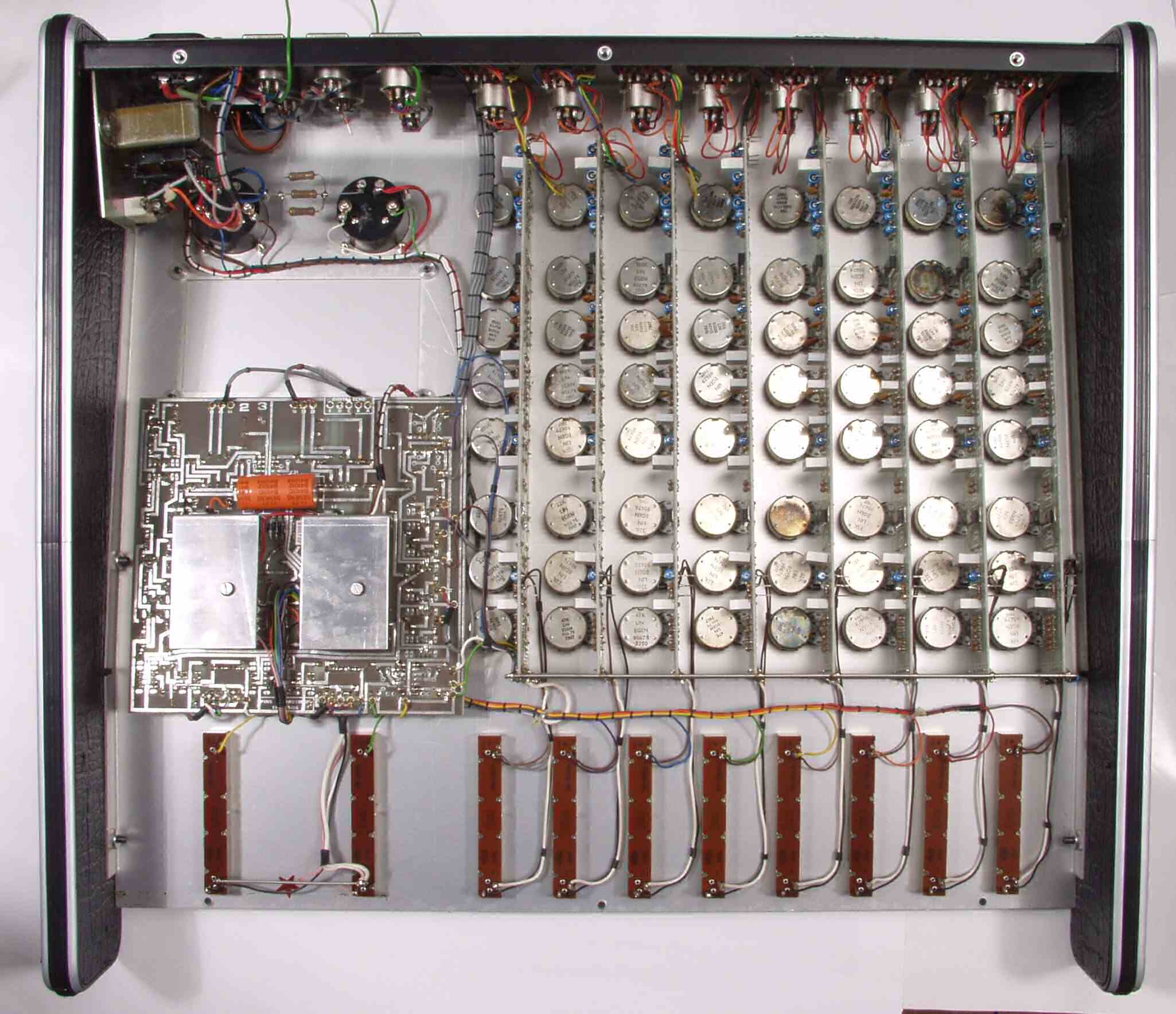 | C−2A.修理前 入力AMP OP−AMP2個、電解コンデンサー8個交換 同じ物が8個有る |