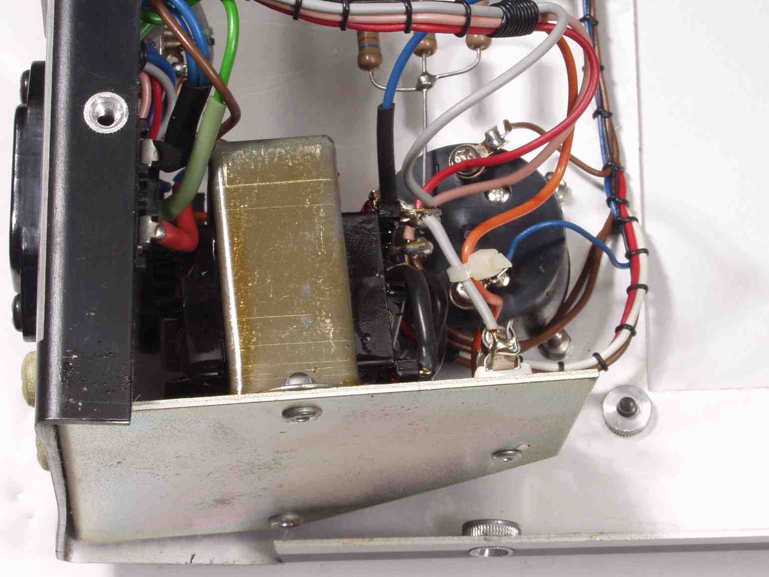 | A−5. 点検中 電源トランスがL型シャーシで片持ちなので、曲がっている。 プロ器への配慮不足! |