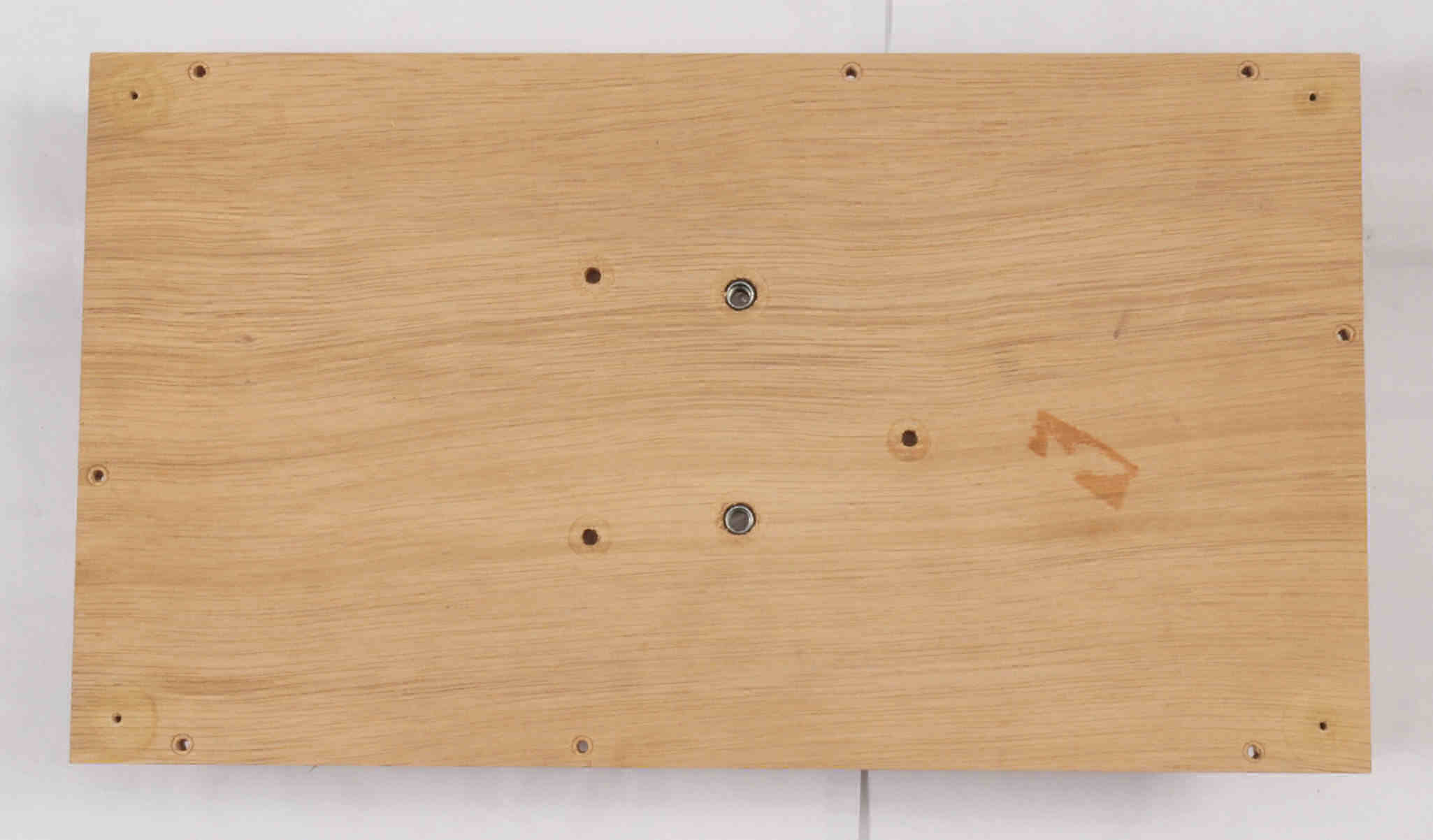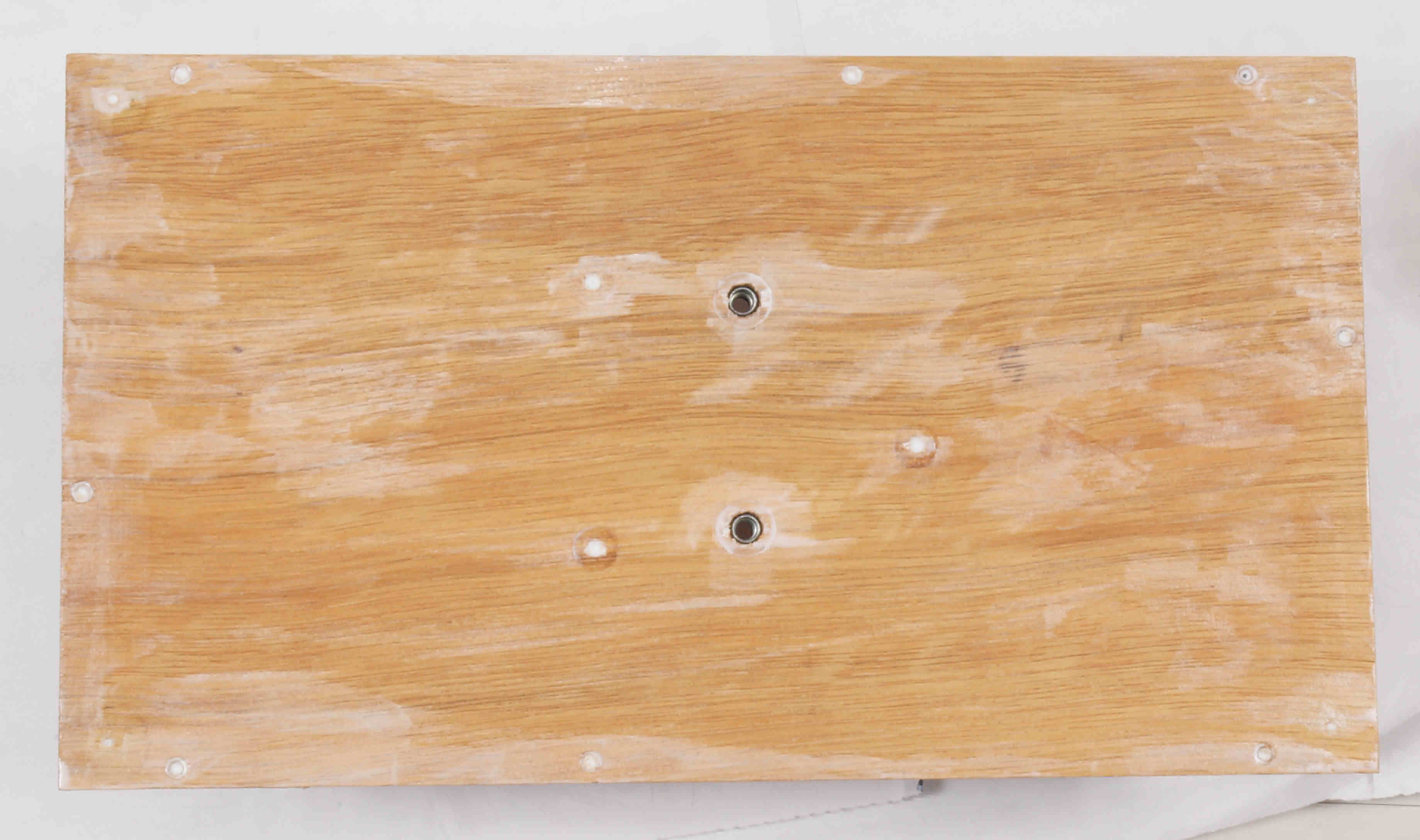 C32. 修理中 接着材が劣化した木箱、下前右から見る。圧縮板にボンドを塗って固めている。