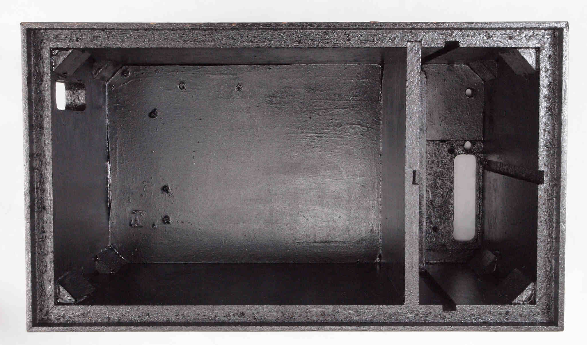 C34. 修理前 接着材が劣化した木箱、下後左から見る。仕切り板が接着されている。