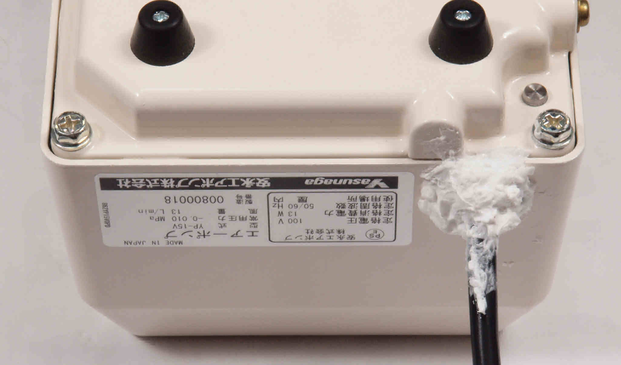 CE2. 修理中 電源コード取出口や底板との隙間にシリコンを詰める。