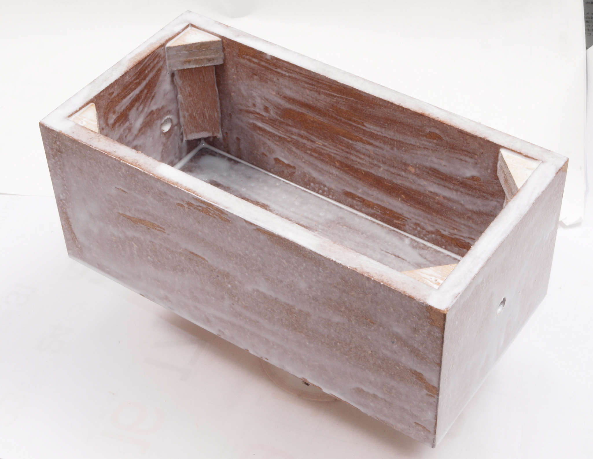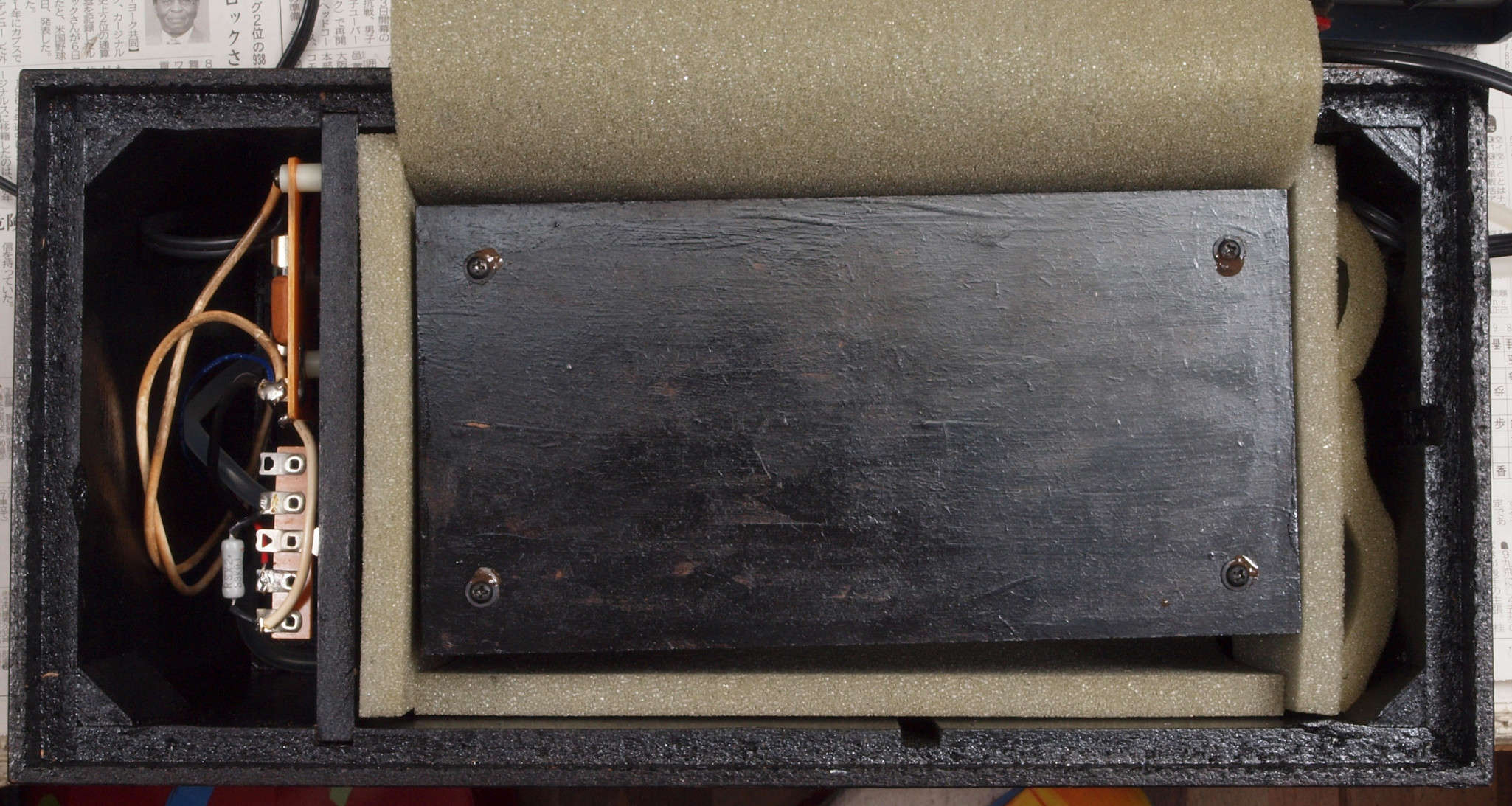 | C95. 修理中 ポンプケース木箱後左。圧縮板にボンドを塗って固める。 |
