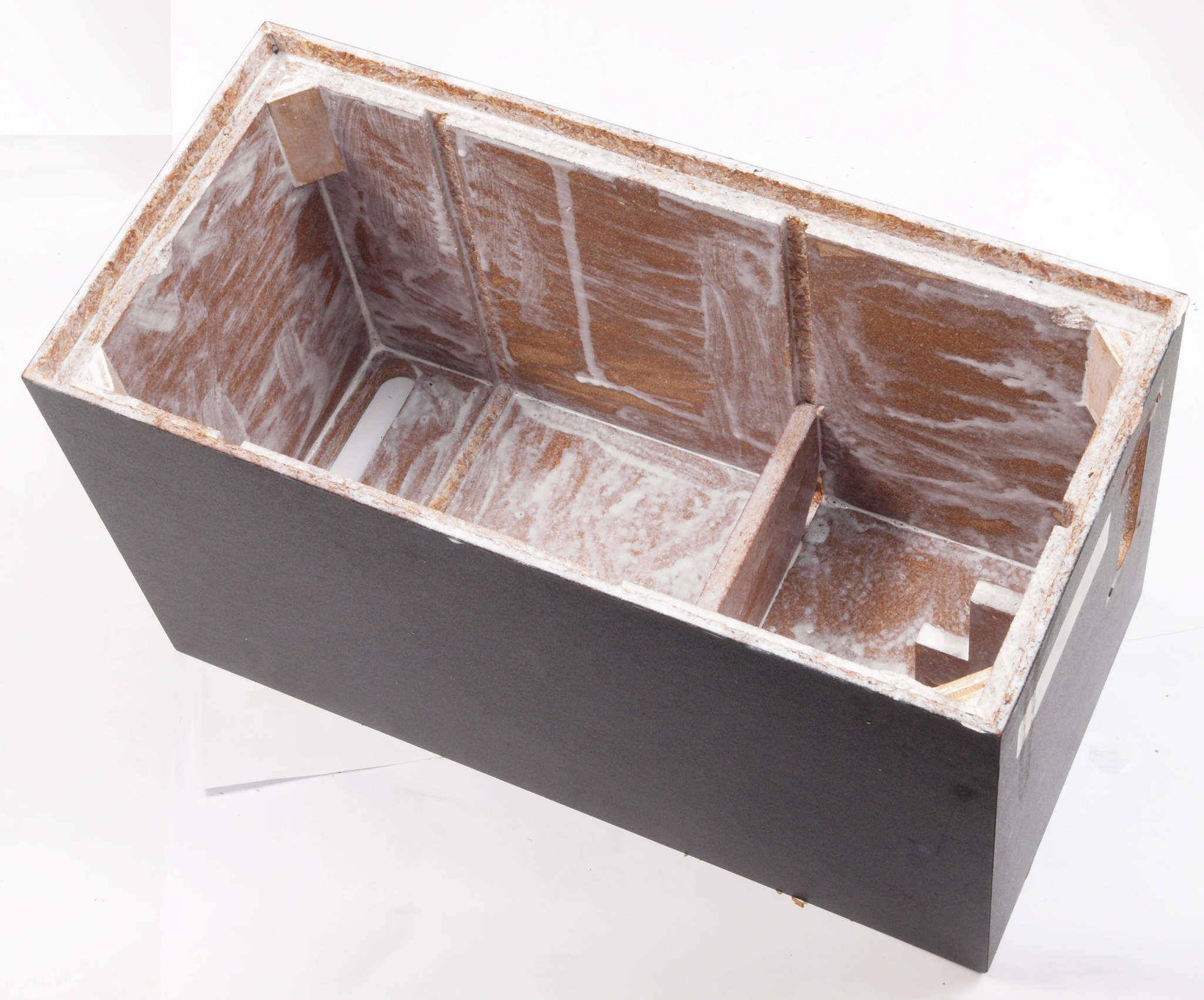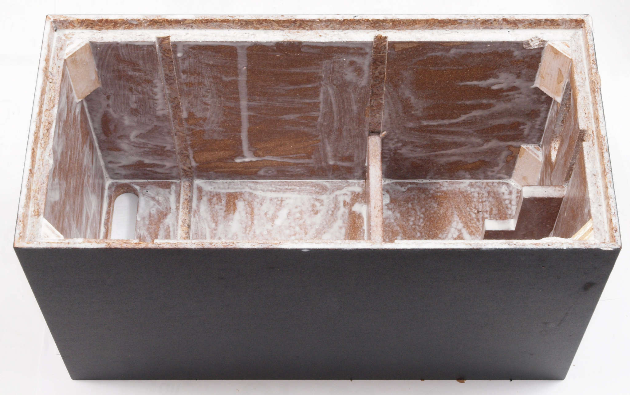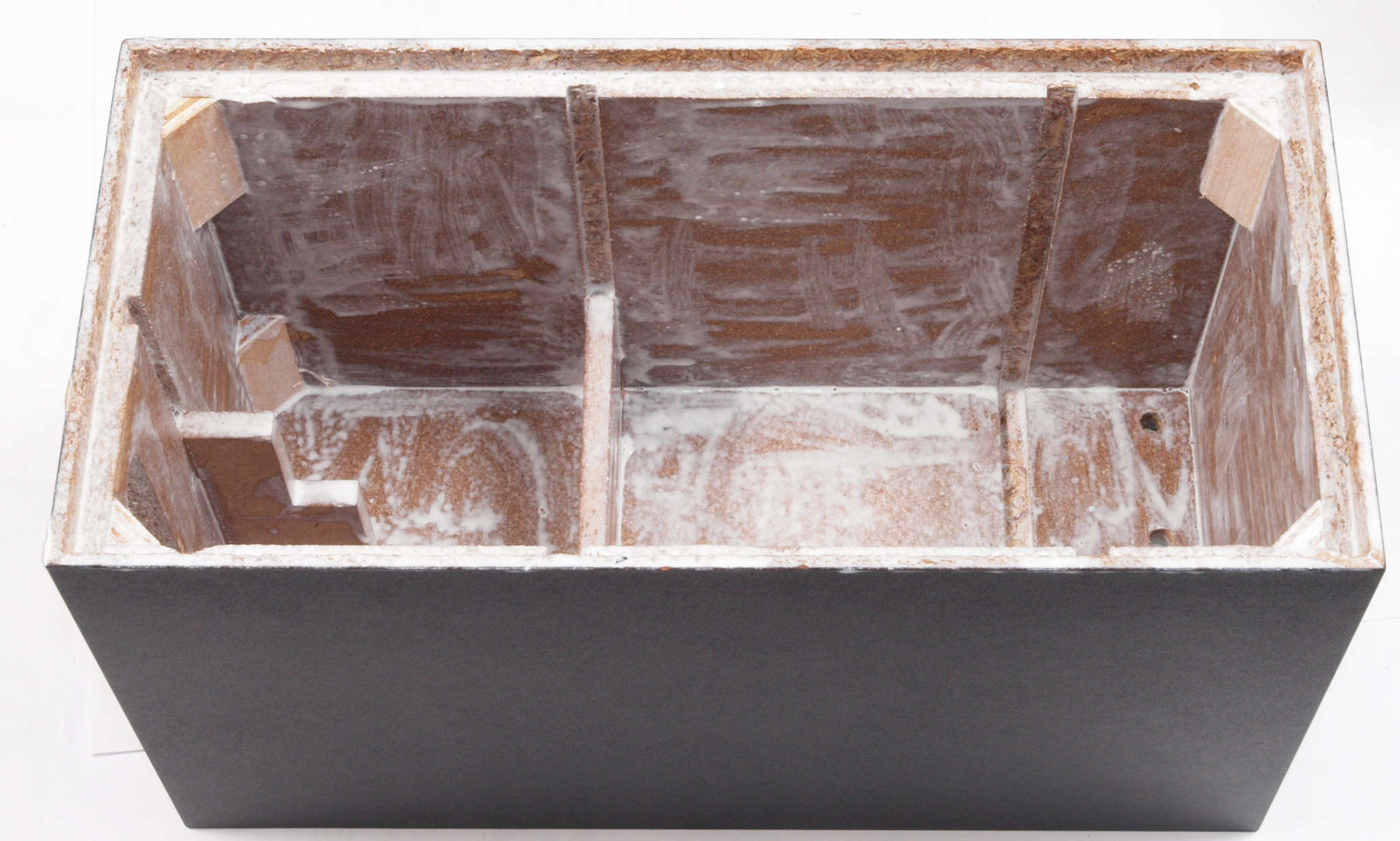 | C34. 修理前 接着材が劣化した木箱。右前内側見る。 |