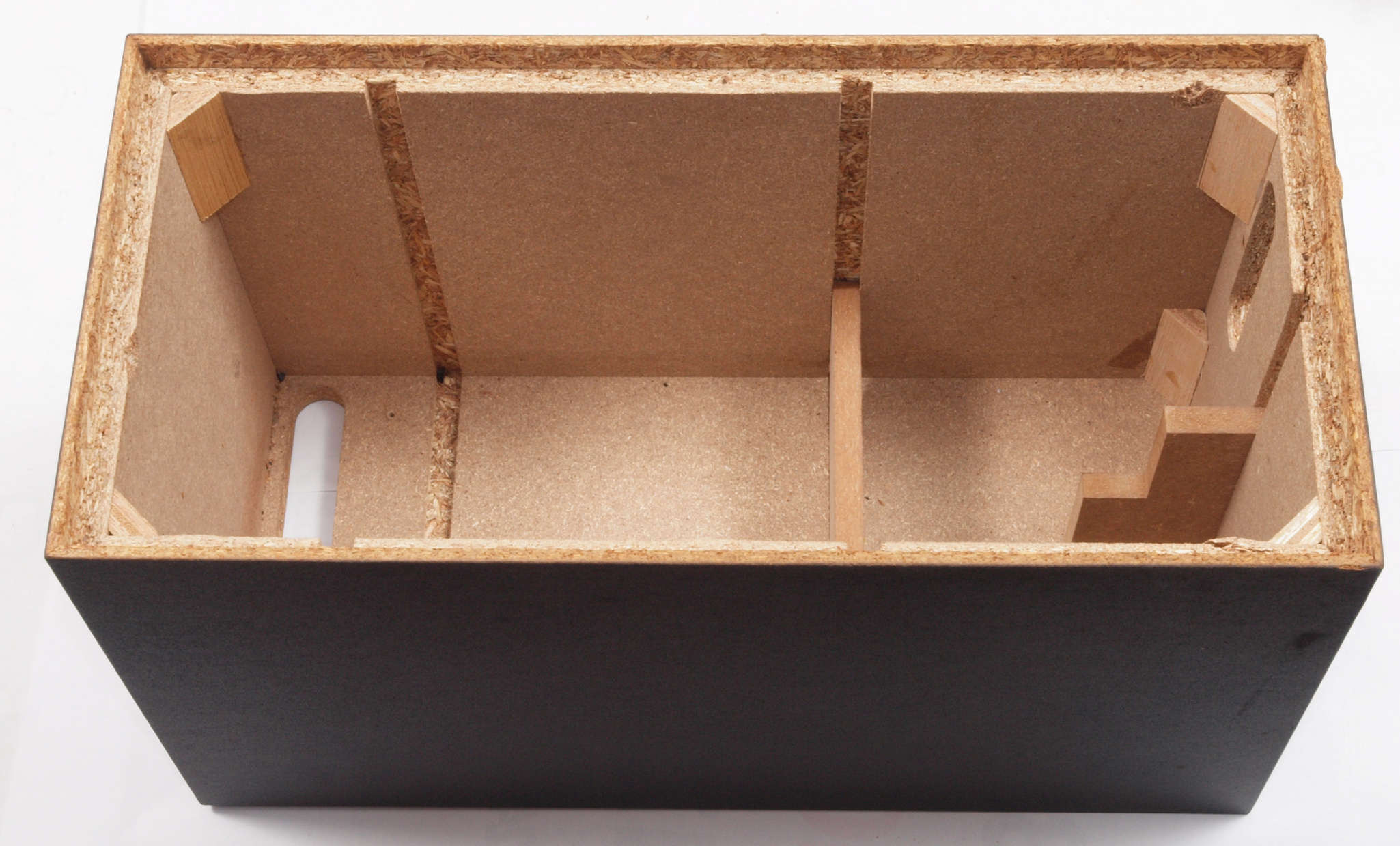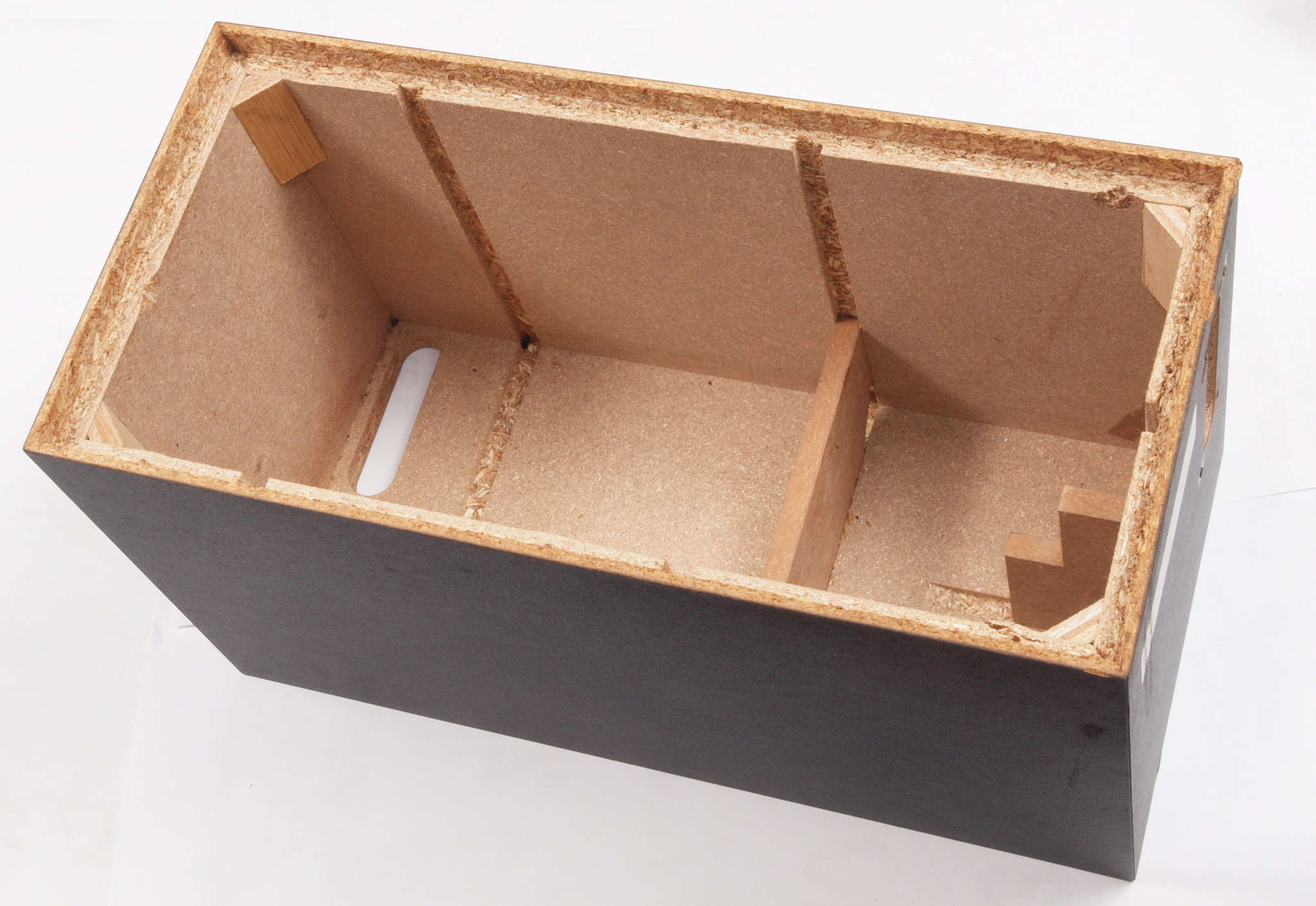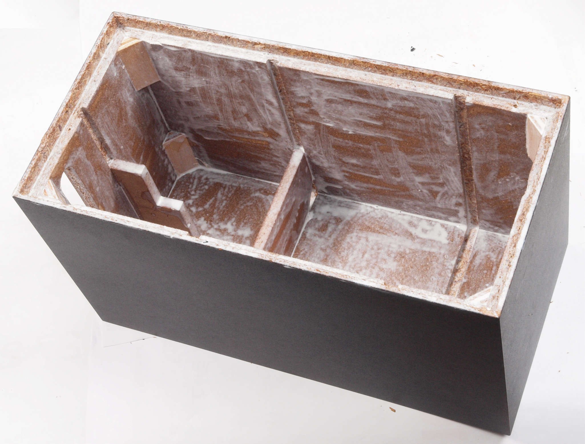 | C34. 修理前 接着材が劣化した木箱。右前内側見る。 |