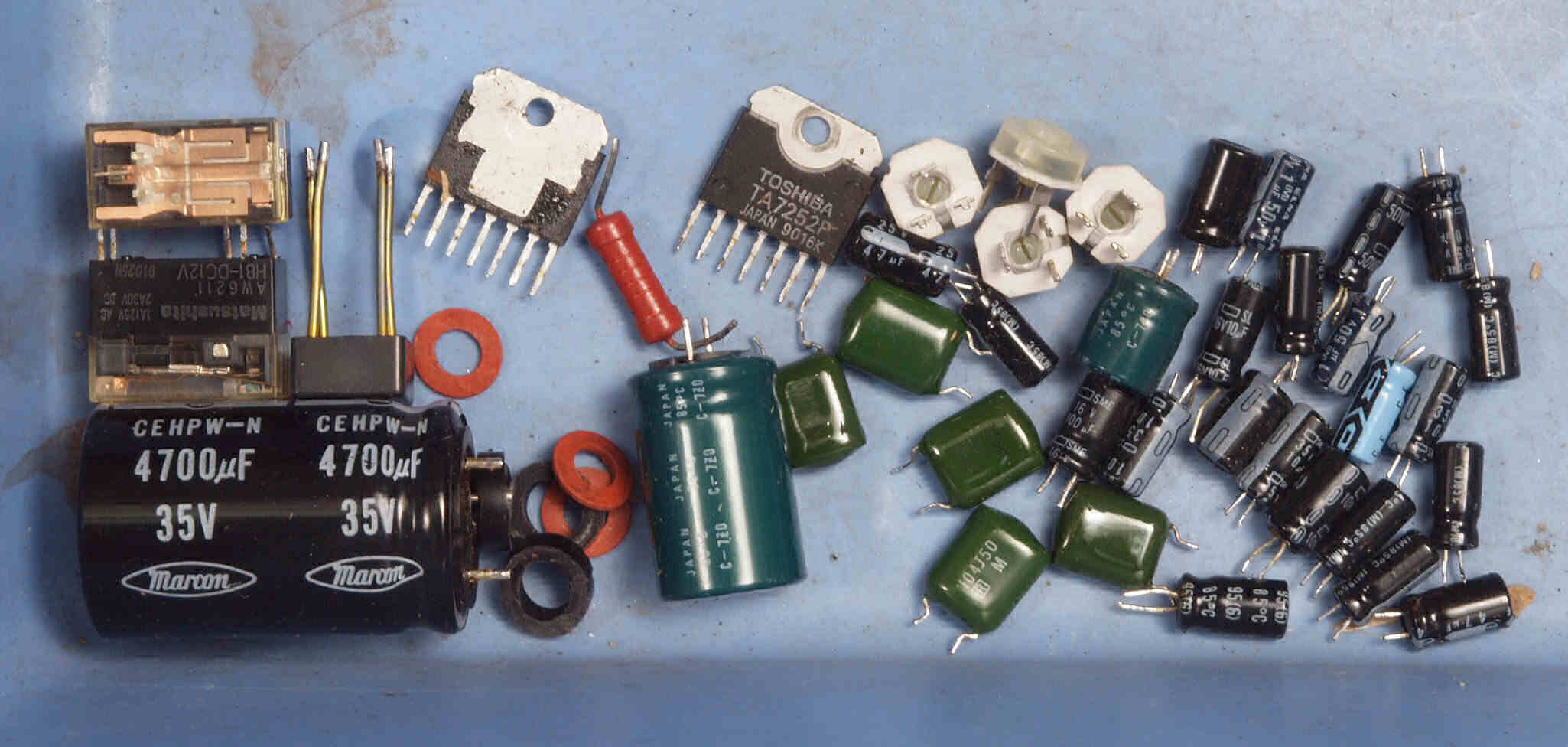 | C92. 交換部品。 熱でビニールが後退し、防爆弁が膨らんだ電解コンデンサー。過電流でヒビが入った整流ブリッジダイオード。 | ||||||||||||||||||||||||||||||||||||||||||||||