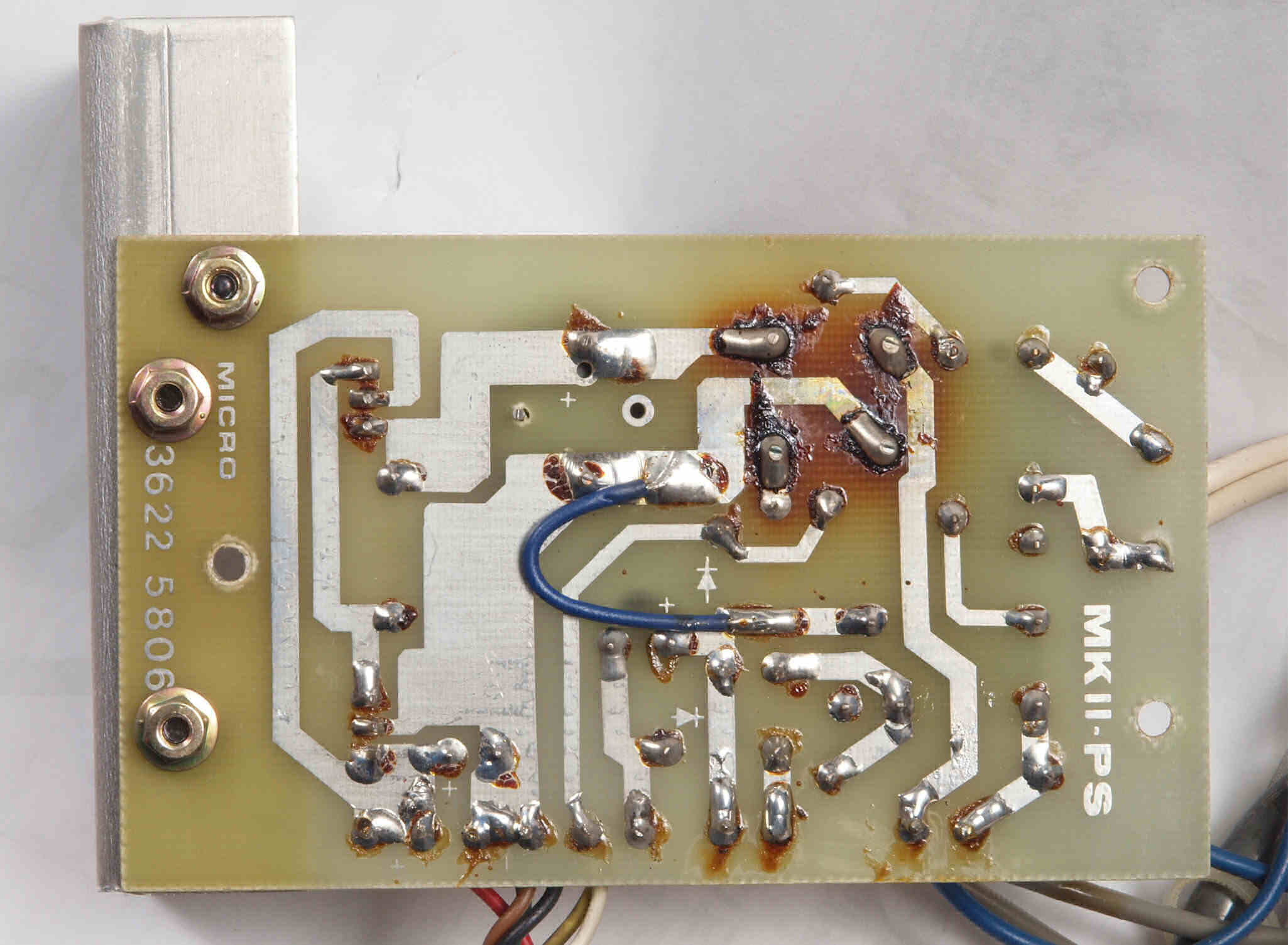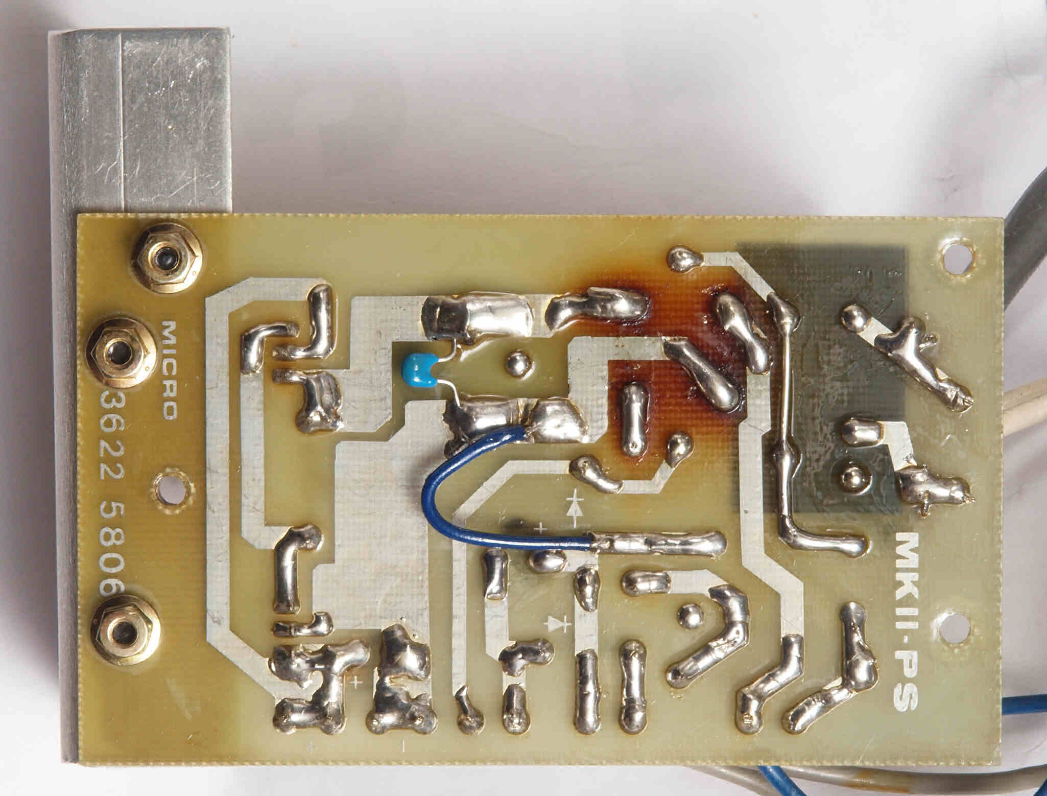 | C112. 修理前 電源部整流基板。 過電流でヒビが入った整流ブリッジダイオード。 | ||||||||||||||||||||||||||||||||||||||||||||||